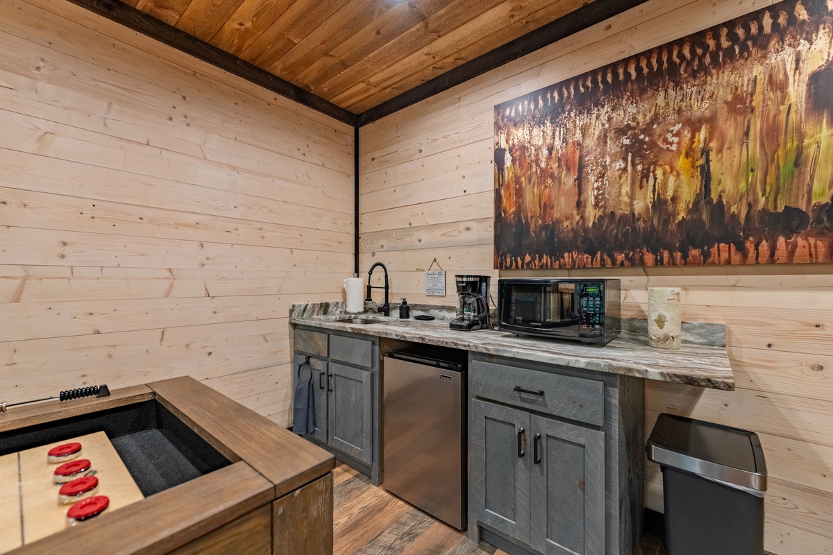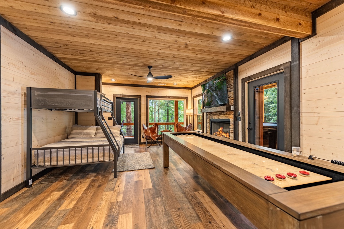 Downstairs, unwind in the game room with a shuffleboard table, multi-game arcade, wet bar, and another fireplace and TV. This level also includes a second king bedroom, full bath with a waterfall shower, twin-over-full bunk, and laundry closet.