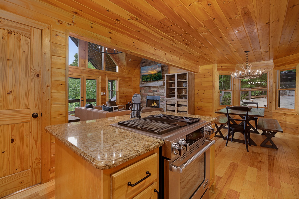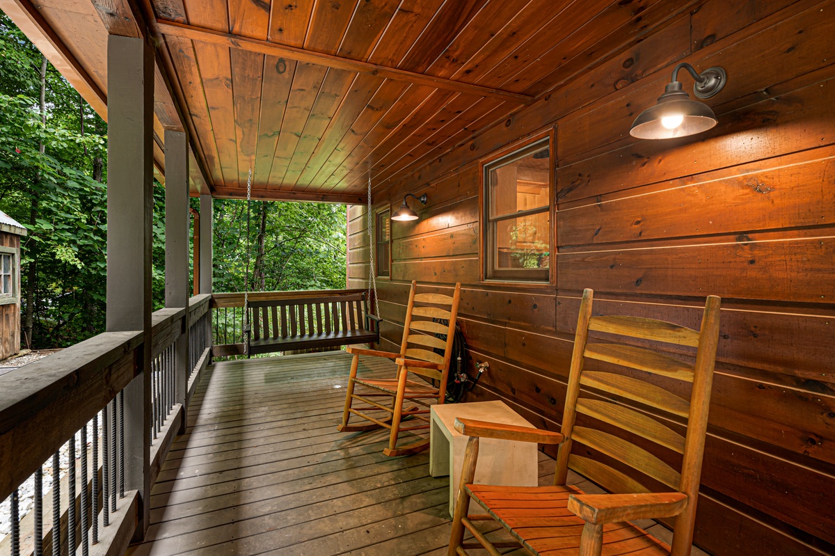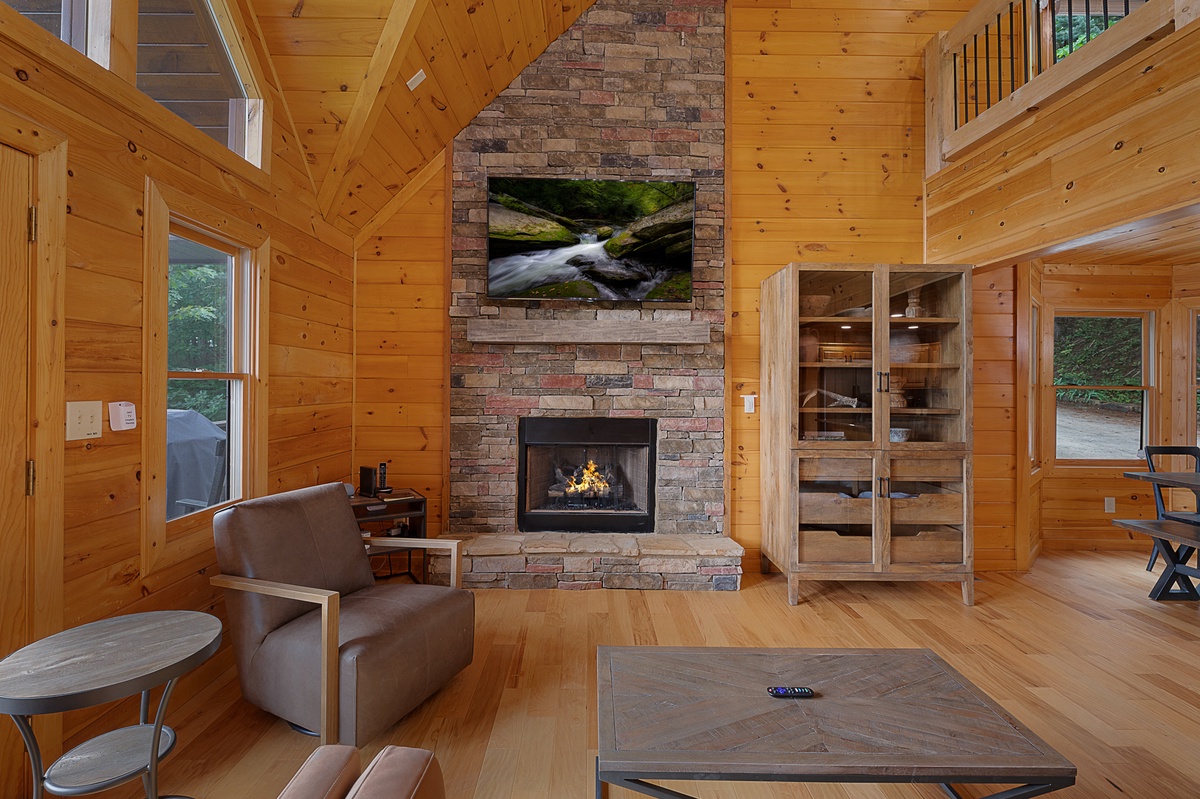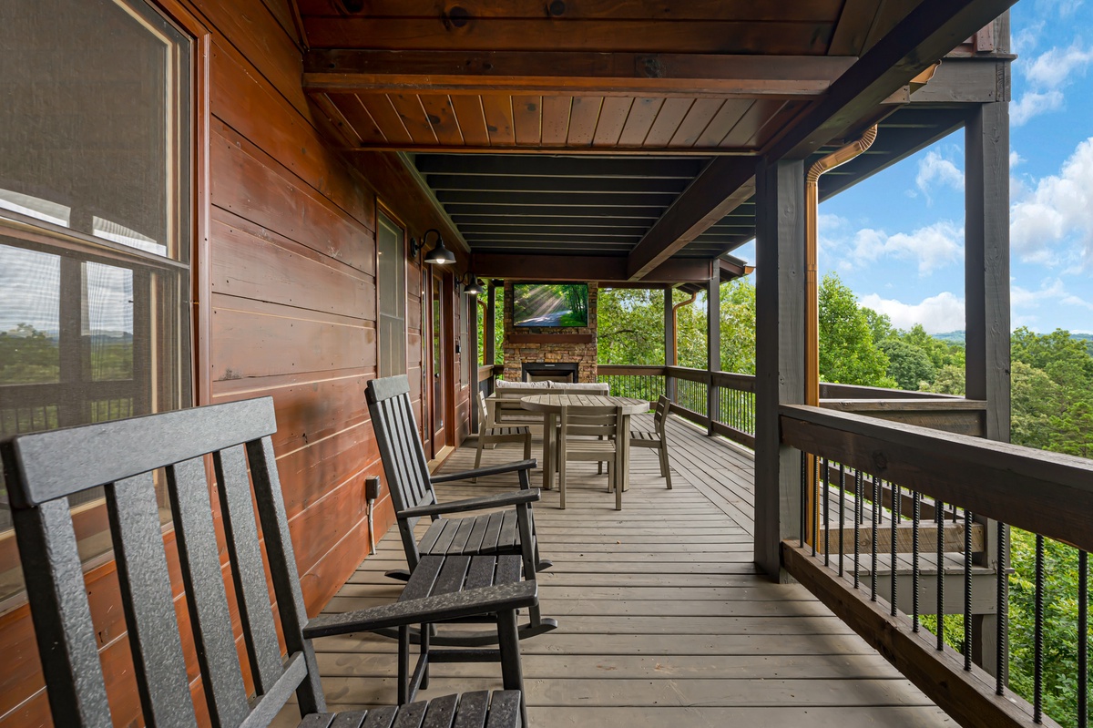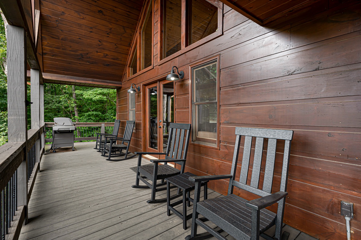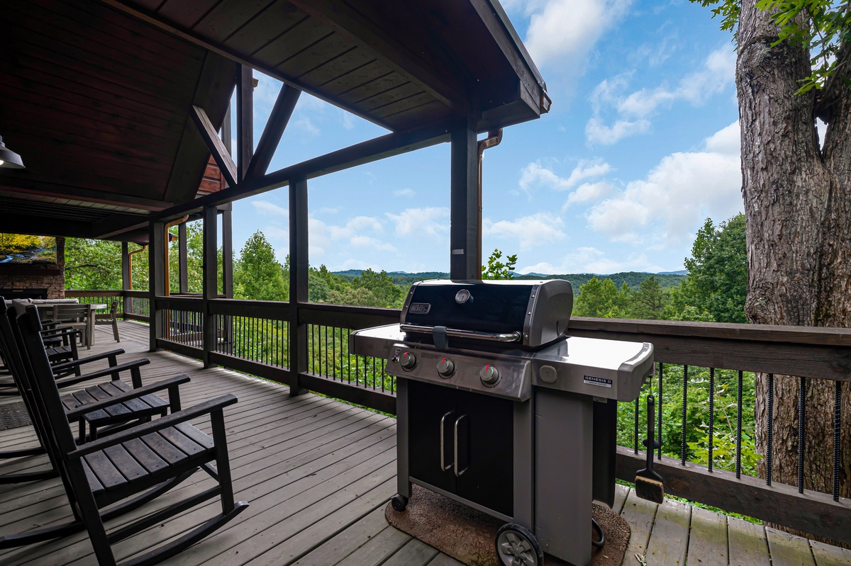 Outside, the cabin offers a seamless blend of indoor and outdoor living. The entry-level deck is an entertainer's paradise, featuring a gas fireplace with comfortable lounge seating and a TV for alfresco movie nights. A gas grill and outdoor dining set allow for delightful meals under the open sky. Rocking chairs invite you to unwind while taking in the full mountain view.
