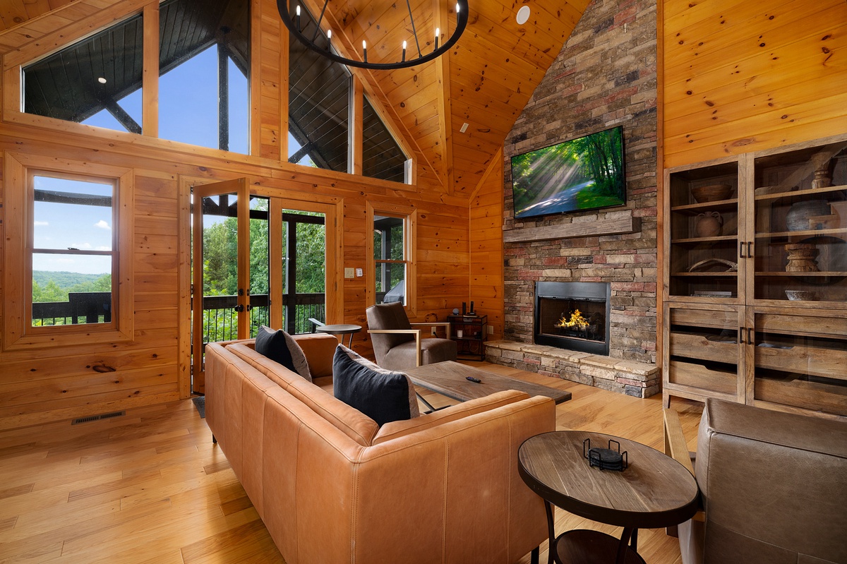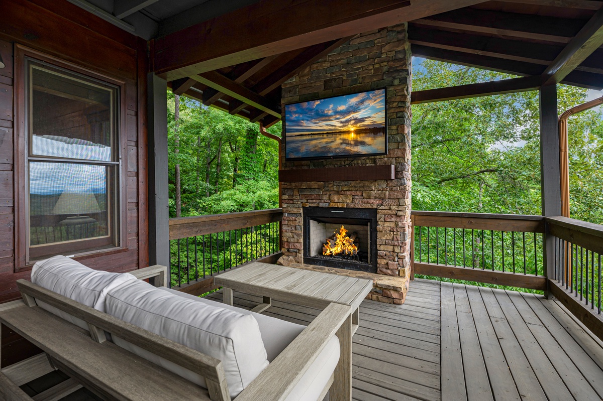 - Gas fireplace with comfortable lounge seating and TV