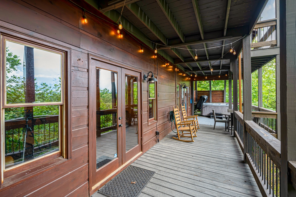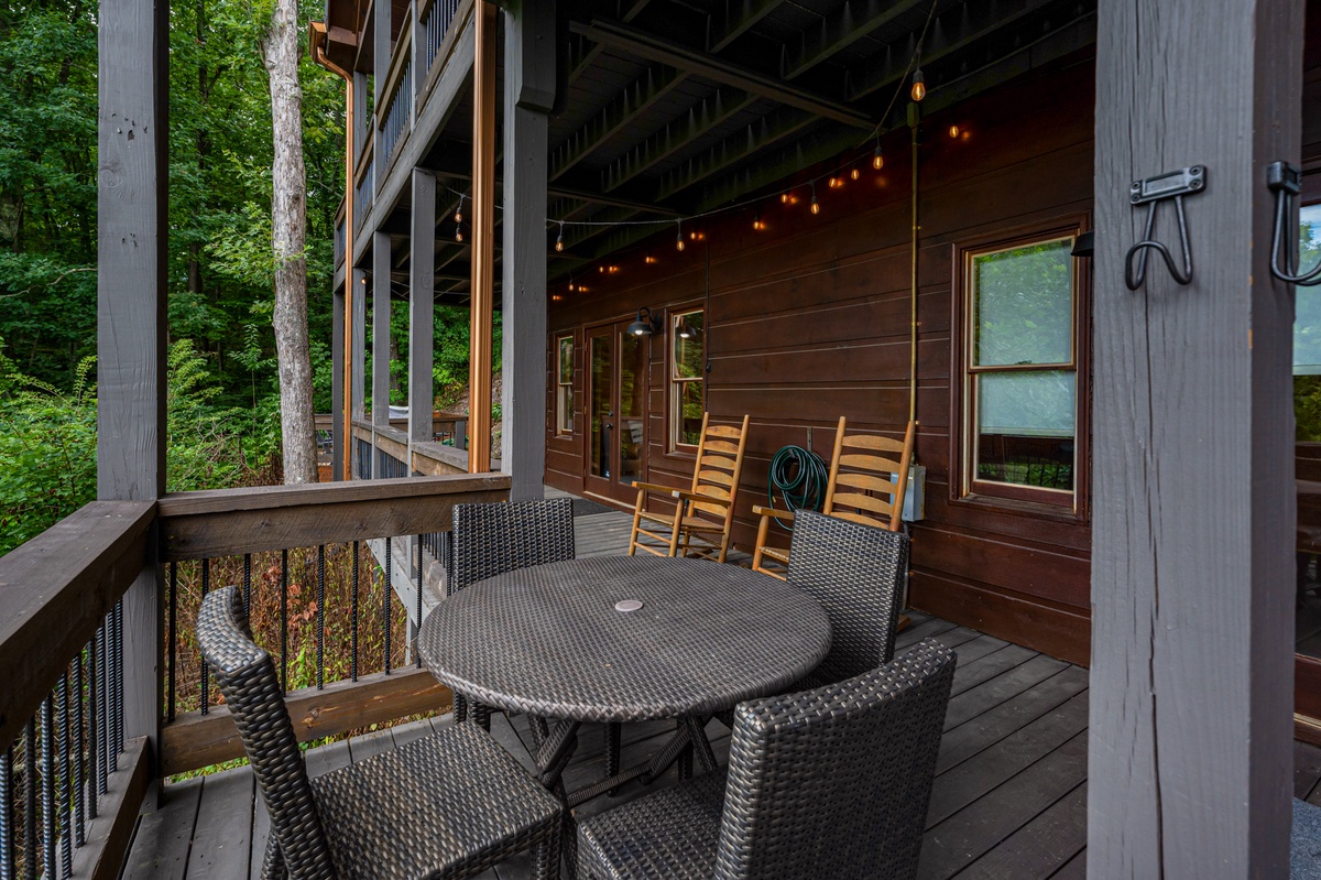The lower-level deck is a sanctuary of relaxation, with a hot tub adorned with string lights, creating an enchanting evening ambiance. Enjoy a morning coffee or evening drink at the table and chairs for four, or simply relax in the rocker chairs. The fire pit, surrounded by Adirondack chairs, beckons you to gather around and share stories under the stars.