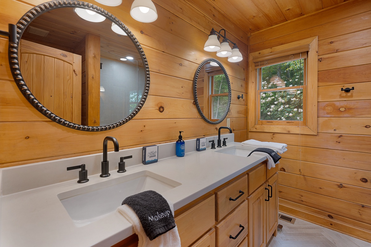 - En Suite bathroom with double vanity and tile shower