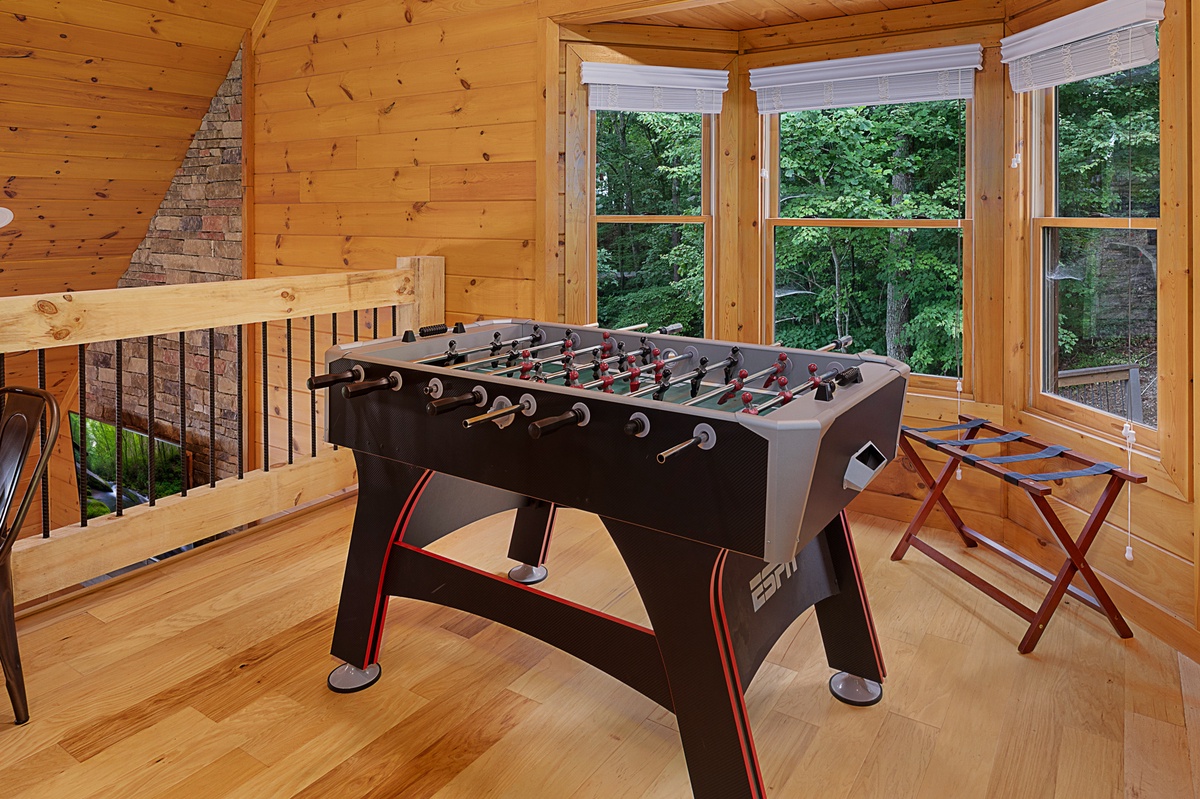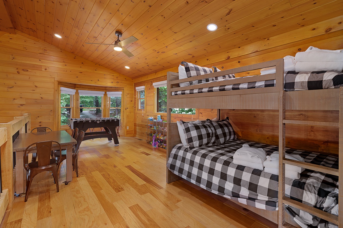 Ascend to the upper level and discover a loft that's perfect for both kids and kids at heart. With full-over-full bunk beds, a TV, children's toys, and a foosball table, this space is a haven of fun and imagination. The primary king suite is a luxurious retreat, complete with a coffee station for your morning rituals. The en suite bathroom features a double vanity and a tile shower for ultimate relaxation. Step out onto the upper-level private balcony, where seating invites you to savor panoramic mountain views.