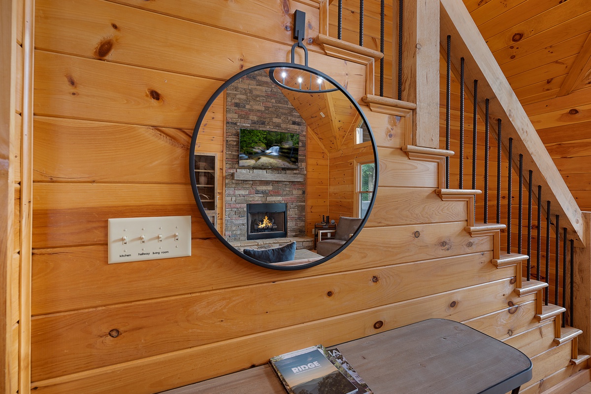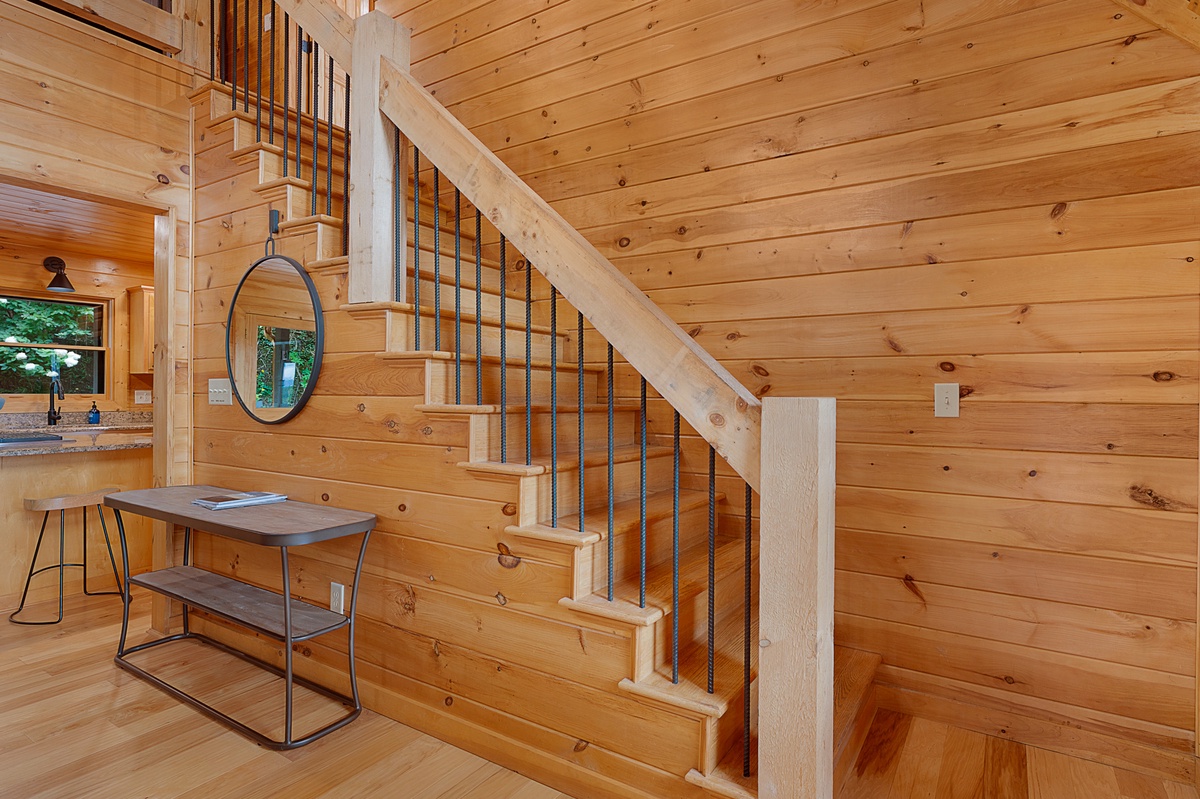 Inside, the cabin is a haven of relaxation and entertainment. The entry level welcomes you with an inviting living room featuring a cozy gas fireplace, perfect for those chilly mountain evenings. Enjoy delightful meals at the elegant dining table or the fully equipped kitchen with bar seating, where culinary dreams come true. The entry level also features a shared bathroom with a convenient laundry closet, ensuring all the comforts of home. The spacious king bedroom on this level opens to a deck, allowing you to step outside and breathe in the crisp mountain air.