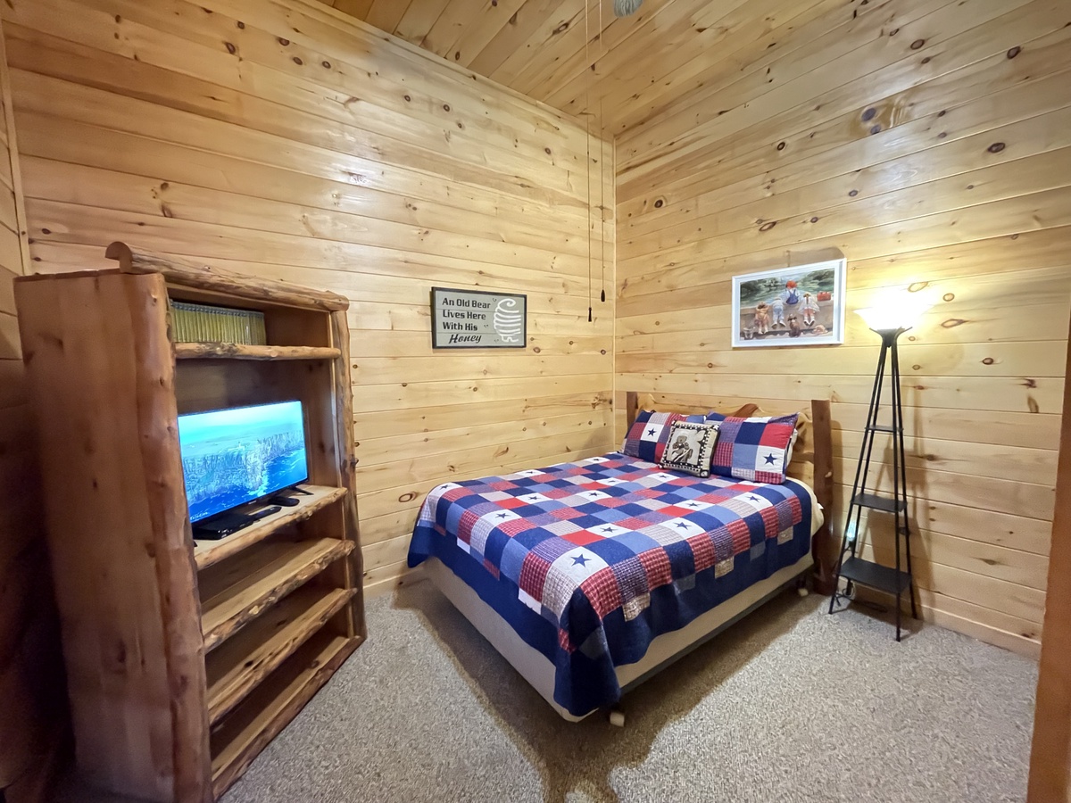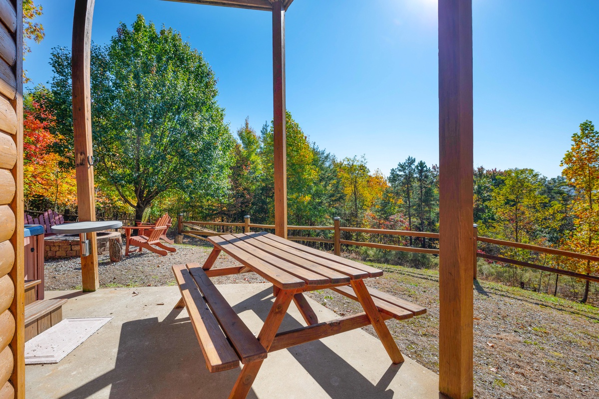Through the entertainment room, find a queen bedroom with a new twin over twin bunk bed and a shared full bathroom. No need to head back upstairs yet. On the patio outside find a full size picnic table, hot tub, fire pit and small yard area.