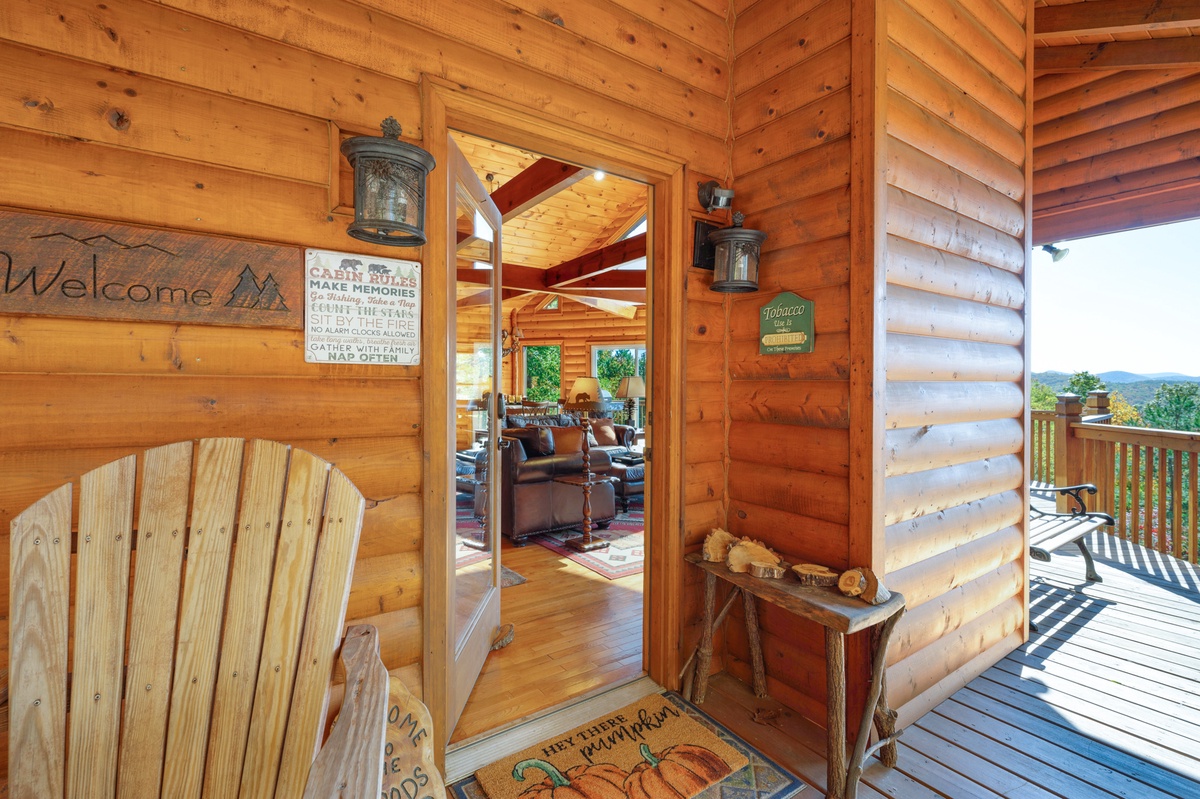 Feel the excitement while walking toward the front entrance with wide eyes glaring at the mountain tops immediately after stepping up to the partially wrapped porch. Passing a custom porch swing on the right as well as rocking chairs waiting to be occupied. Relaxation greets smiling faces as the front door swings into a large open floor plan with a common, dining and kitchen area.