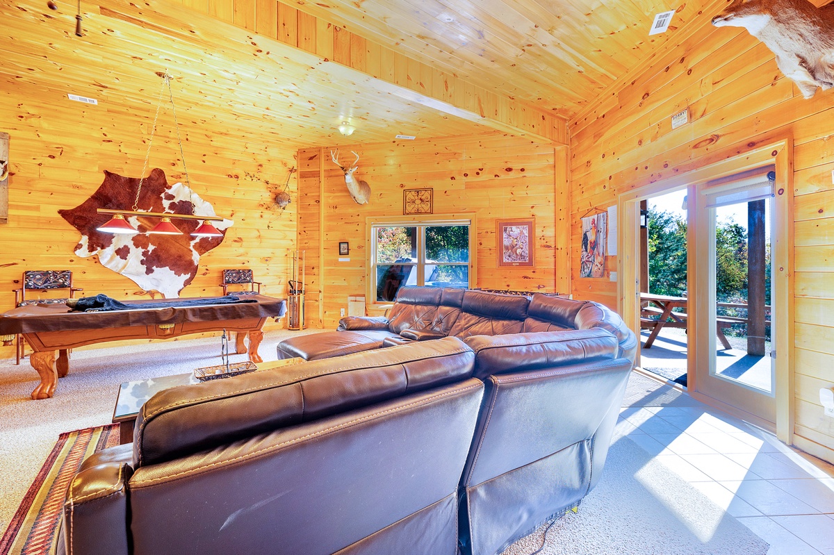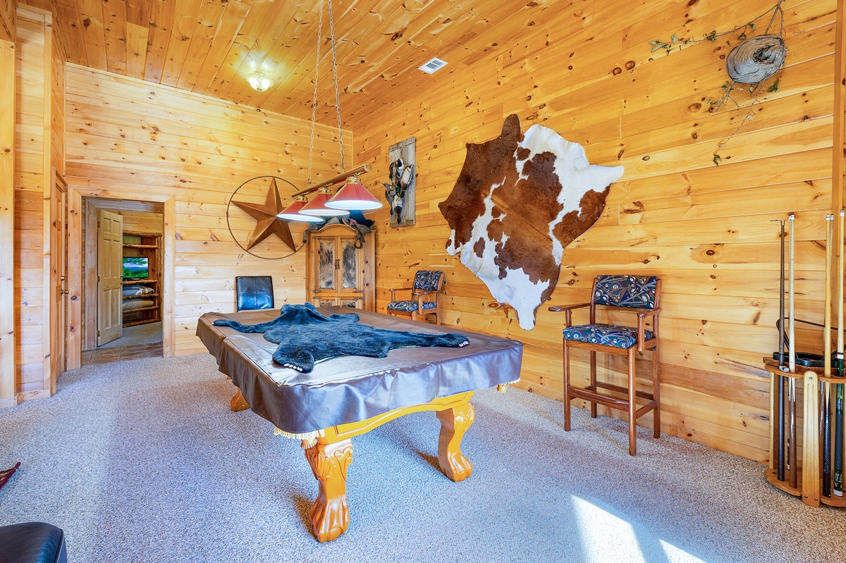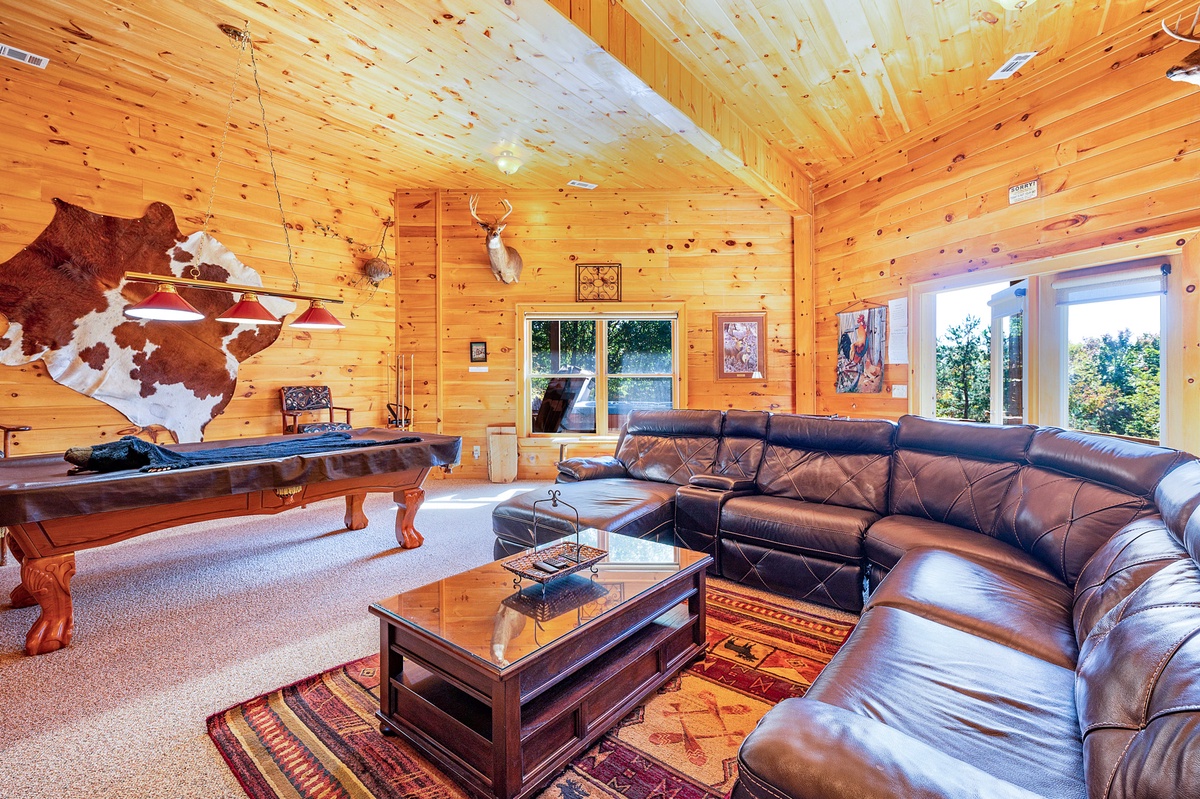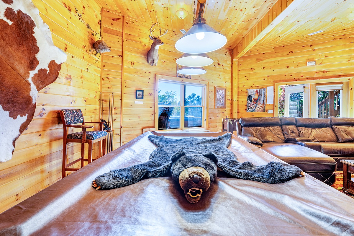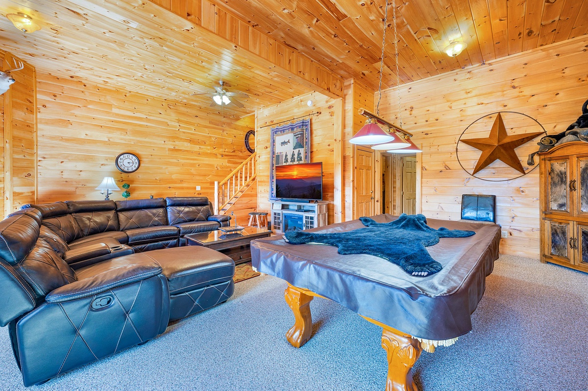 Meander through the fully equipped kitchen to the Queen bedroom, or unpack upstairs in the Primary King Suite with access to a private balcony that overlooks the Blue Ridge Mountains. Wander downstairs to the huge common area packed with entertainment including a pool table, foosball table, 75” Flat Panel Television, and board games.