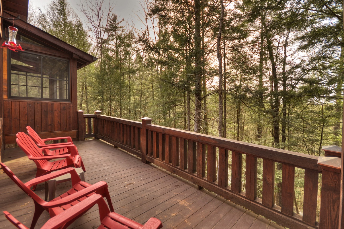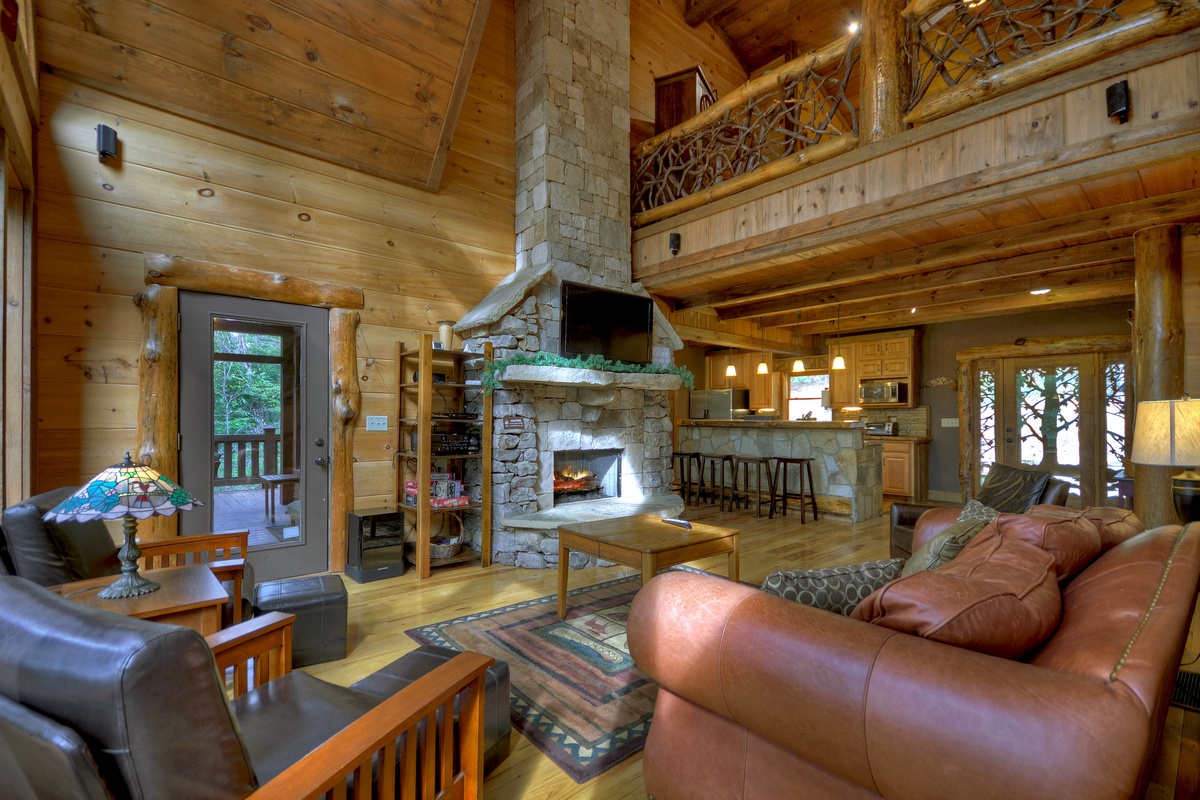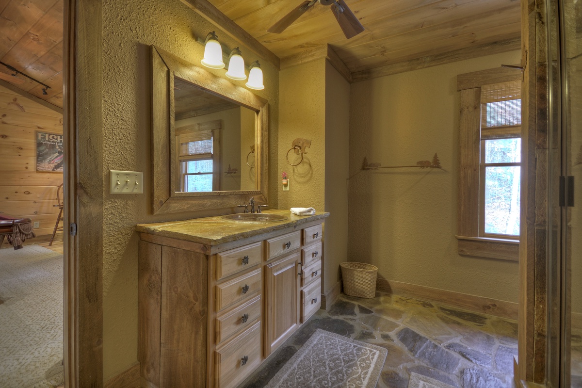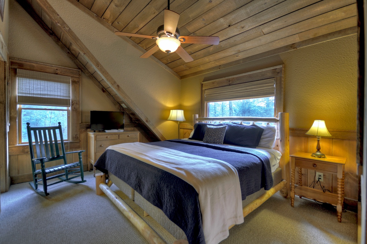 Upstairs you will find a loft area complete with pool table, queen bed and writing desk where you can document your getaway vacation in Blue Ridge. King bedroom #2 is also on the upper level and features a 32” TV and private bathroom access with a walk-in shower that has plenty of room to wash off after an adventurous day out.