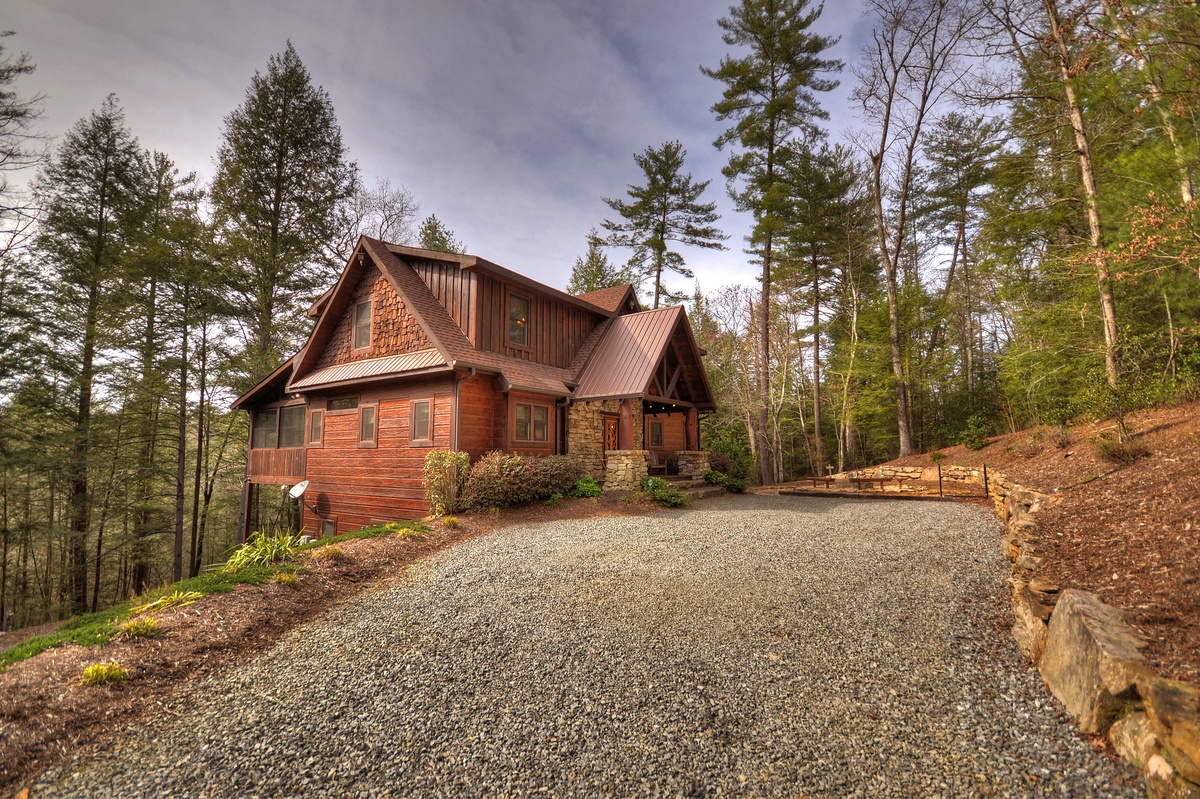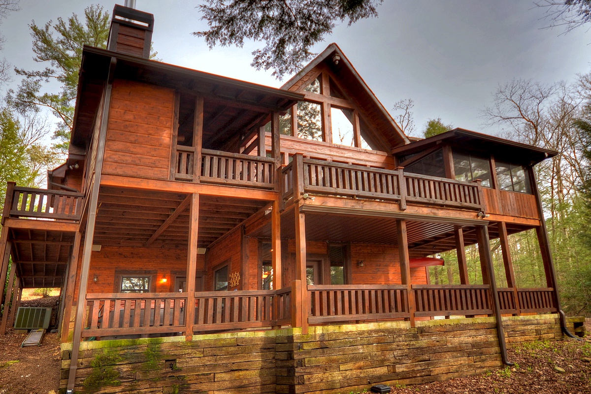 Ask yourself this question: would you rather rent a custom-built cabin with stunning views perched over Fightingtown Creek with a gourmet kitchen and luxurious furnishings; OR rent a fun-filled property with finished basement, game tables, and theater-style seating reminiscent of the movies? The better question is, why not have both?