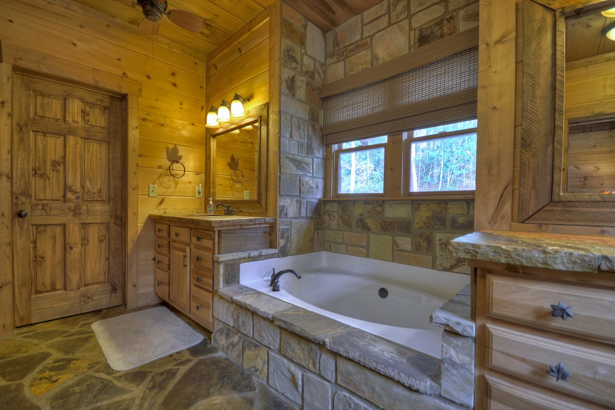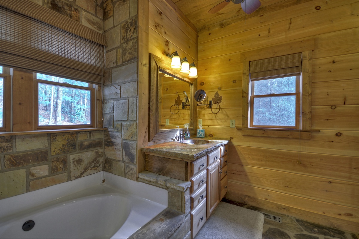 The first king bedroom with 32" TV also lies on the entry level, which comes with screened-in porch access and an attached private bathroom with jetted tub, walk-in tile shower and double vanity.