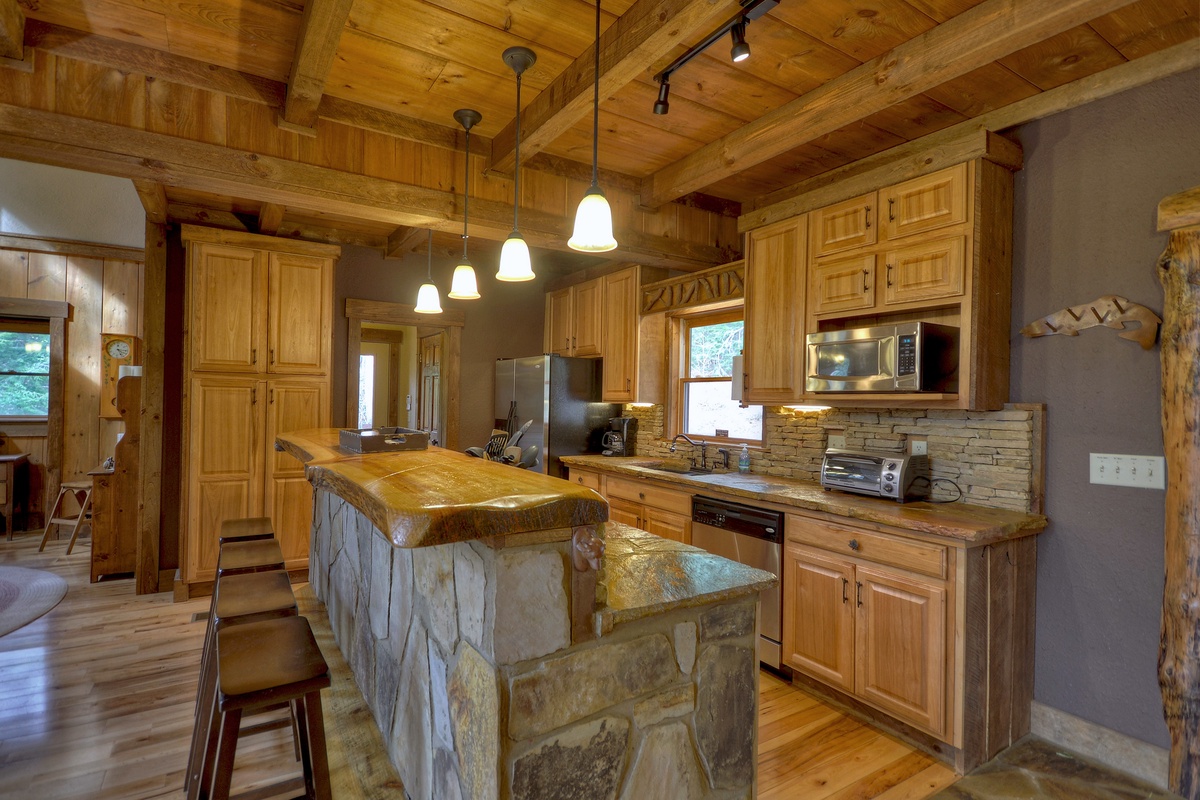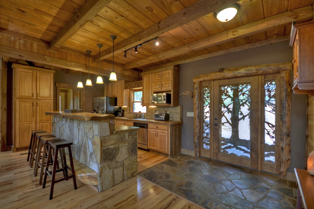 Prepare your guests a meal in the fully-equipped kitchen with all the comforts of home including stainless steel appliances, stone backsplash, and a wooden breakfast bar that makes dining easy. Whip up a yummy meal for your guests and eat at the large family-style dining table or outside on the screened-in porch, with access from the entry level.