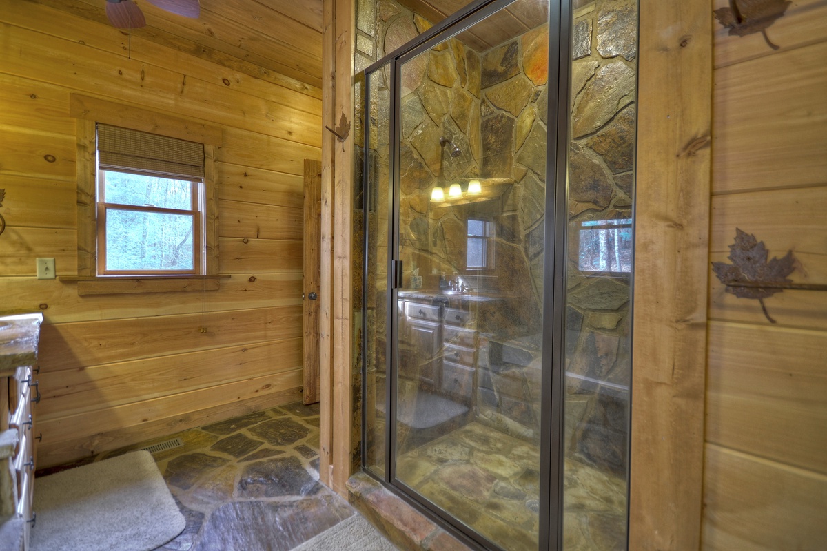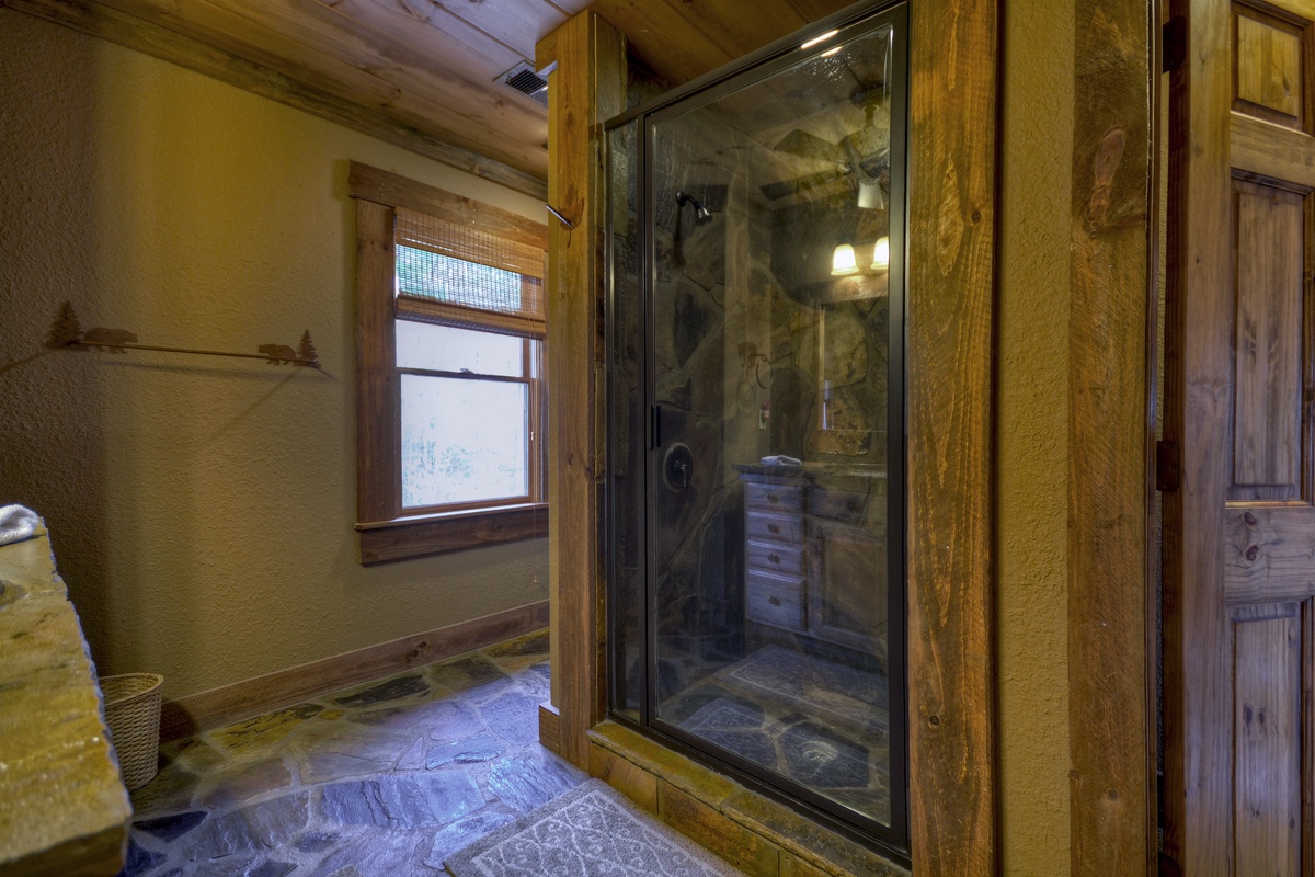 King Bedroom with Private Bathroom, Large Walk-In Stone Shower with 32" TV