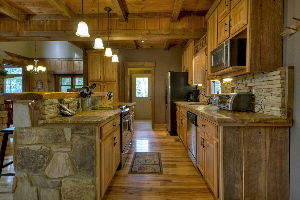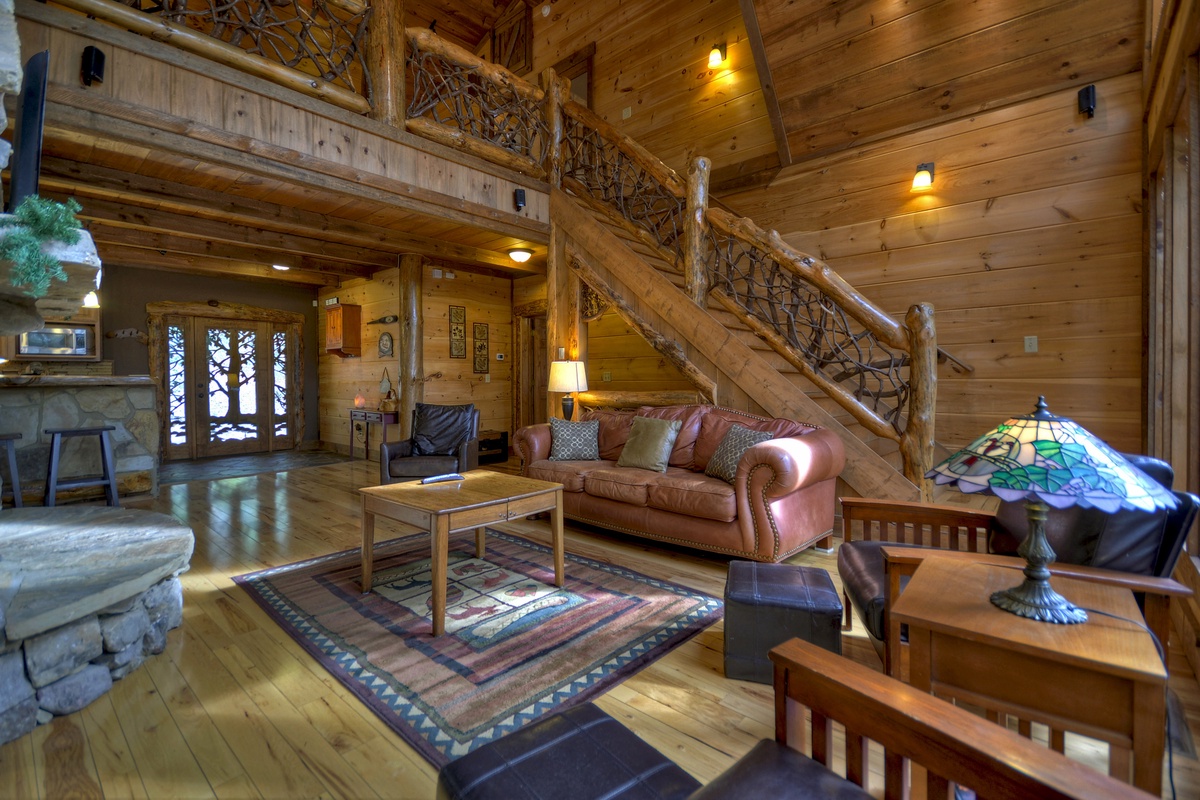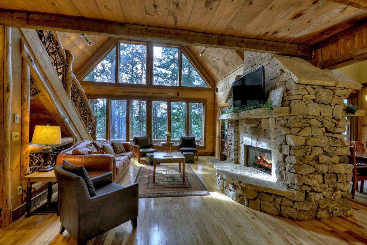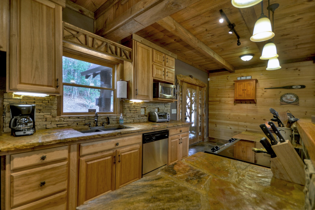 Get your vacation started right with a relaxing country drive out to the cabin, and let your worries wash away with the sounds of rushing water in the background as you pull into the driveway of Reel Creek Lodge. Take a moment to marvel at the large beams on the front porch, custom front door and beautifully landscaped fire pit area before entering the cabin.