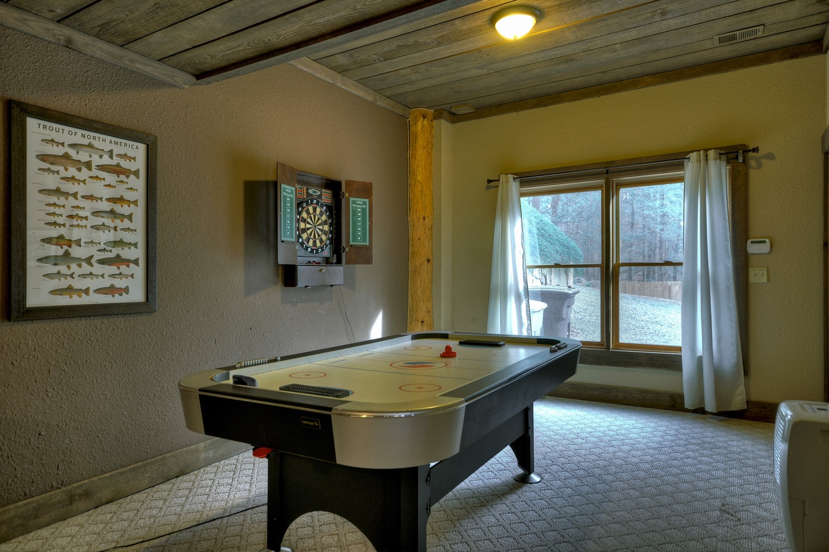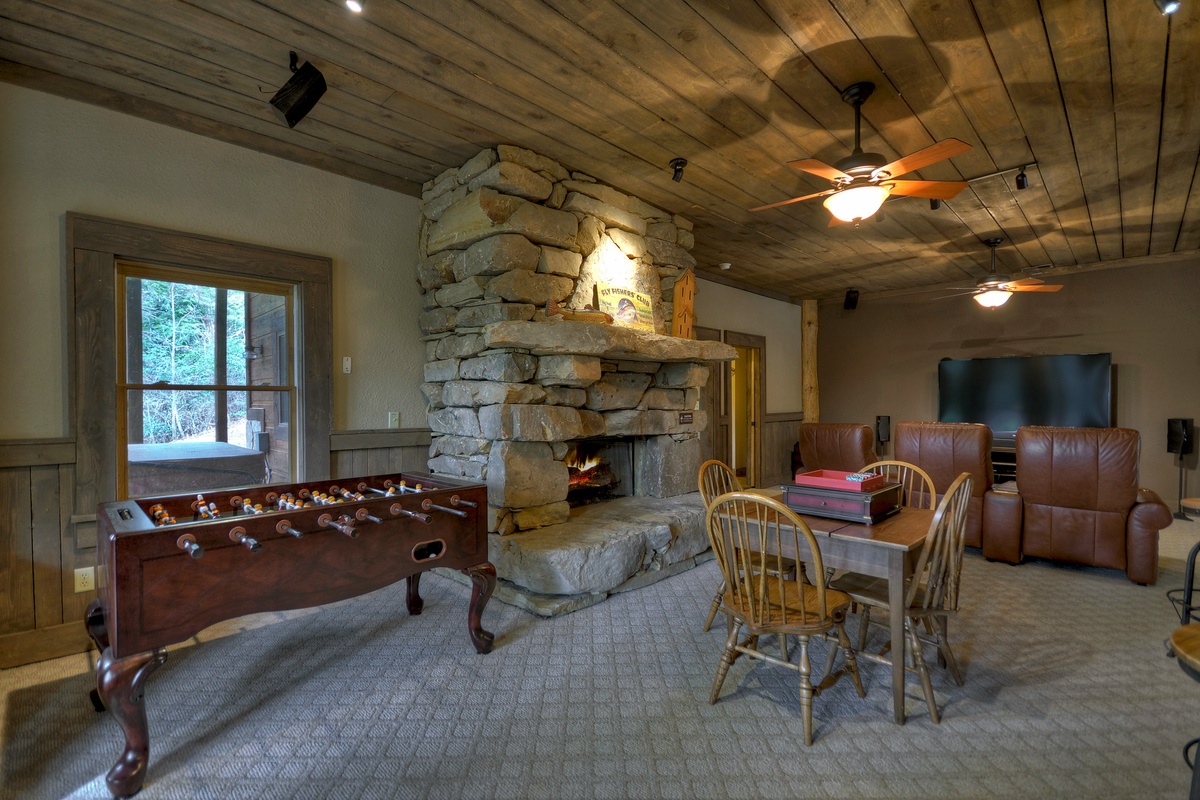 Recreation Room with Foosball Table, Air Hockey Table, Card Table, Dart Board and Large Gas Stone Fireplace
