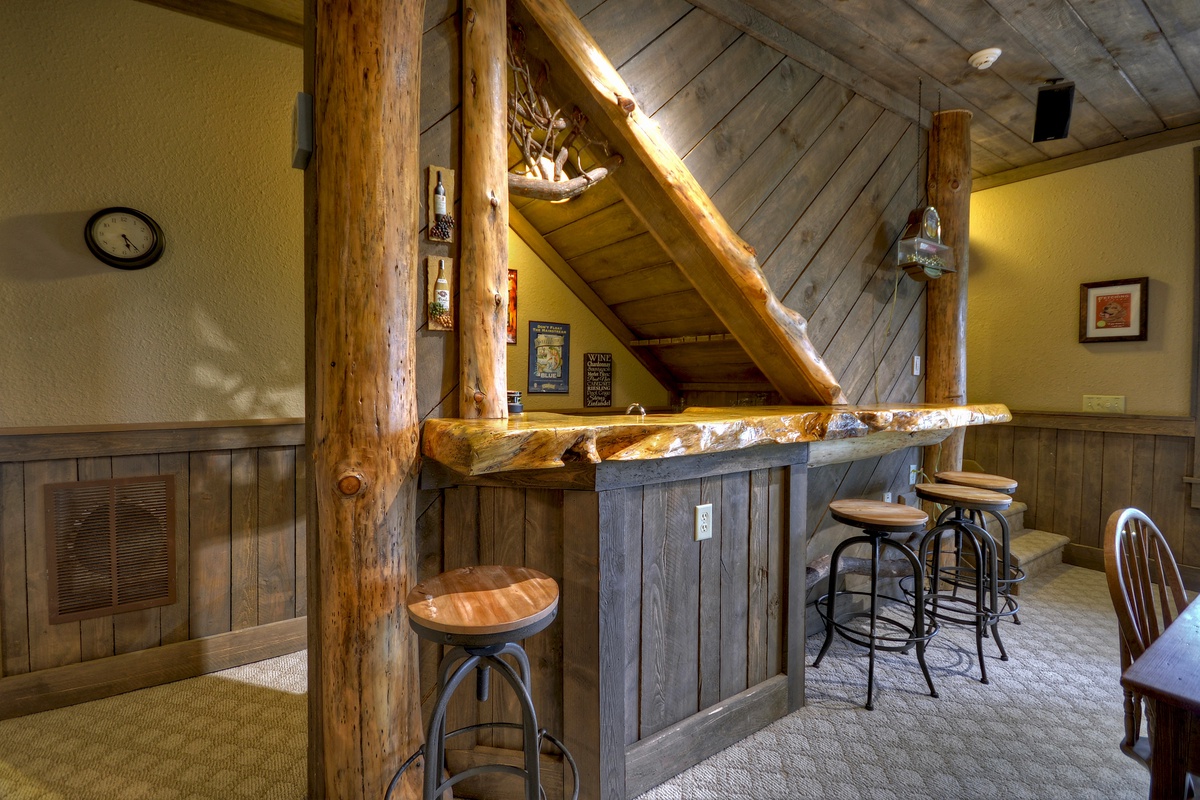 Lower level living is every bit as grand as the entry and upper levels, with a king bedroom featuring a 32” TV, direct access outside and a private bathroom for your convenience. Pop some popcorn, grab a bottle of wine from the minifridge under the counter, fire up the Blu-ray and kick back in the theatre-style seats as you watch your favorite flick on the enormous 65” TV.