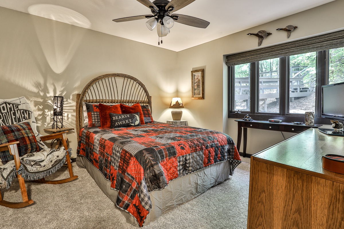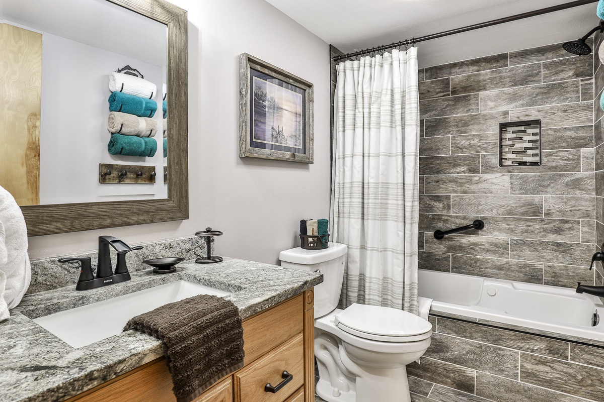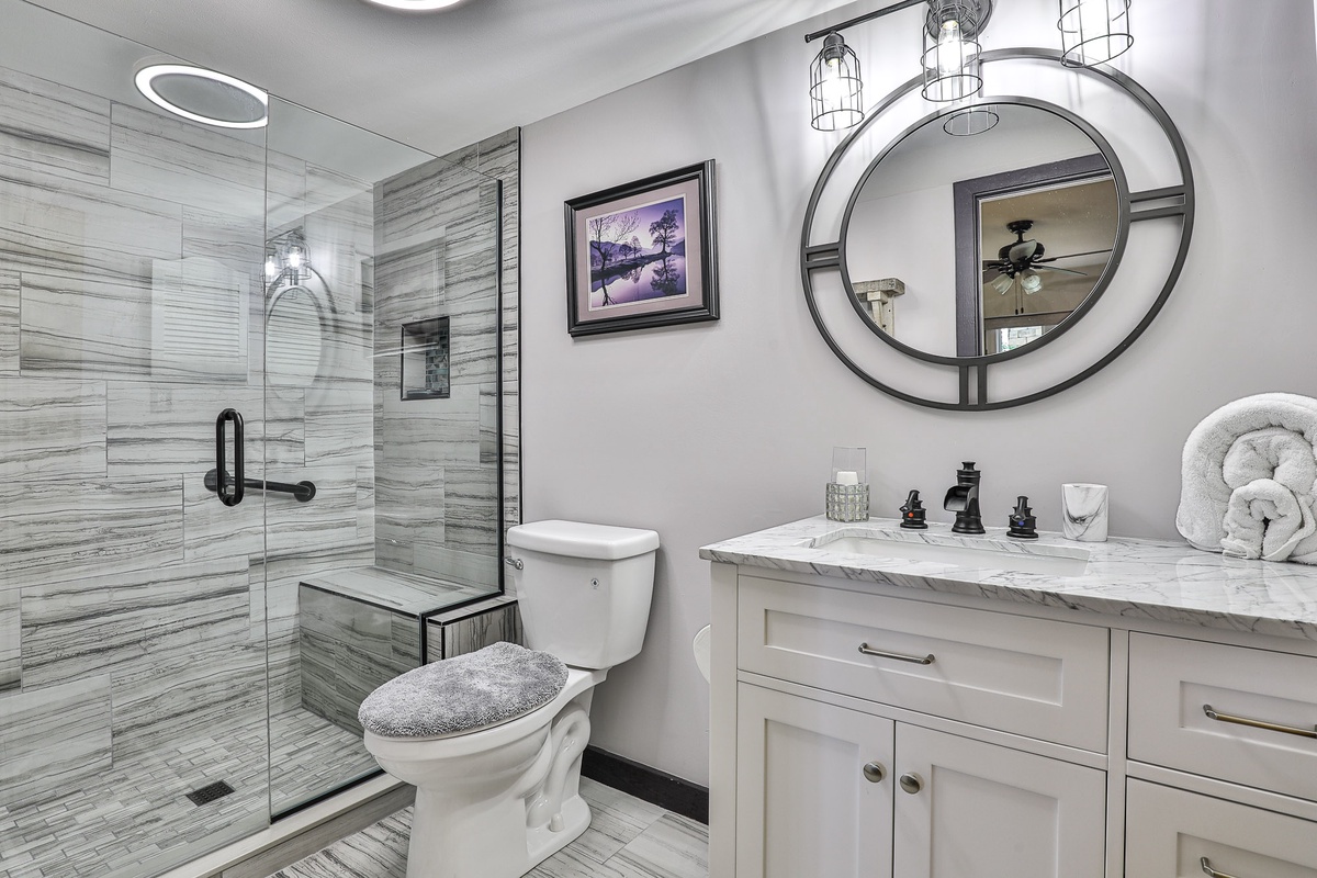 The primary bedroom has a king bed and an attached updated bathroom. The second bedroom has a queen bed and shares the updated hall bath.