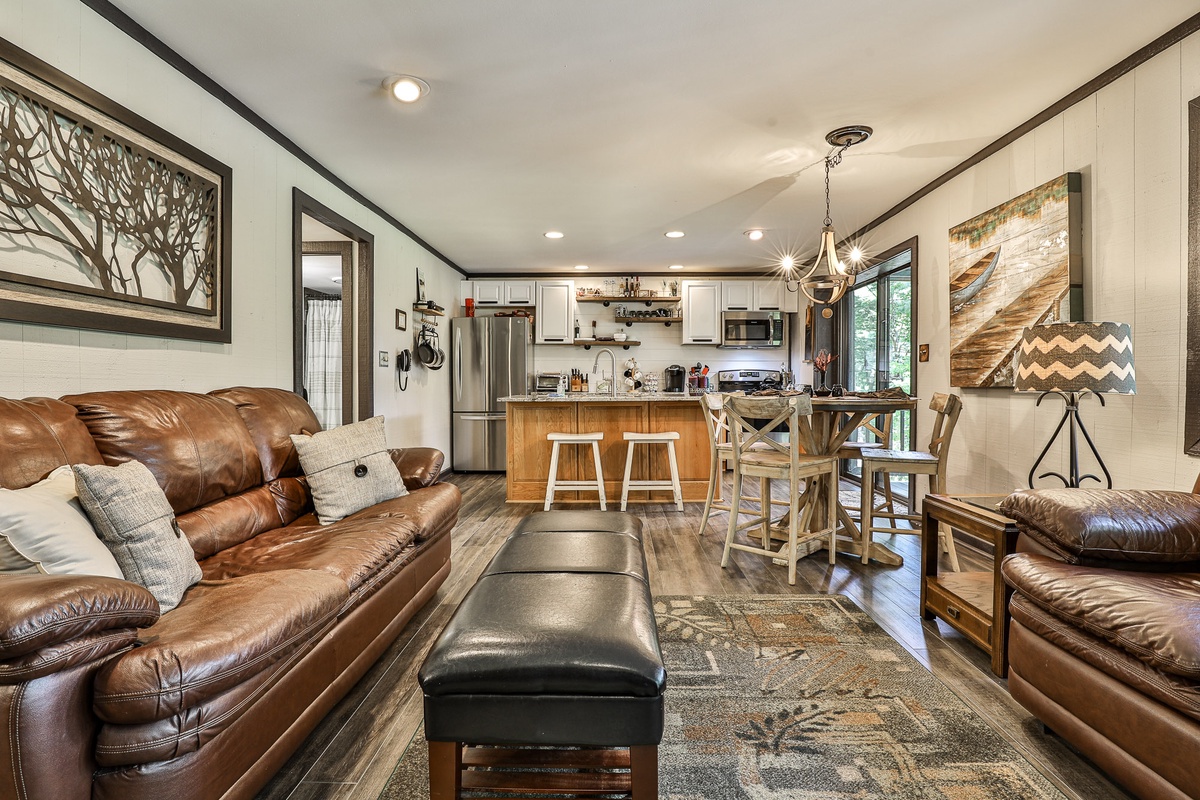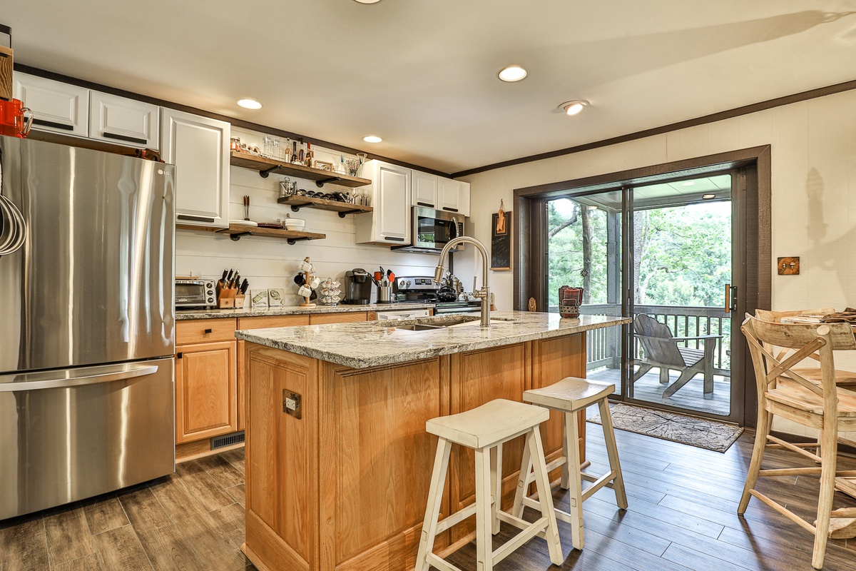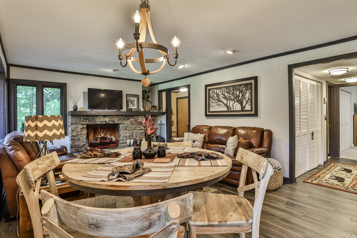 The open-plan living space features a cozy living room with a decorative stacked stone fireplace and flat-screen TV, perfect for relaxing or watching the game. The dining table seats four, and the updated kitchen is well-equipped for meal preparation or a cup of coffee. Adjacent to the kitchen, the covered outdoor sitting porch provides more stunning views.