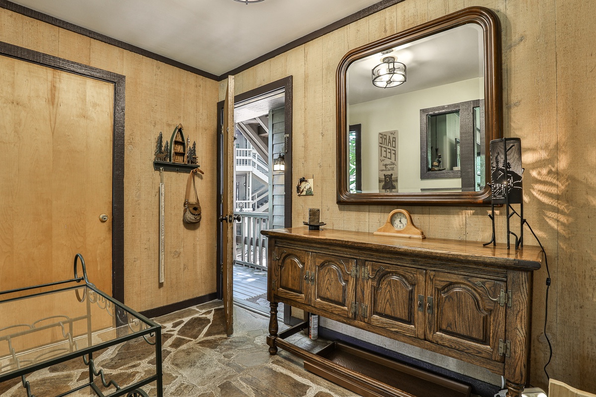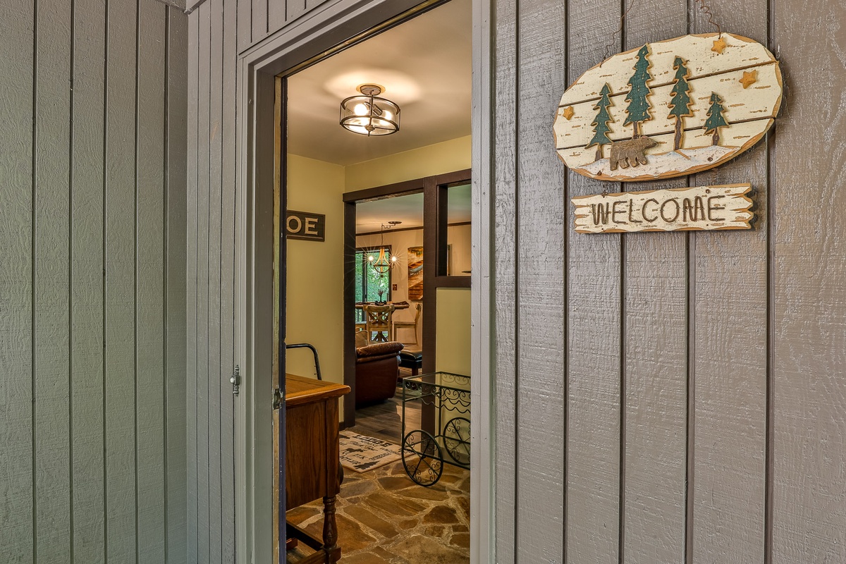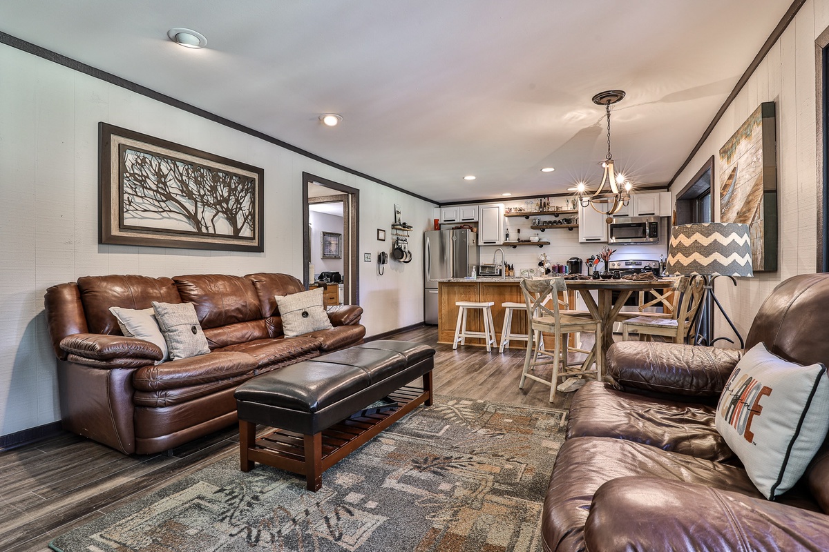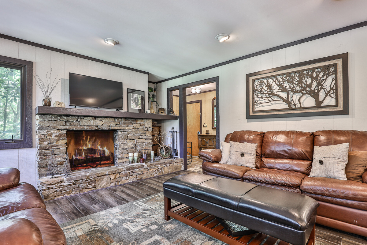 The open-plan living space features a cozy living room with a decorative stacked stone fireplace and flat-screen TV, perfect for relaxing or watching the game. The dining table seats four, and the updated kitchen is well-equipped for meal preparation or a cup of coffee. Adjacent to the kitchen, the covered outdoor sitting porch provides more stunning views.