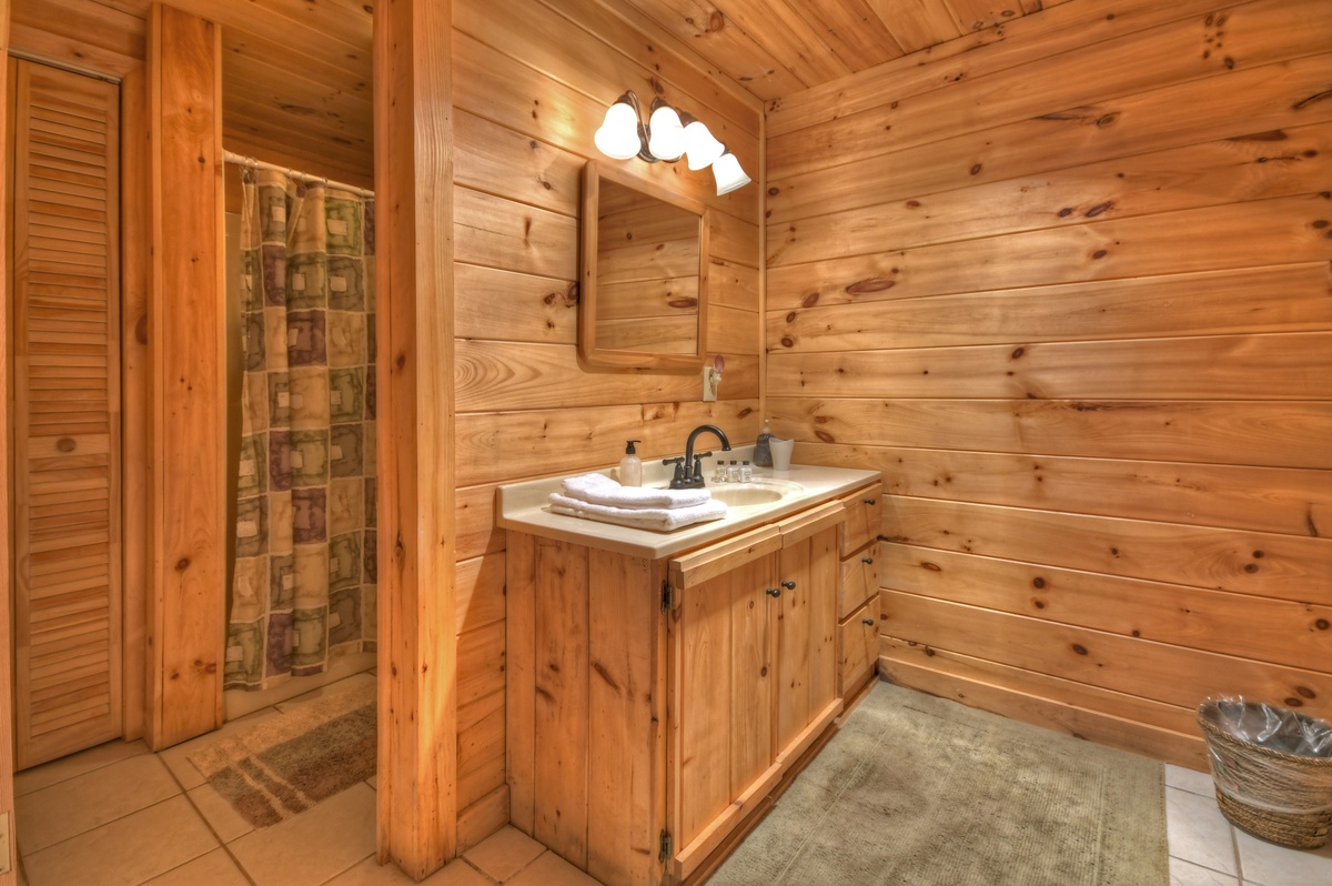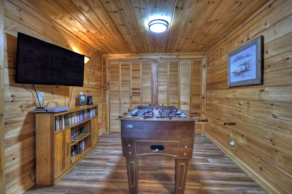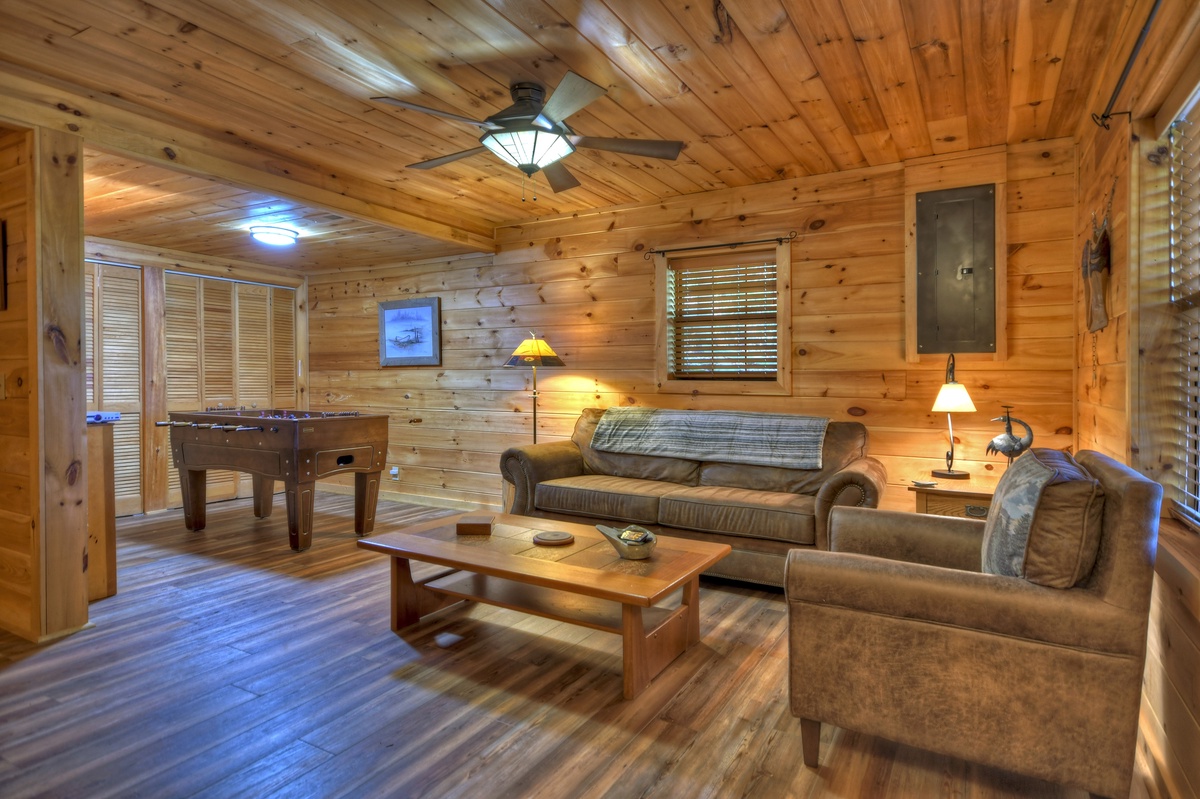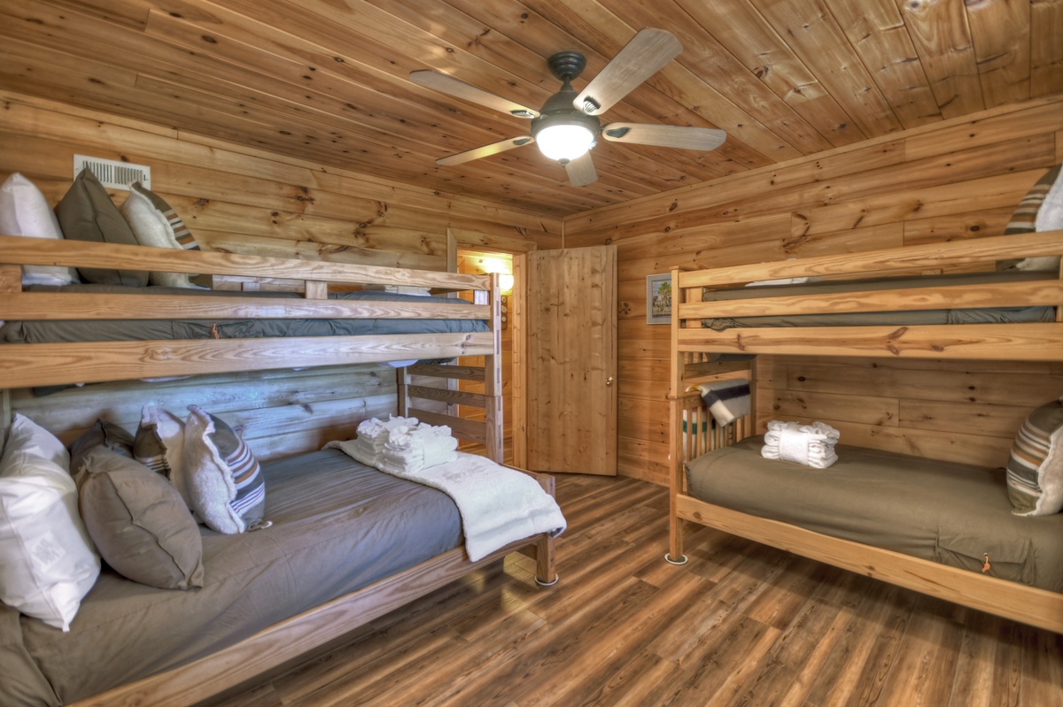 Family game time is a must in the lower level den area. Enjoy a game of foosball with the kids or watch the big game on the 43" YouTube LIVE TV. With ample plush furniture, this is another cozy place to spend an evening with family and friends. For your convenience, there is a washer and dryer for your use on the lower level of this cabin. The final sleeping arrangement is found on this level with a double bunk bedroom, one being a single over a double and one being a single over single.