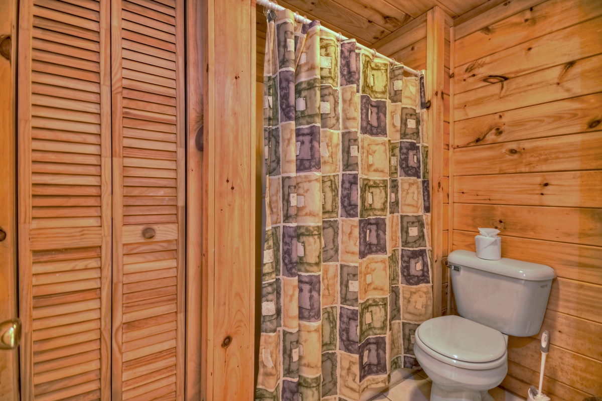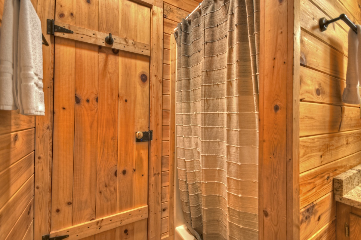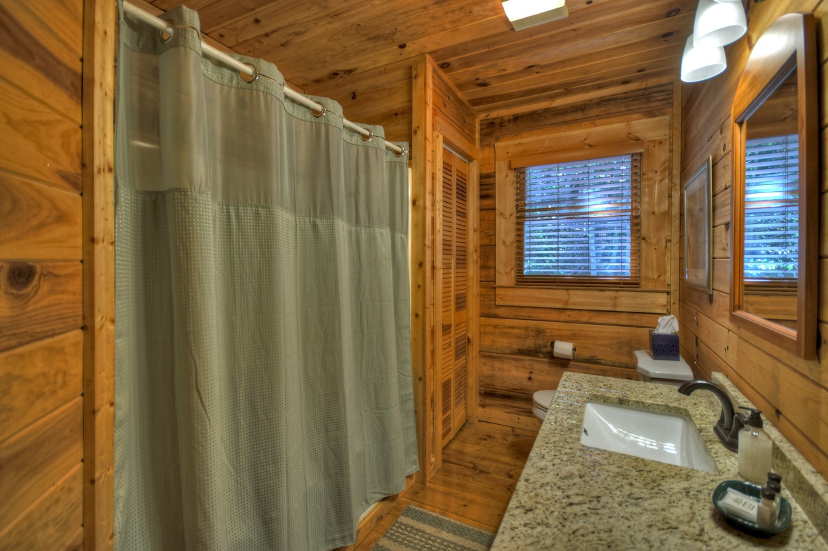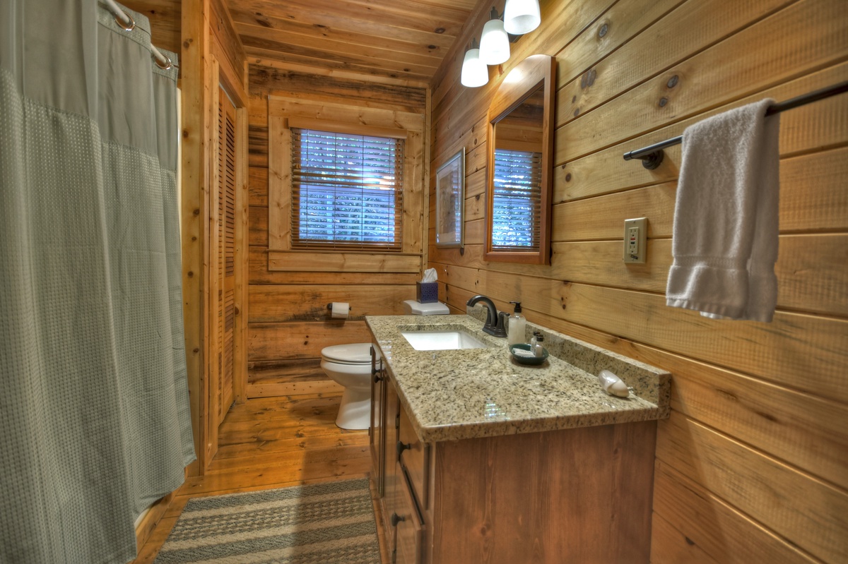 Family game time is a must in the lower level den area. Enjoy a game of foosball with the kids or watch the big game on the 43" YouTube LIVE TV. With ample plush furniture, this is another cozy place to spend an evening with family and friends. For your convenience, there is a washer and dryer for your use on the lower level of this cabin. The final sleeping arrangement is found on this level with a double bunk bedroom, one being a single over a double and one being a single over single.