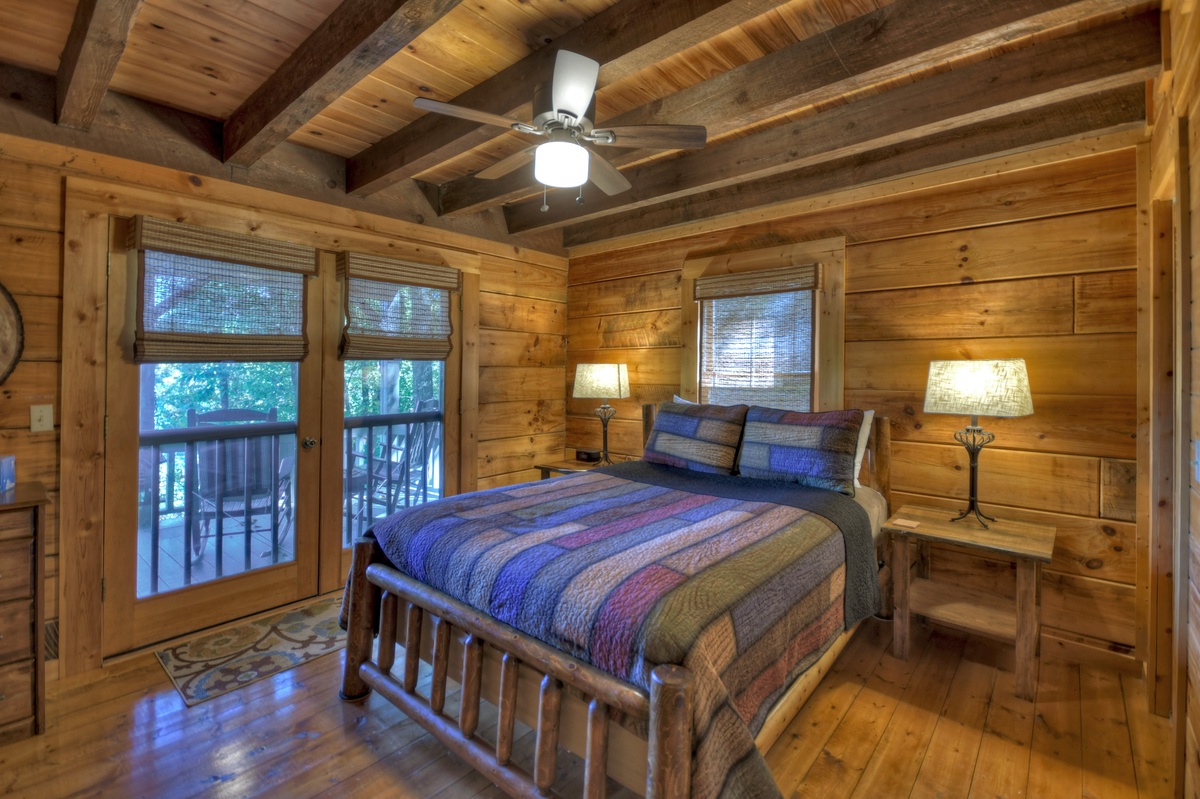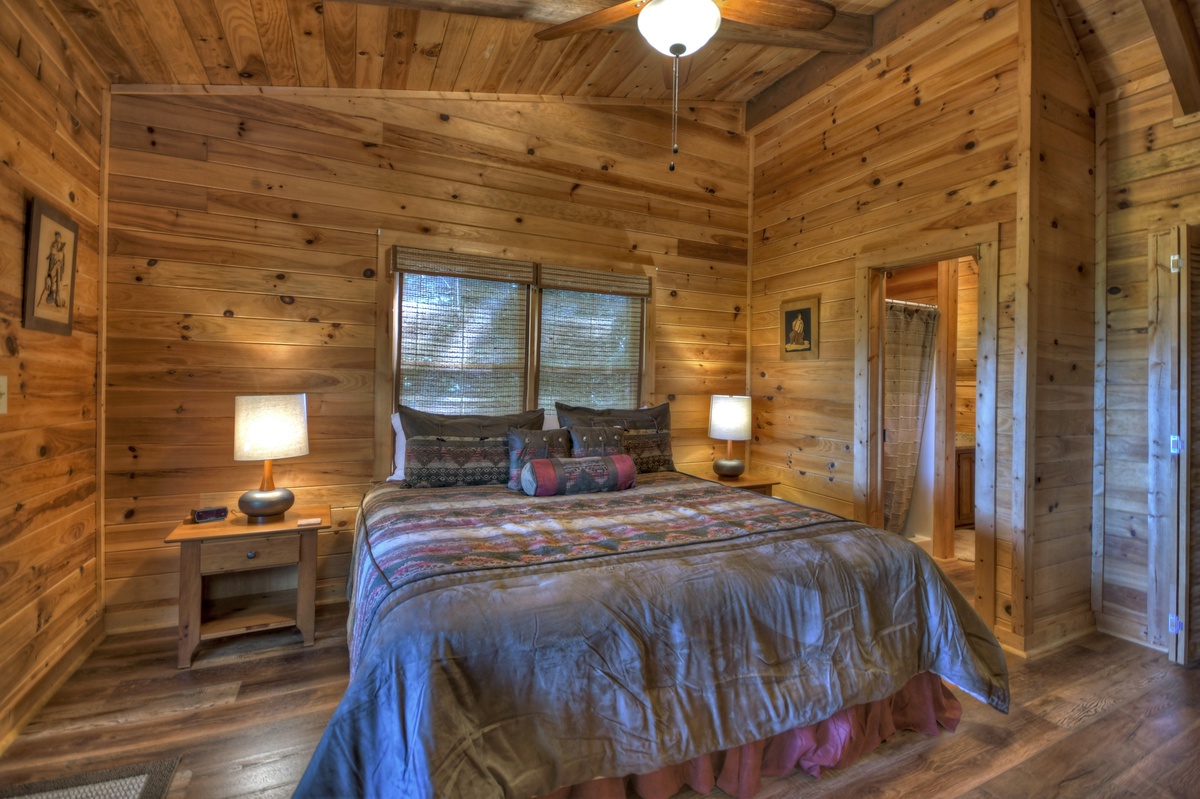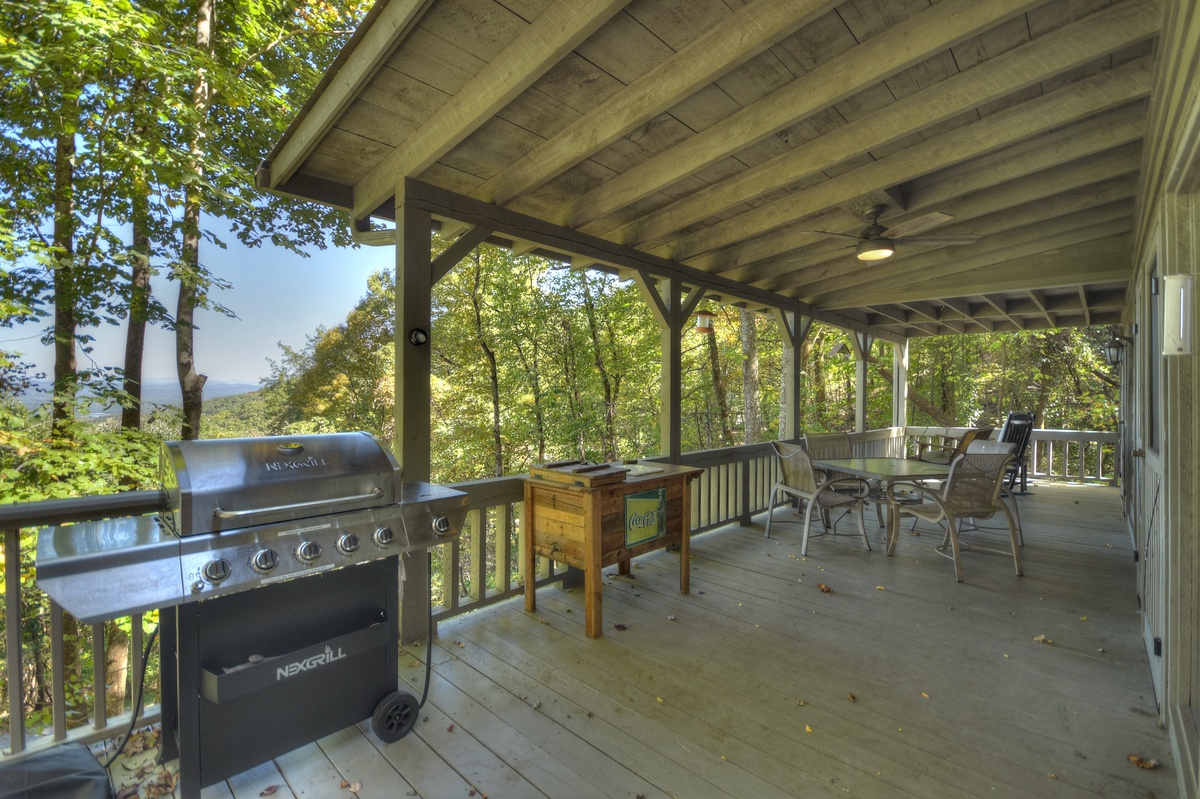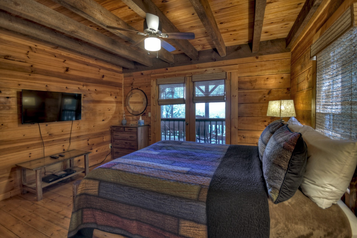 From the moment you swing the door open you will be awe-struck by the long-range mountain views at Ridgetop Pointaview! The giant wall windows give you the opportunity to gaze out over the steep tops of the Appalachian Mountains AND Lake Blue Ridge at the same time! Kick back and slow down on the reclining plush furniture in the living area while enjoying a crackling fire. As expected, this cabin also comes with a fully equipped kitchen for all your cooking and entertaining needs. The first bedroom of the cabin is a queen bedroom with access to the shared full bathroom with a tub/shower combo and a 43" Roku TV w/ streaming options. The entry level deck has a gas grill with a prepping station, outside dining table for 4, and plentiful seating for the whole group to sit together and soak up the view! If you're traveling with your favorite pet, you'll be pleased to know that this cabin IS pet-friendly!