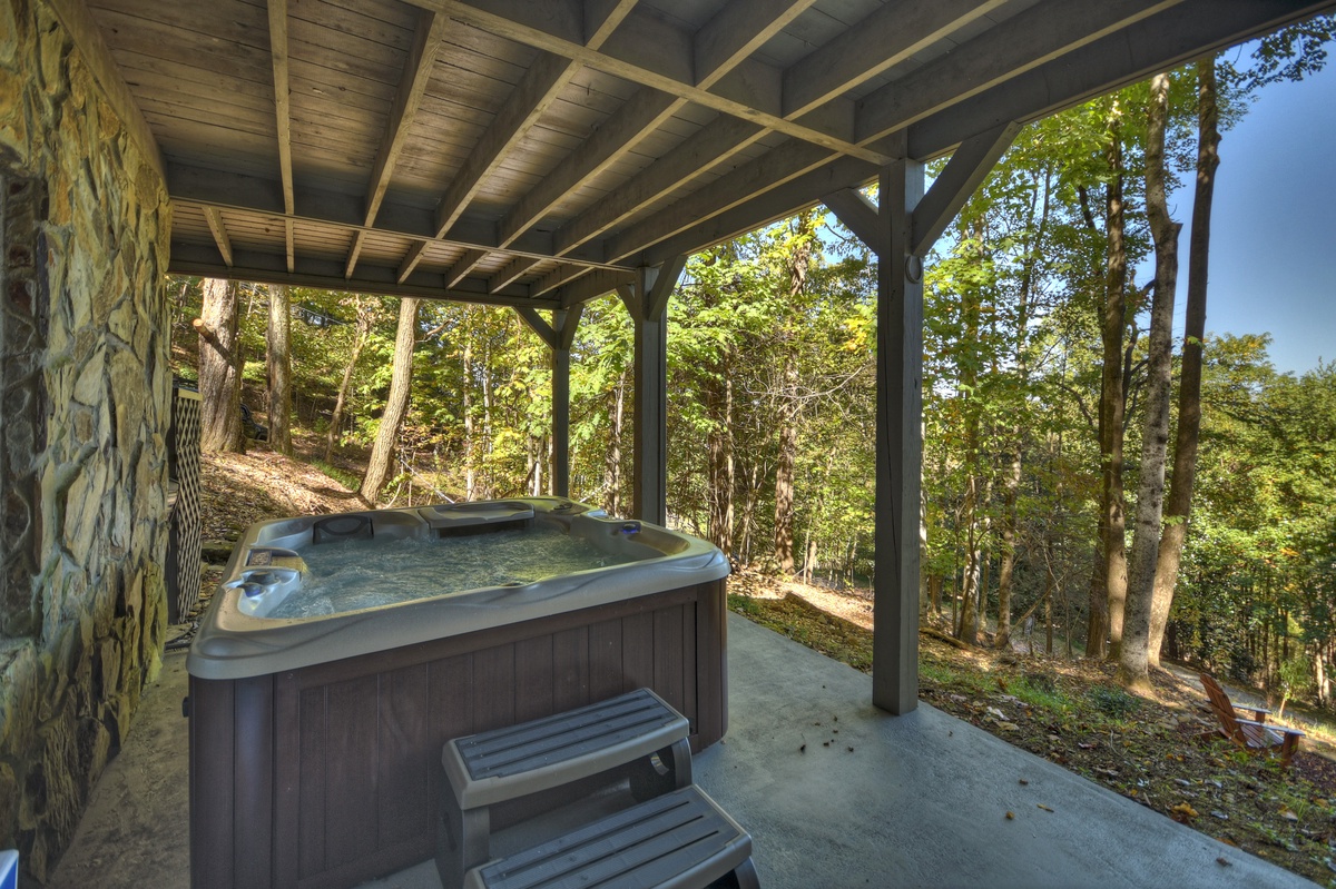 The lower level patio has a hot tub, wicker furniture, a hammock tucked away amongst the trees and a firepit perfect for relaxation, conversation, s'mores or just listening to the cicadas.