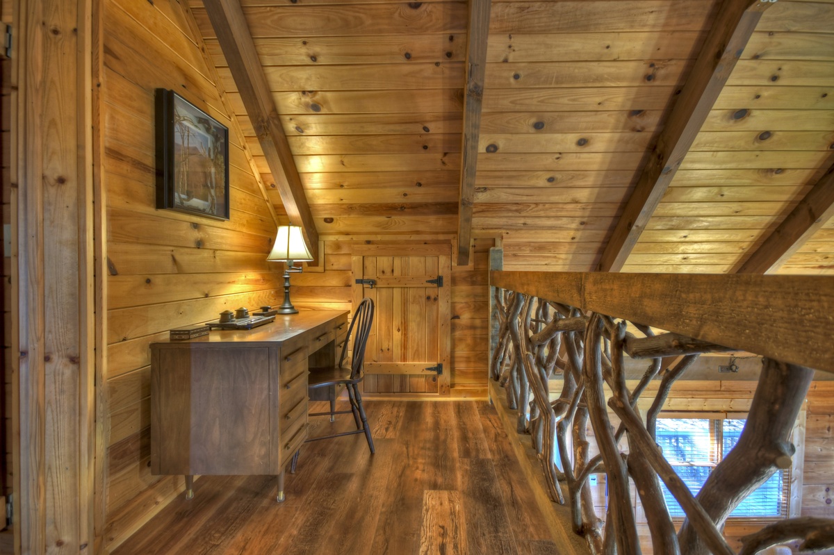 The upper level is where you will find the King Master Suite with a private master bathroom w/ walk-in shower. If you'd like to wind down before bed with your favorite show, you'll have the opportunity in the master as it has its own 43" Roku TV w/ streaming options. If that isn't enough, bring in the day with a hot cup of coffee on your very own private balcony! The upper level also has a workspace area suitable for use as a remote office, complete with desk, high-speed fiber internet, printer, and office supplies; perfect for an extended vacation mixed with some remote working.