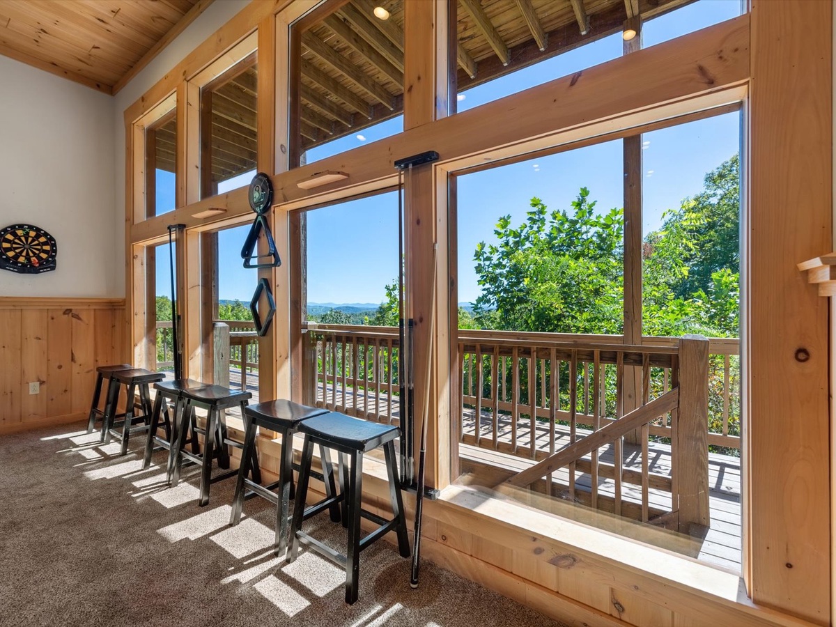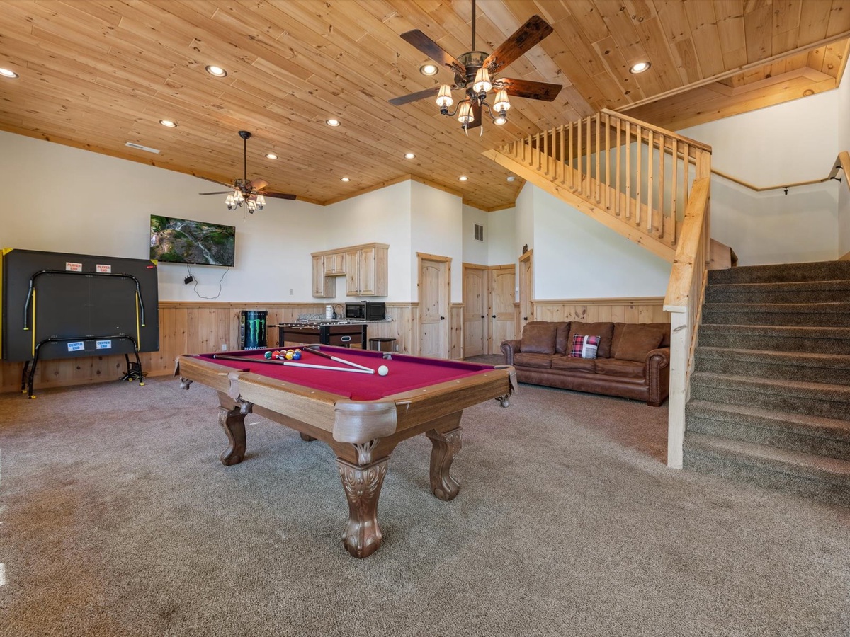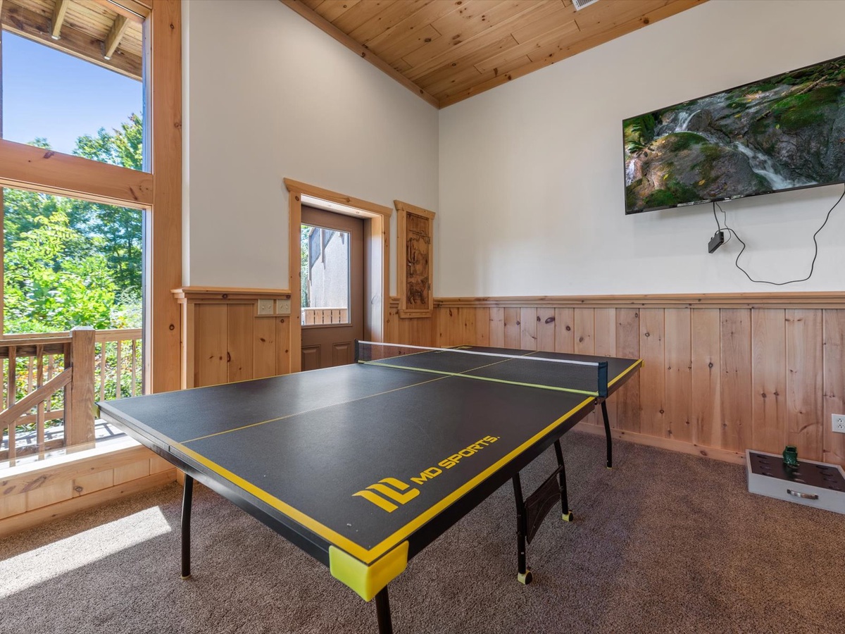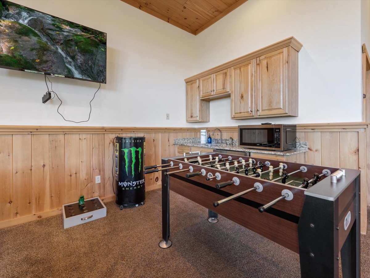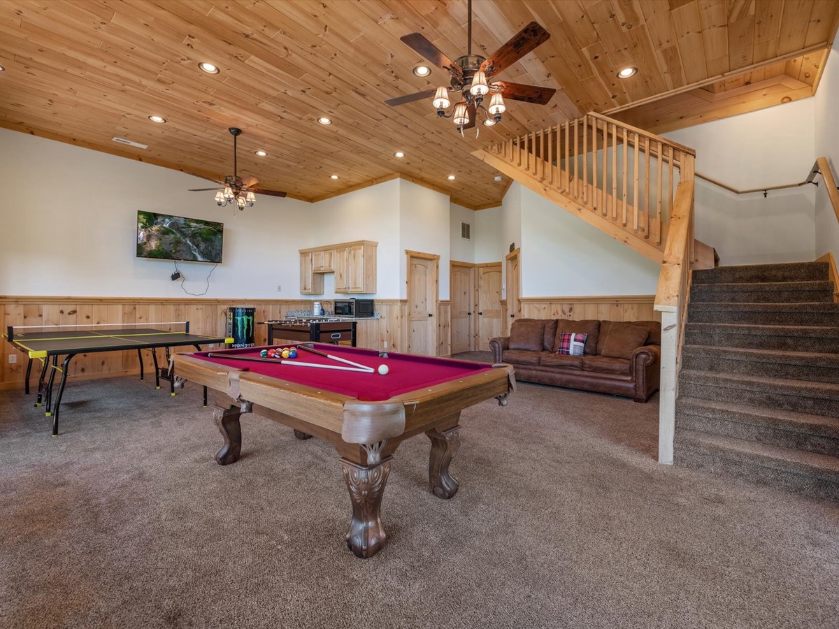 Don’t forget to explore the lower-level game room, where the real indoor excitement begins. With choices between playing pool, ping- pong, darts, foosball, or ring-toss; there is no shortage of opportunity for a good old-fashioned family game night. Lose a game? Don't worry, feel free to be a spectator in complete relaxation, with a drink from the wet bar in one hand and the tv remote in the other, you're sure to be the true winner of the night.