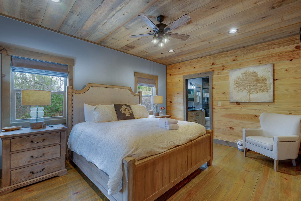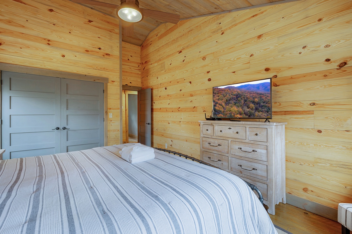 - King bedroom with 44” TV, dresser, closet and accent chair