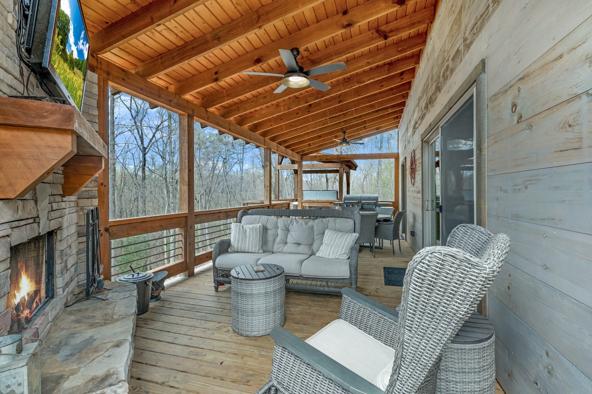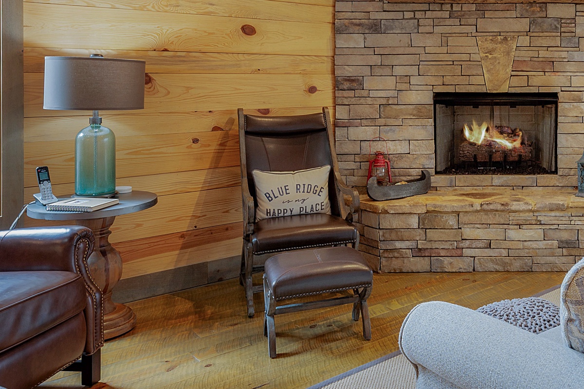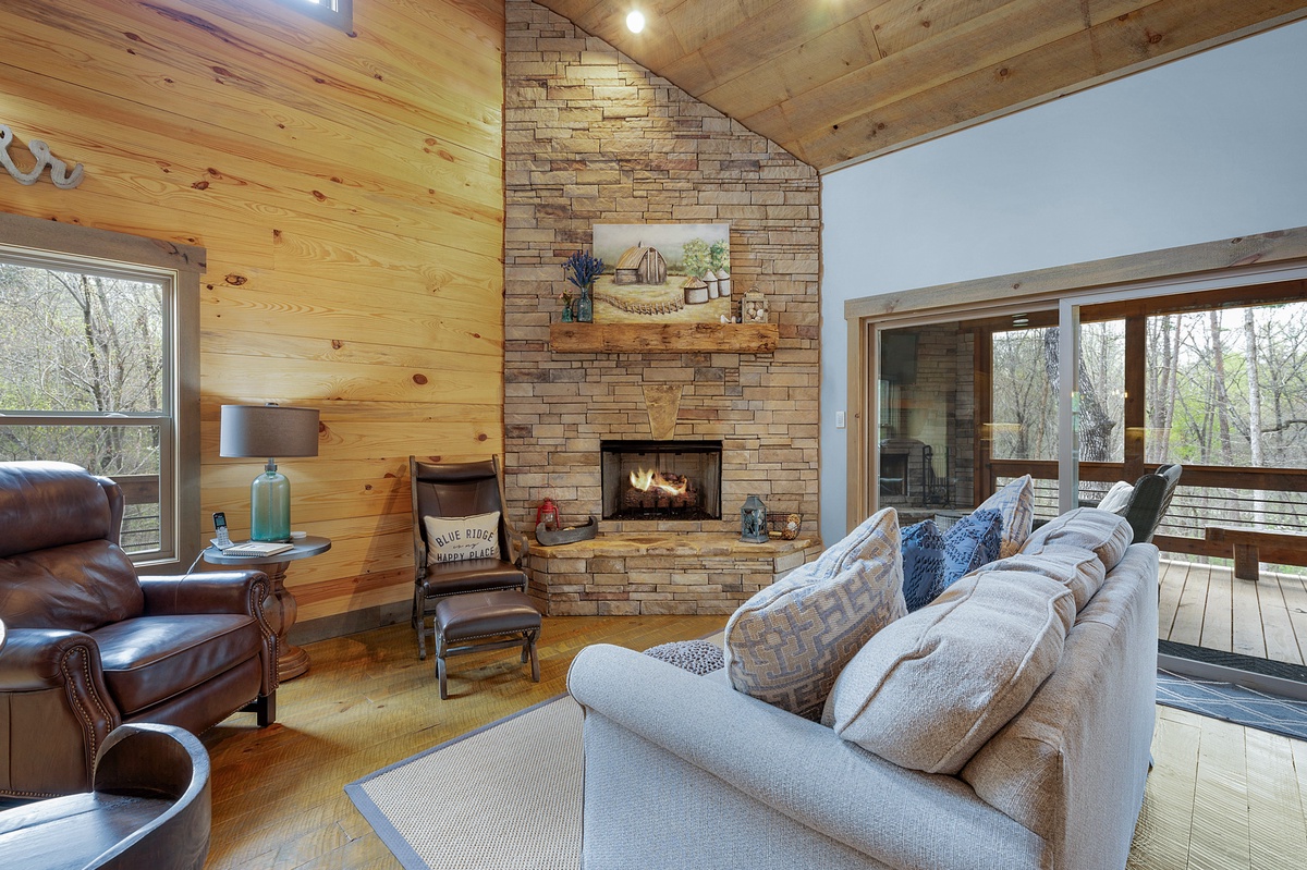 - Wood burning fireplace, 44” TV, sofa for 3, rocking chair
