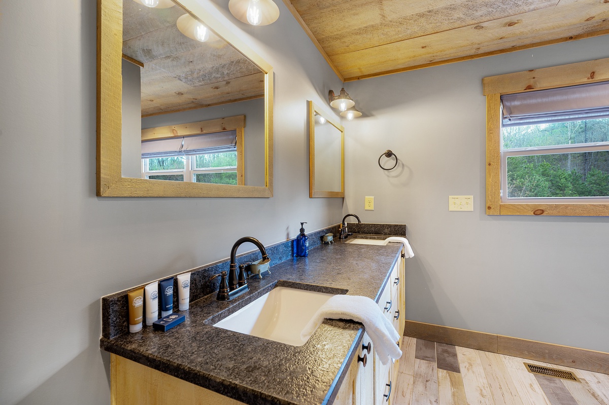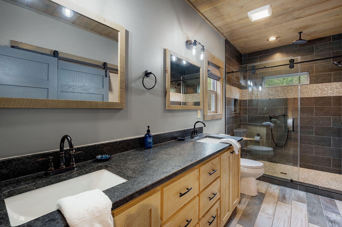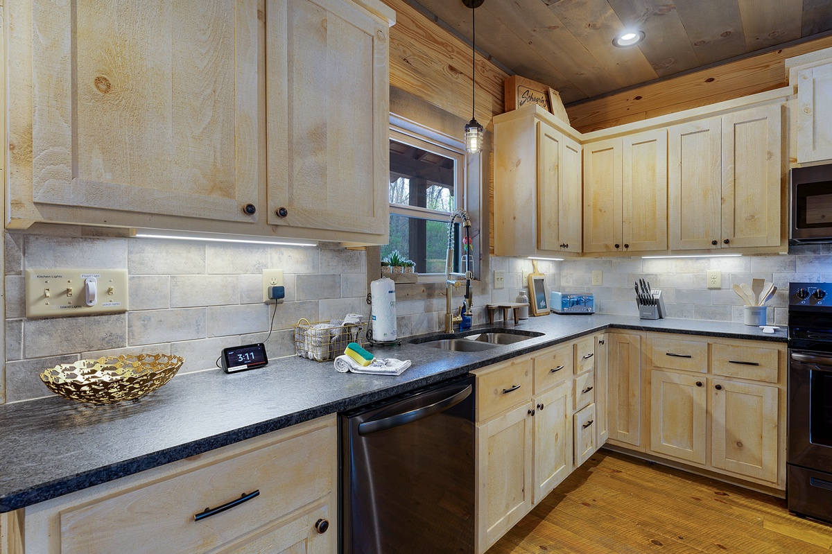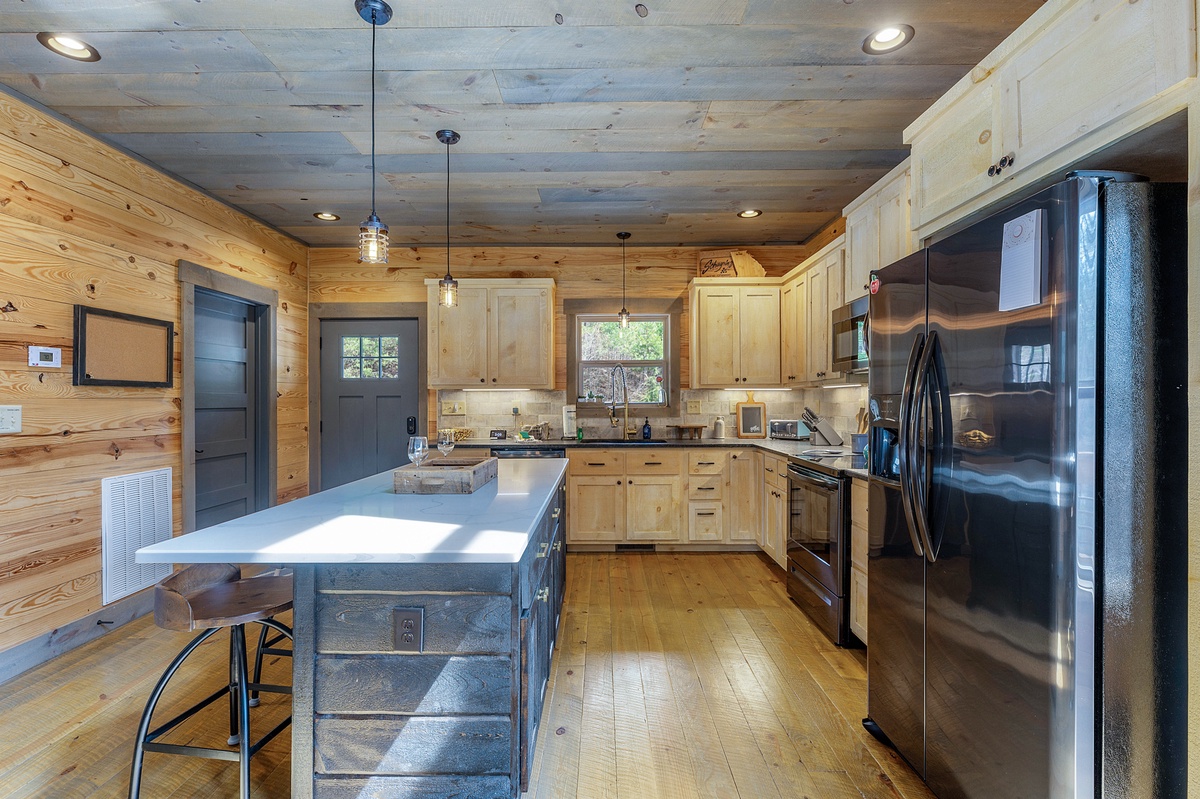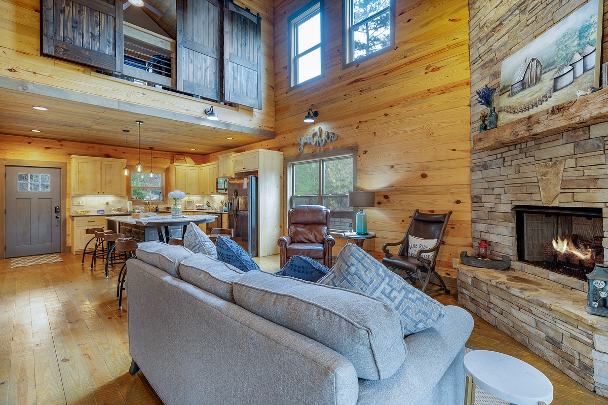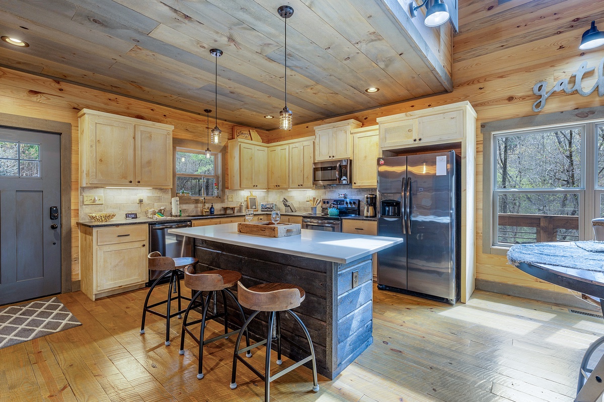 Rustic Elegance, nestled in a gated community. Entering your vacation home, you are greeted with that cozy feeling that makes your trip all worthwhile. Envisioning snuggling up in front of the entry level gas fireplace brings that smile to your face and a twinkle in your spouses’ eyes. Hearing your kids’ wild exclamations of joy when they find the arcade game in their room overlooking the living room fills you with satisfaction of choosing the right place. The fully equipped kitchen with the gas grill on the back deck, you realize there is no meal you won’t enjoy preparing.