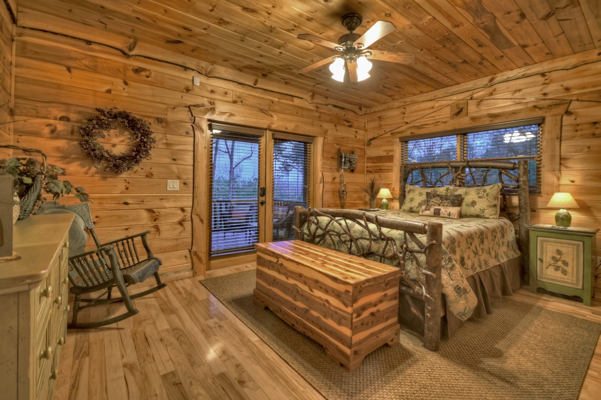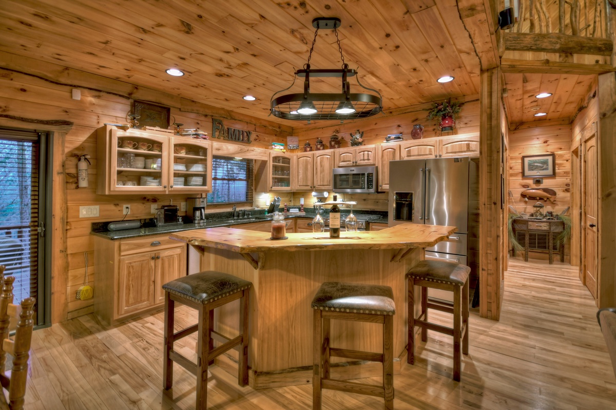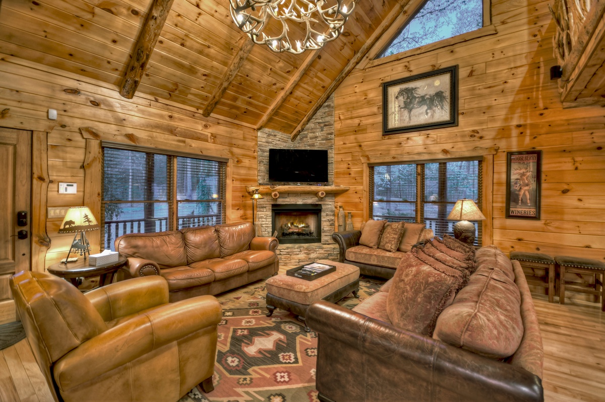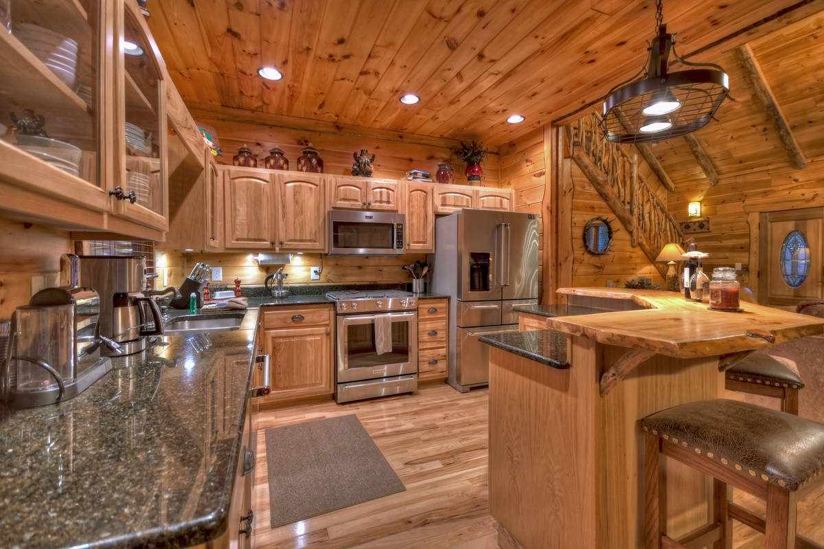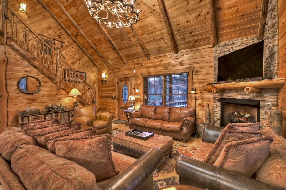 Upon entering this home, your eyes will be immediately drawn to the masterful woodworking throughout the main living areas. To the left, the living room boasts plush seating, a stacked stone fireplace and 65” TV to enjoy a firelit movie night with the family. Moving over to the kitchen fully stocked with stainless steel appliances and an island with a beautiful live-edge bar top and bar seating for 4, there’s plenty of room to prepare a big family breakfast to enjoy at the large dining table with seating for 10. Over to the right and down the hall. To the left is the main level bedroom with a queen bed and deck access. Head across the hall for the main level bathroom with a shower/tub combo and laundry closet. Back through the kitchen and dining areas you will find the spacious main level deck with seating throughout. Enjoy a sunset meal at the large outdoor dining area with a crackling fire burns in the woodburning fireplace or a movie plays on the 65” flat panel TV.