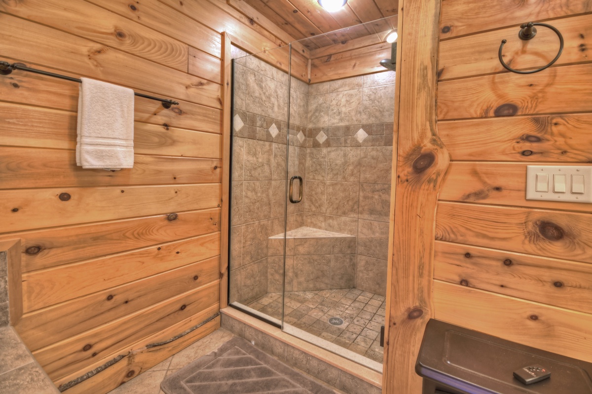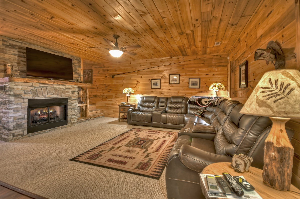 Go downstairs to the lower level and settle in on the plush reclining sofa for a movie on the 65” flat panel TV over gas fireplace. Hop over to the bar area for some drinks at the basement bar area. Down the hall and adjacent from one another is the final queen bedroom and full bathroom. Enjoy a dip in the hot tub out on the lower-level deck while steaks sizzle on one of the grills. Or gather around the outdoor firepit for smores while the kids and/or dogs play in the fenced back yard.