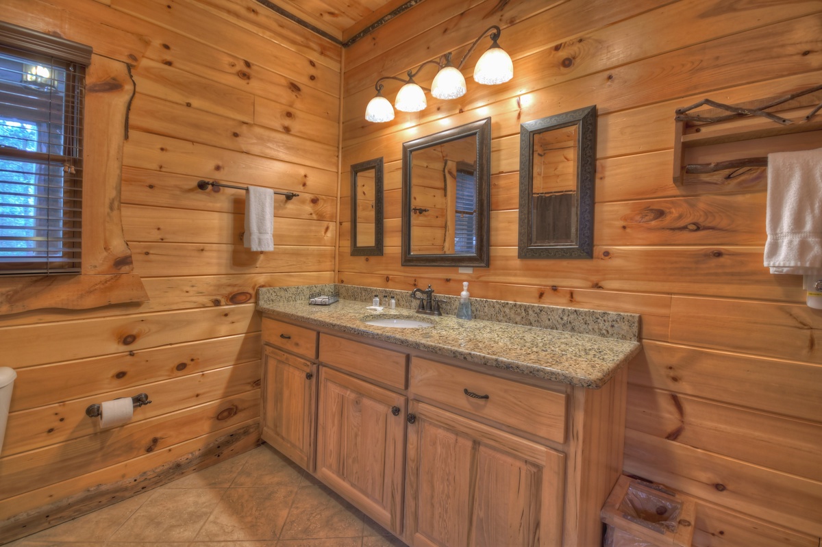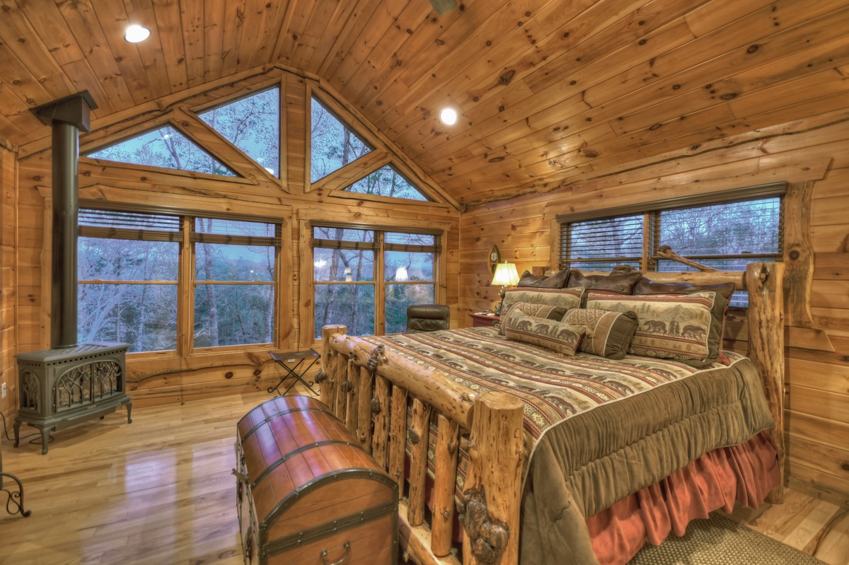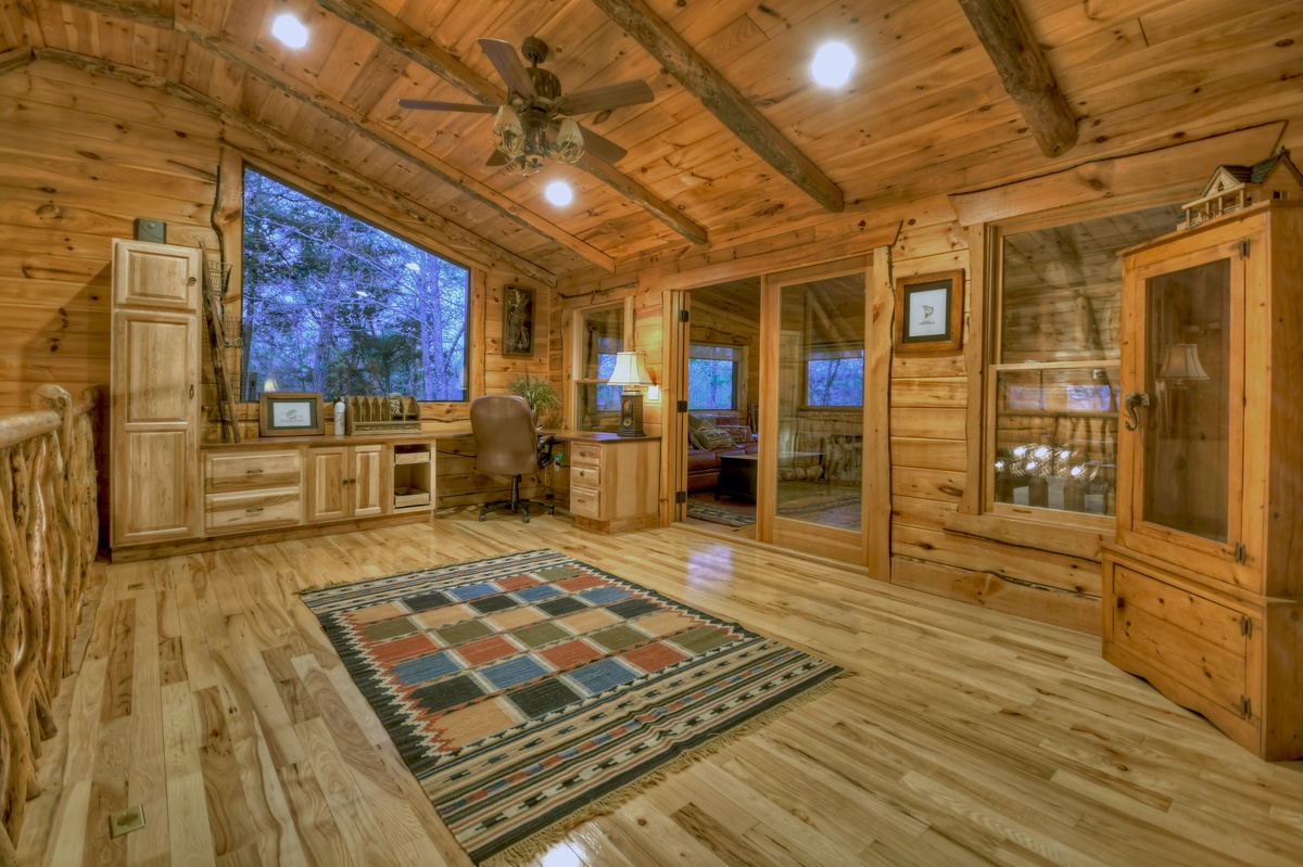 Inside, at the top of the stairs, a large desk area is ready for online work or school. Through the double doors is a large queen over queen bunk bed and couch seating. Also at the top of the stairs is the master bedroom boasting a king bed, large windows and stunning mountain view. Enjoy a soak and a good book in the jetted tub in the master bathroom. The master bathroom also has double vanity sinks and a tiled walk-in shower.