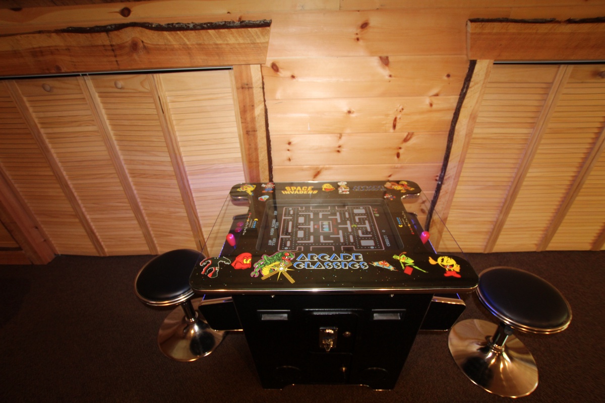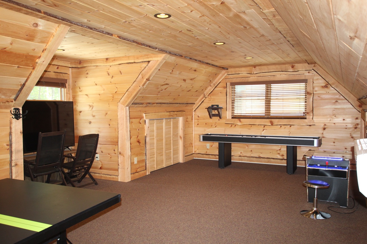 The game room above the garage will bring out the kid in everyone. Play table shuffleboard, take a turn on the arcade machine or hook your own gaming console to the 70” TV for some modern-day gaming.