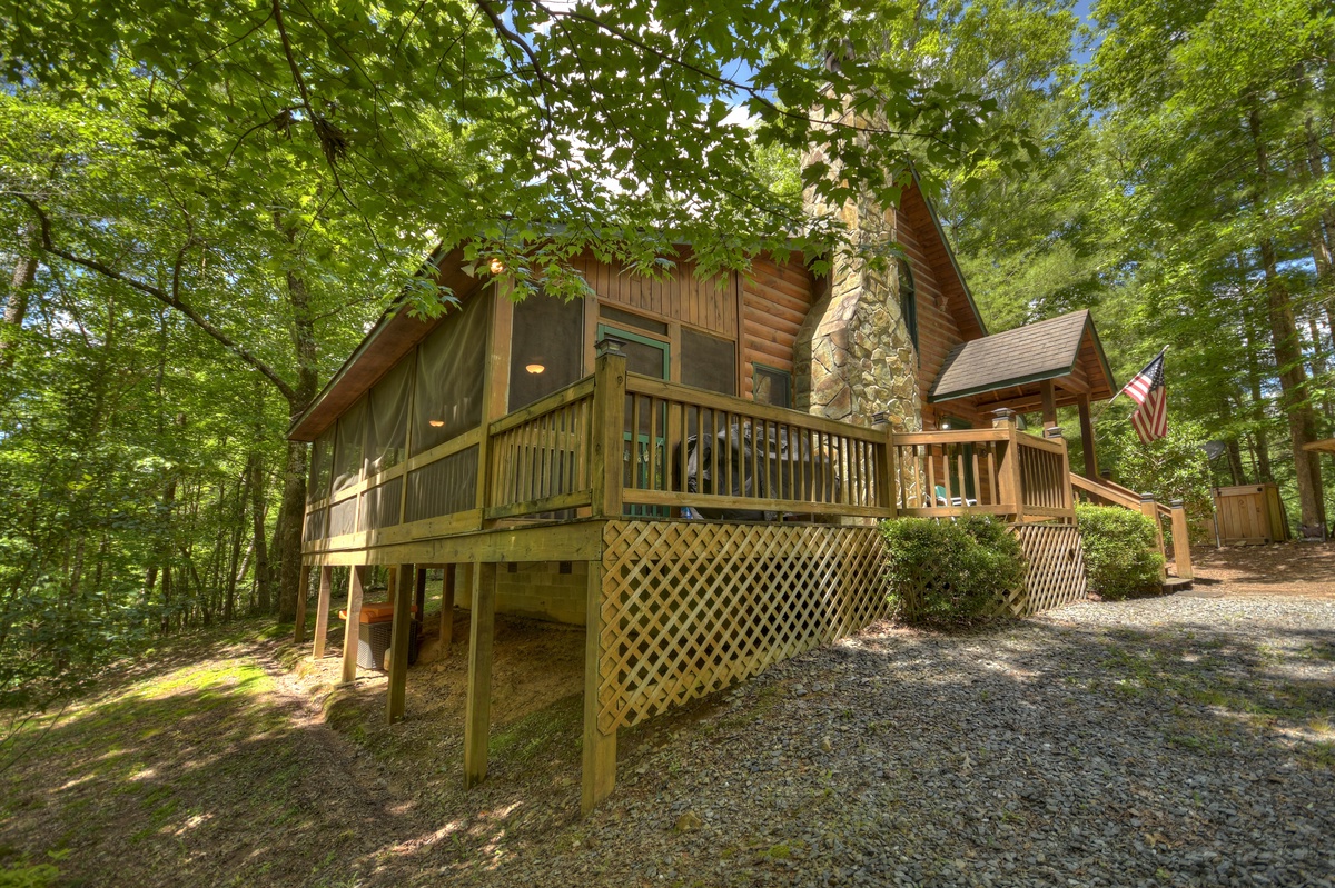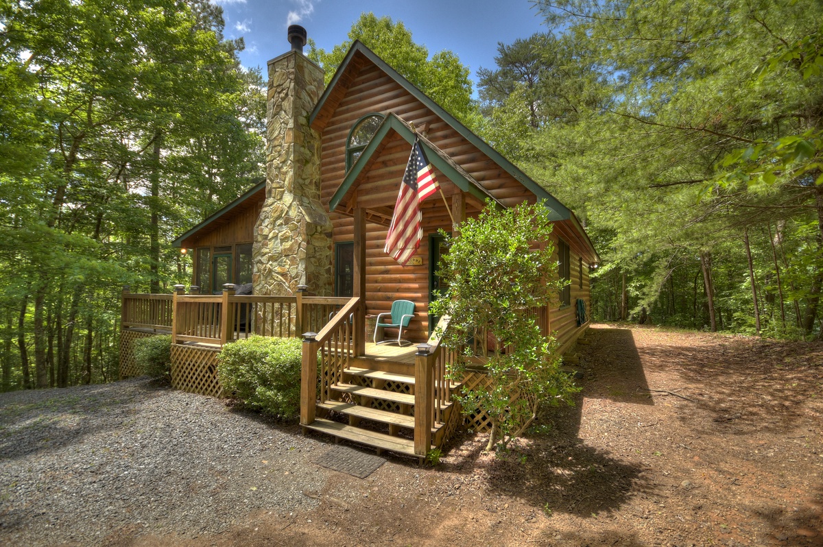 Put yourself in the right place at the right time and find something special at Serendipity, centrally located minutes between two of Georgia’s most famous apple towns, Blue Ridge and Ellijay. The true rustic character of this property will not disappoint! This well appointed two-bedroom, one bath cabin features an enclosed entertainment area with rocking chairs, outdoor dining, dart board, ring hook and oversized connect four game, 42” flat panel smart TV and a new four person hot tub.