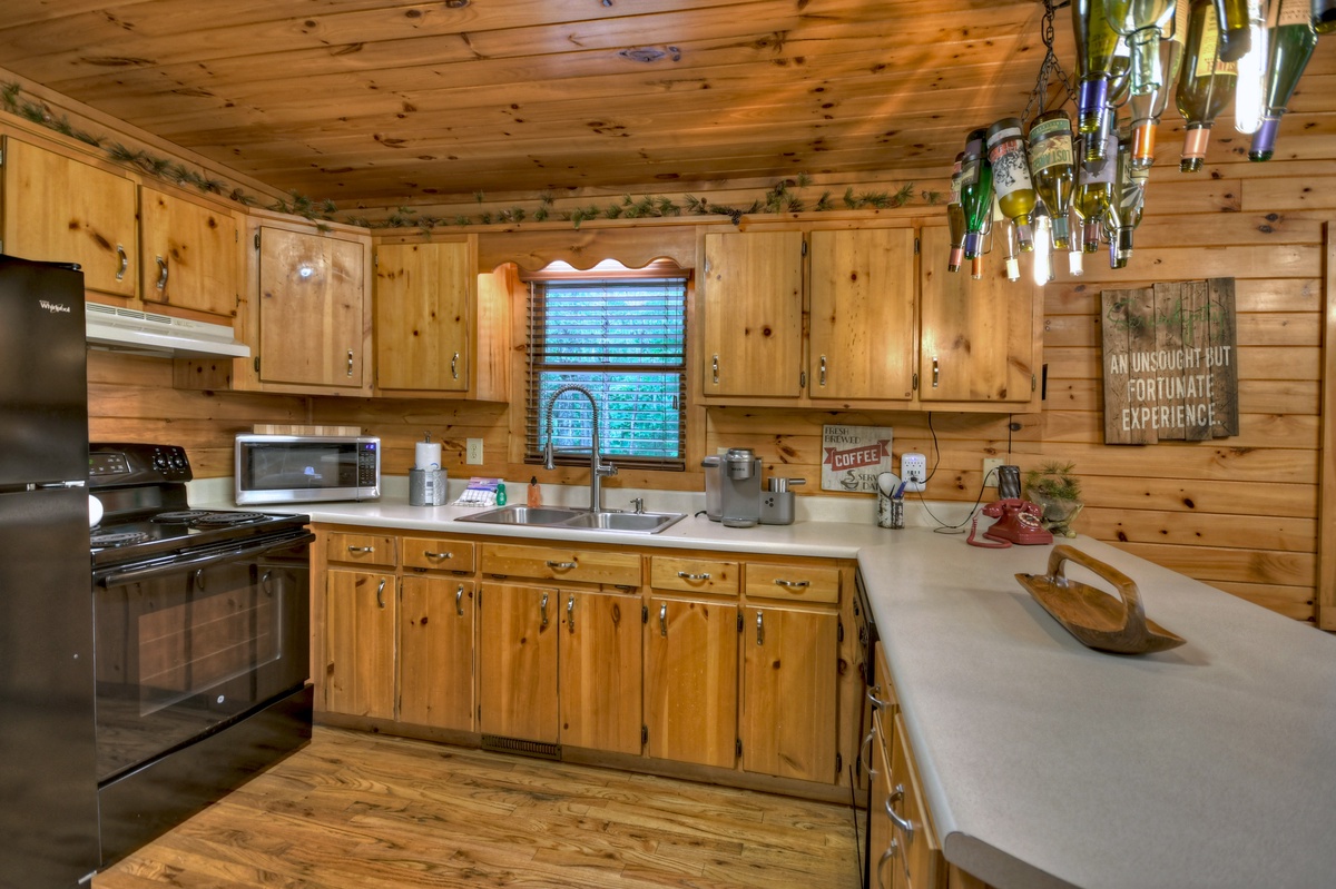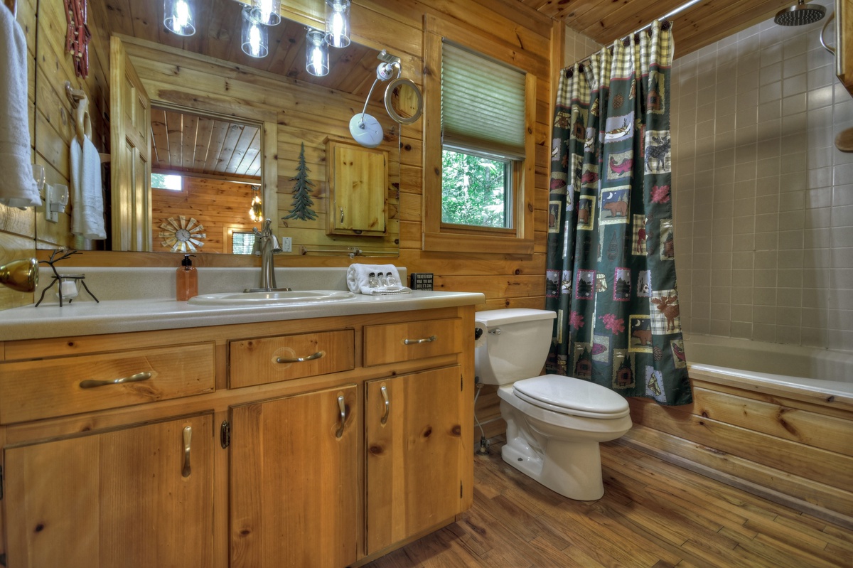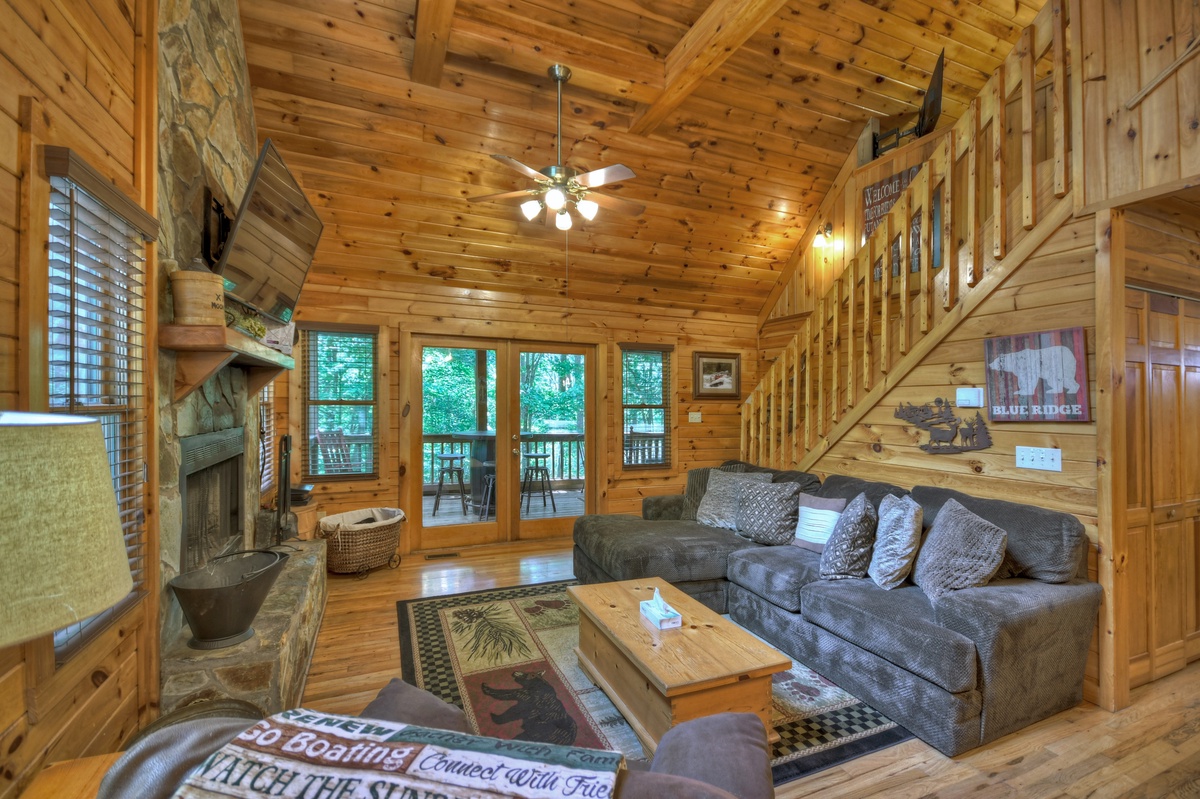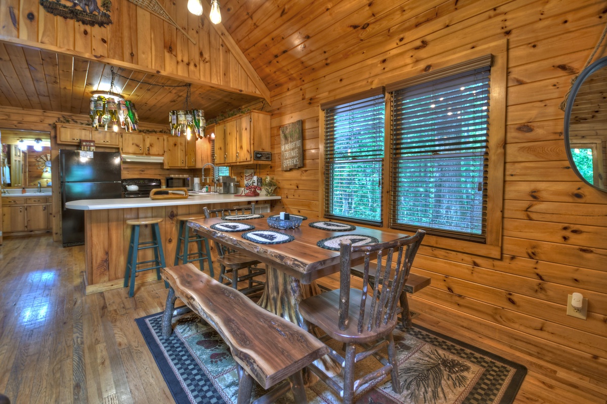 Perfect for a couples’ romantic getaway, family vacation or just to reconnect with friends. The log cabin style atmosphere has an open floor plan with a dining area for six guests and breakfast bar for three. Snuggle up on the sofa and catch up on your favorite Hallmark Movie on the 55” smart television over the woodburning fireplace. As you stroll through the fully stocked kitchen, you will find the King Master bedroom with log furniture and a large bathroom with a garden tub/shower combo. Up the stairs, two comfortable queen beds await your tranquil stay in an open loft setting overlooking activities below.