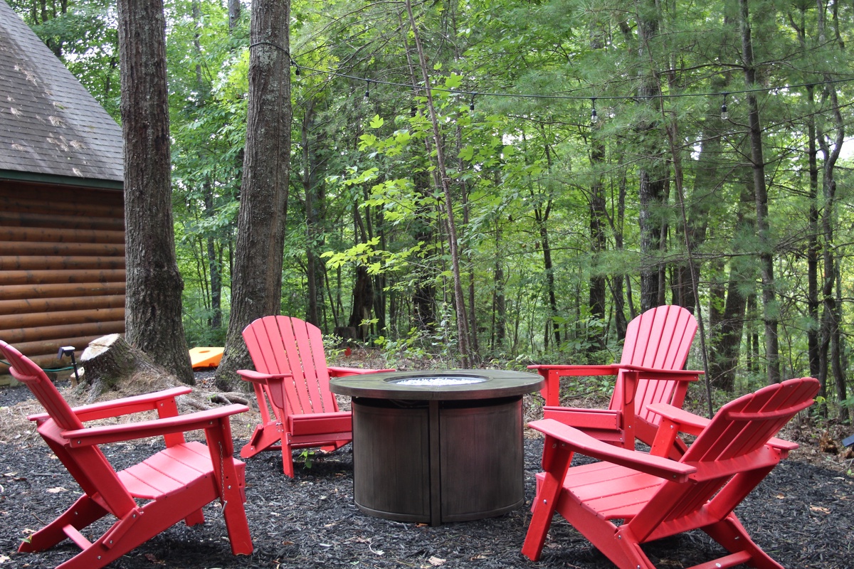 A new outdoor entertainment area with corn hole, a gas grill, a propane firepit with adirondack chairs seating and string lighting is at your desposal anytime of day or evening. In case you are wondering, the Sasquatch is only there for your protection from the lions, tiger and bears - Oh my!