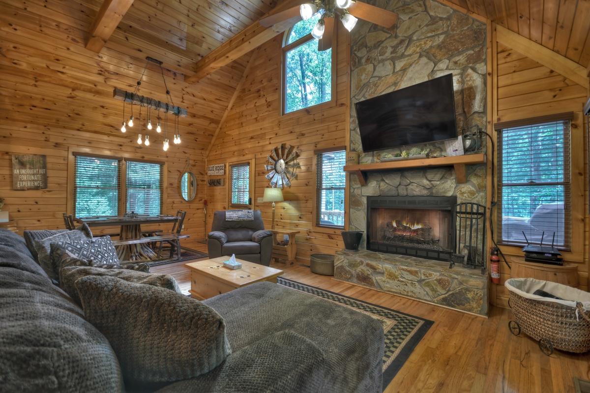 - Living Room with Wood Fireplace and 55" Flat Panel Smart TV with DVD