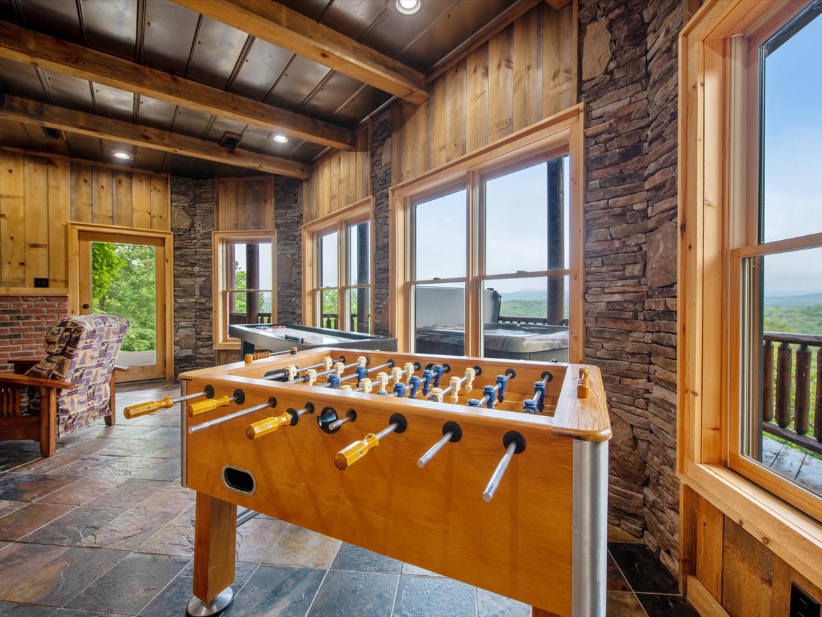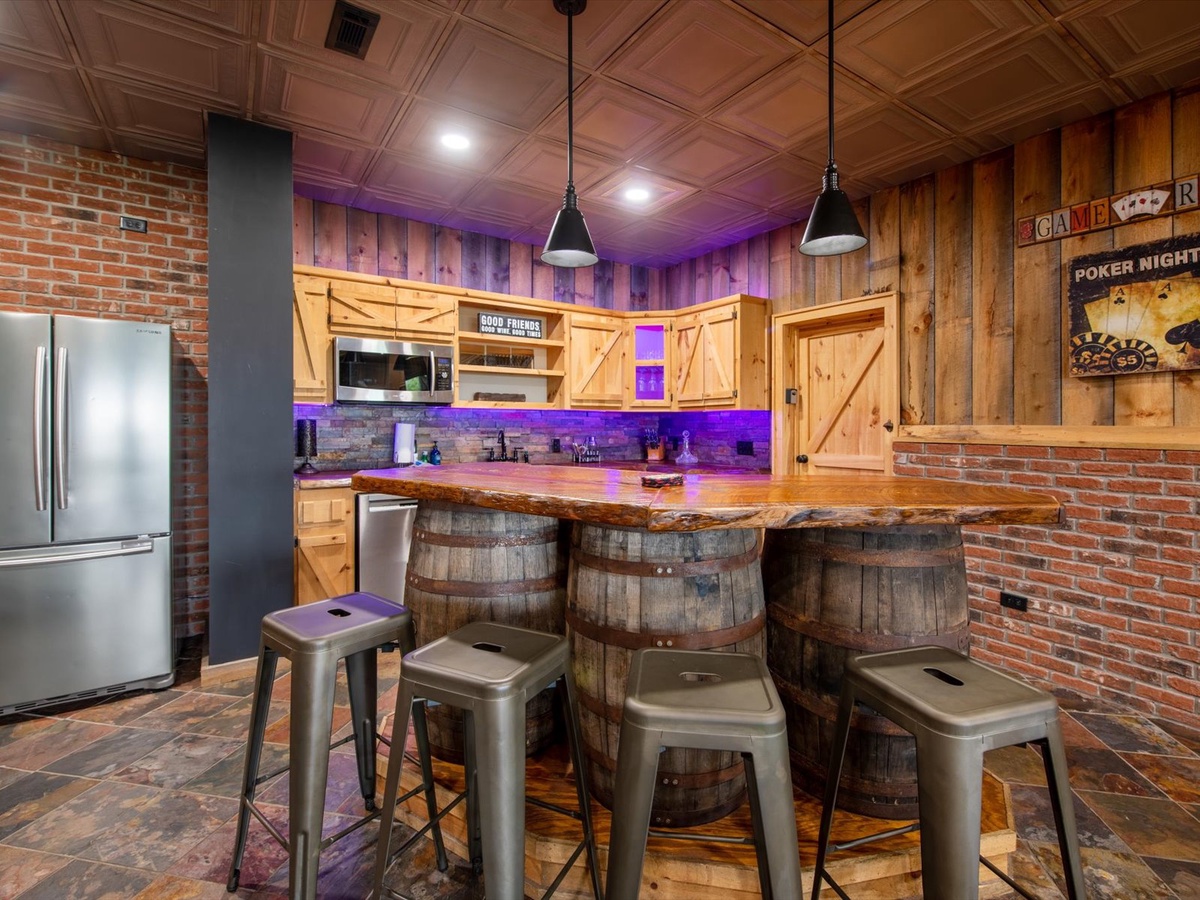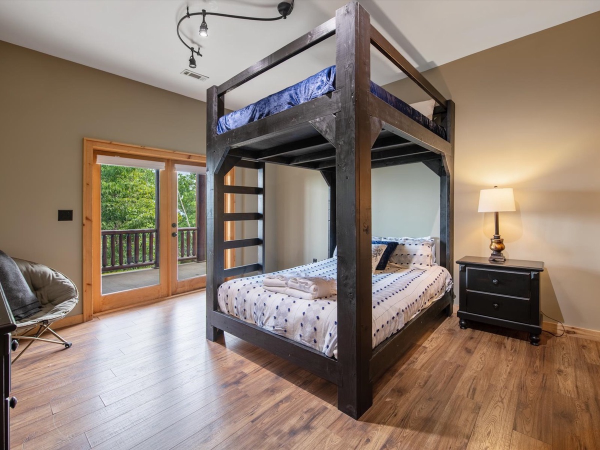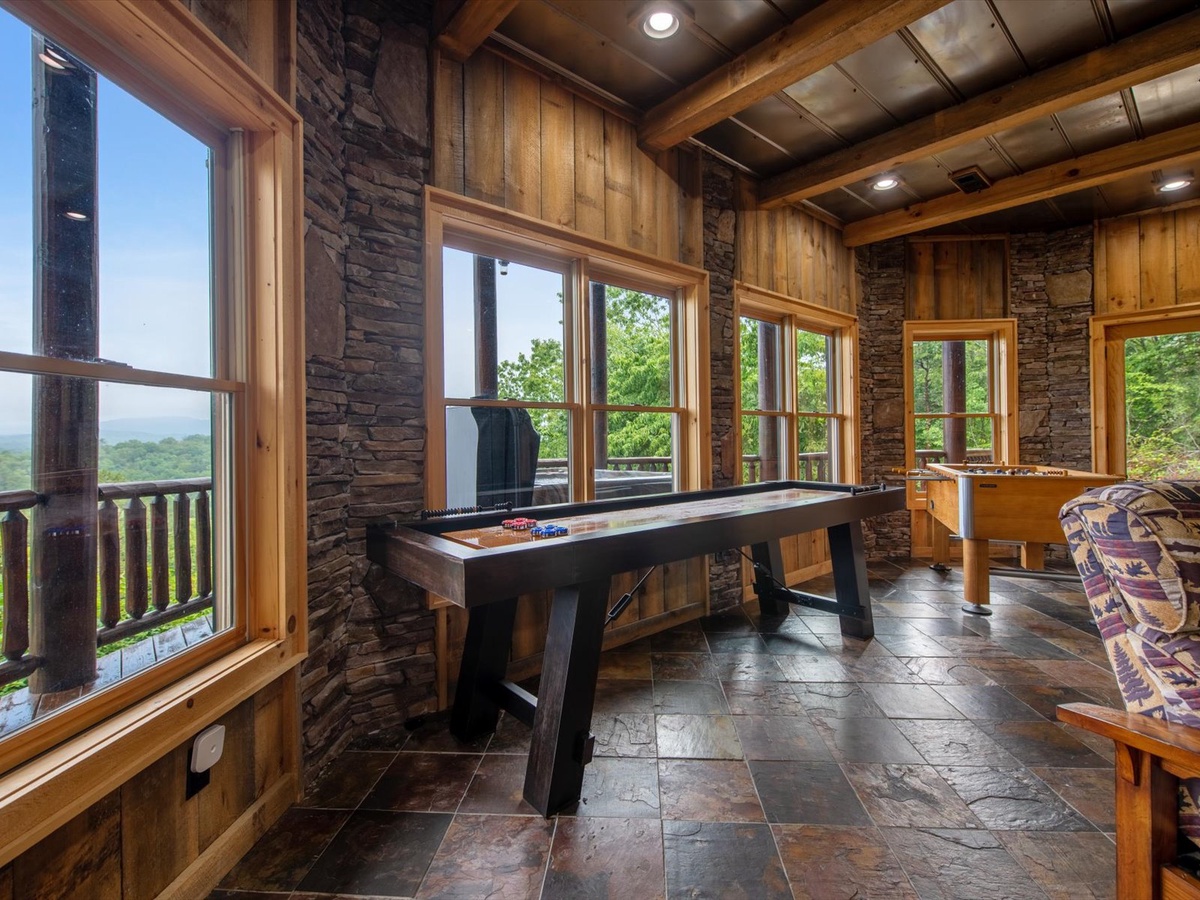 Enter the lower level to experience a den which is uniquely designed and decorated for your enjoyment. This space offers a perfect venue for socializing or watching the game, with its two 60" flat screen TVs and wet bar with everything you could need for a great get together. For your pleasure you will find a poker designed card table, Golden Tee arcade, foosball, shuffleboard, dart board and a whiskey barrel cocktail table that is easily converted to a black-jack table. The lower level also offers two more bedrooms; one bedroom has a queen size bed and the other a queen over queen bunkbed, each with their own deck entrance and private bathrooms with tile showers.