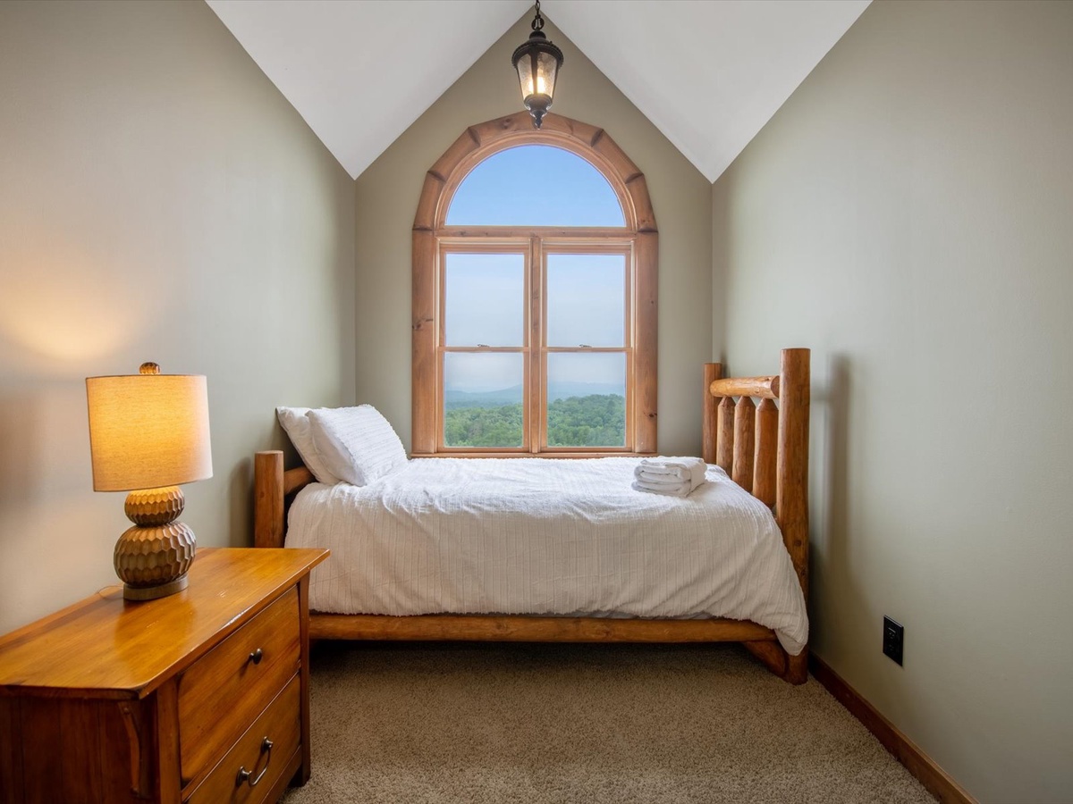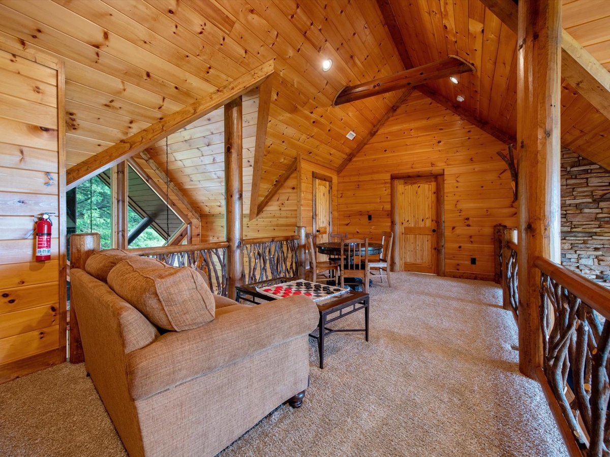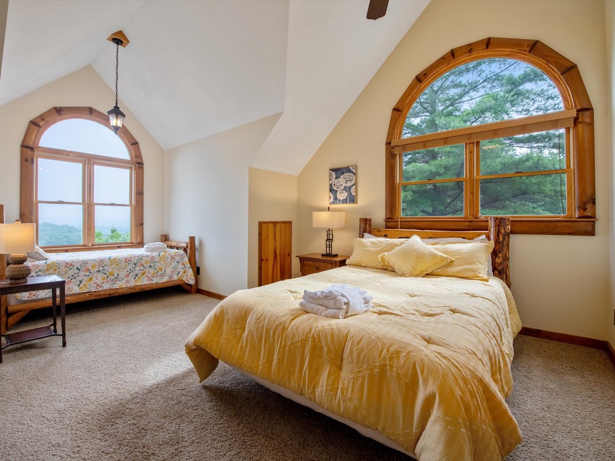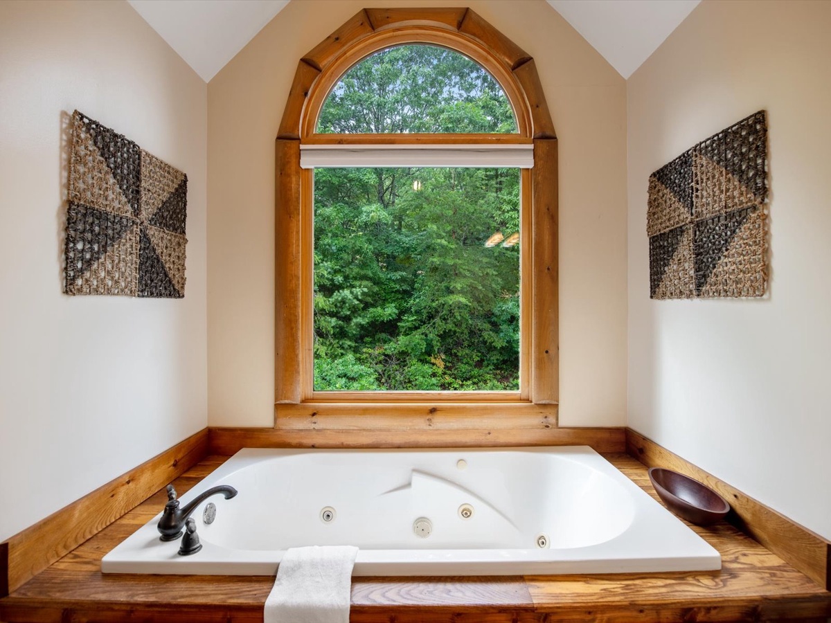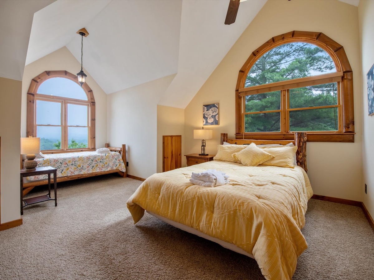 Upstairs in the carpeted loft you’ll find a lovely engraved card table for the kids to enjoy. Off the loft are two queen bedrooms with twin bed, private bathroom containing jetted tub and tile shower. Each bedroom has charming windows which provide abundant light and views. Each bathtub also has windows from which you can enjoy lovely mountain views.