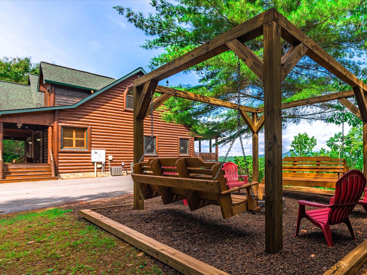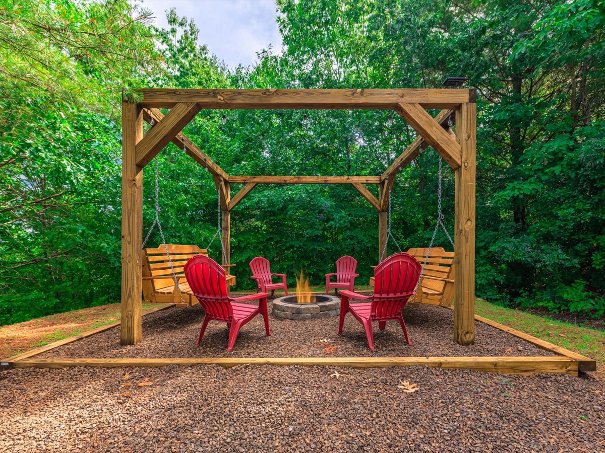 - Newly constructed fire pit with 2 swinging benches seating 2-3 each and 4 chairs