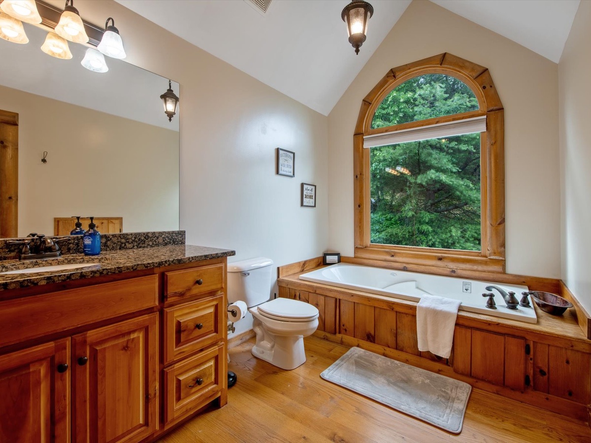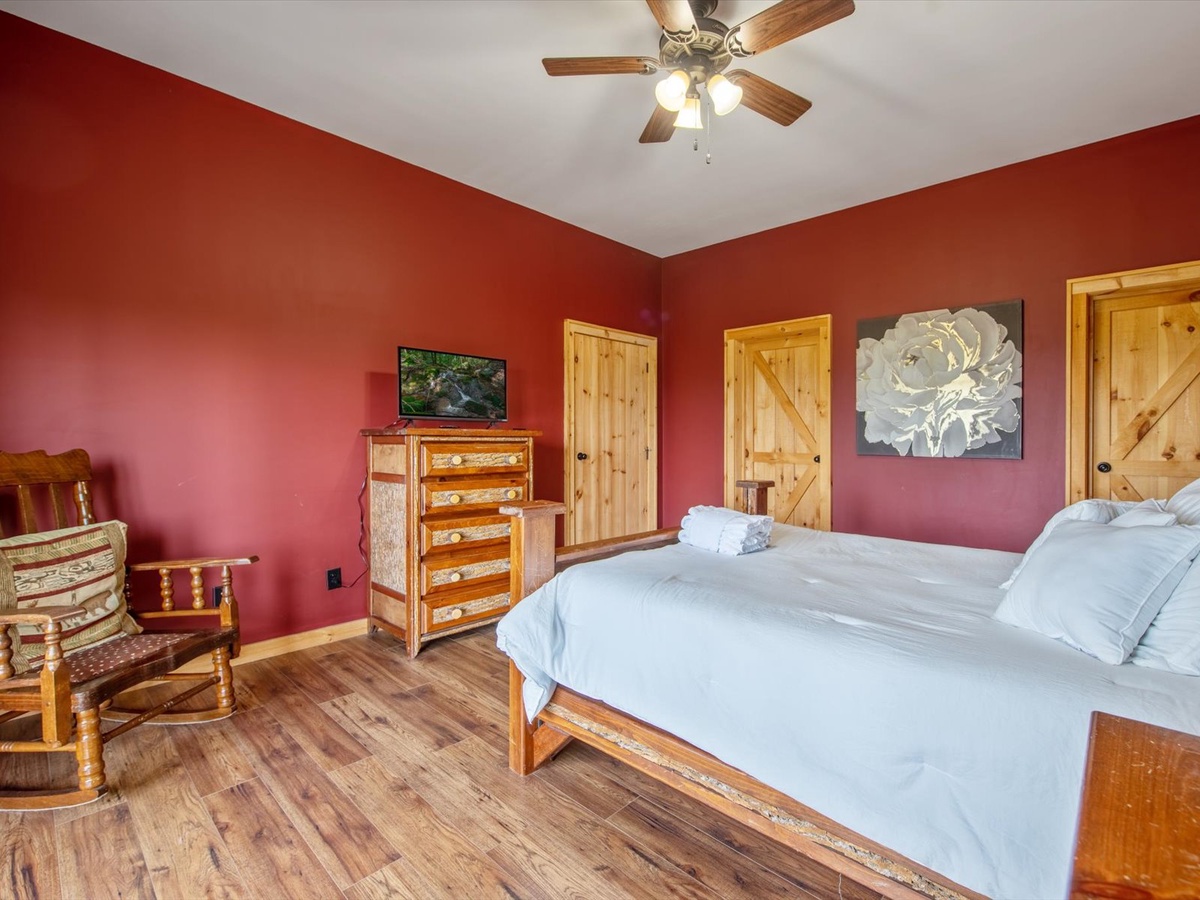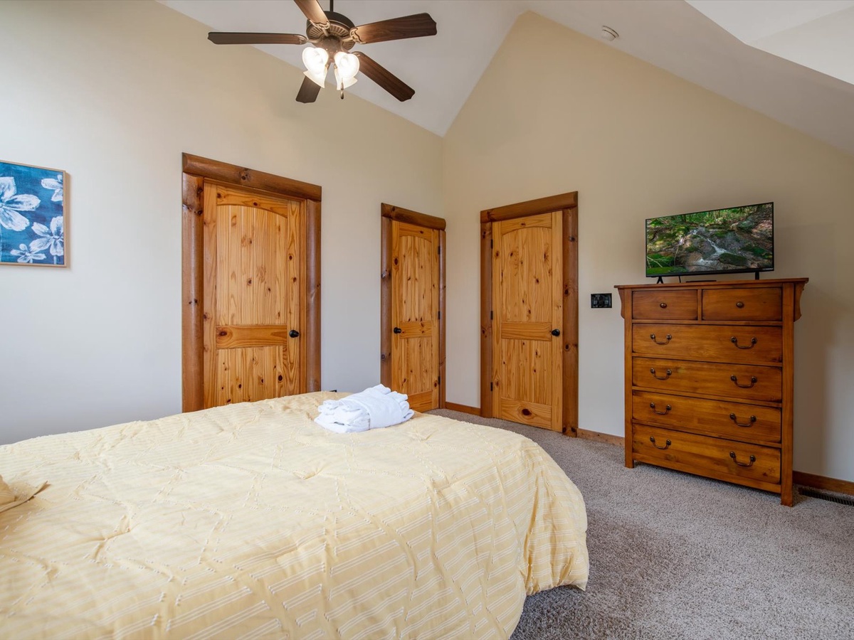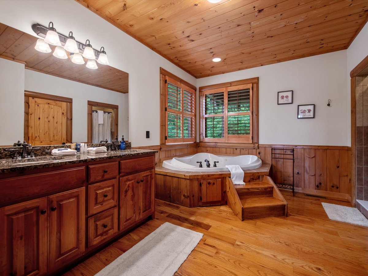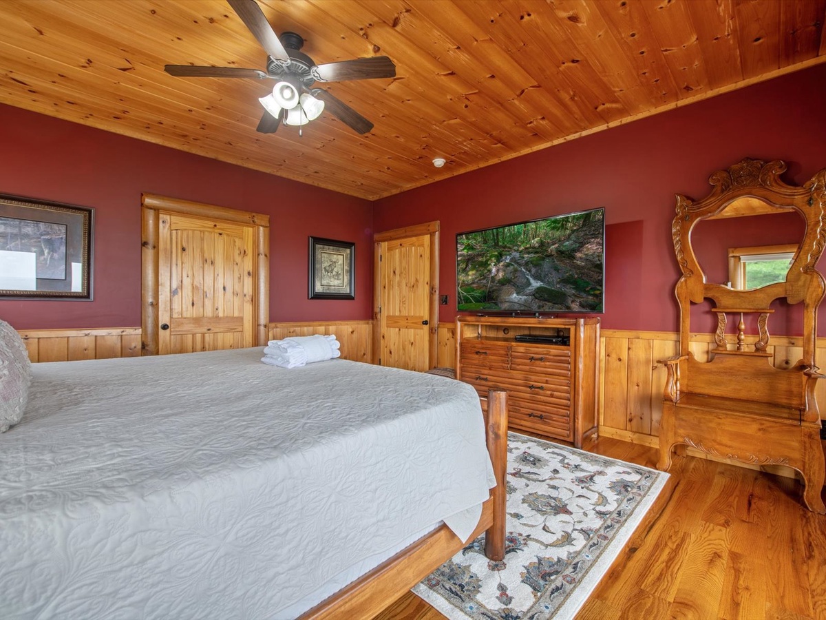 - Main level King Master bedroom with 42" flat panel TV, private bathroom with jetted tub and tile shower.