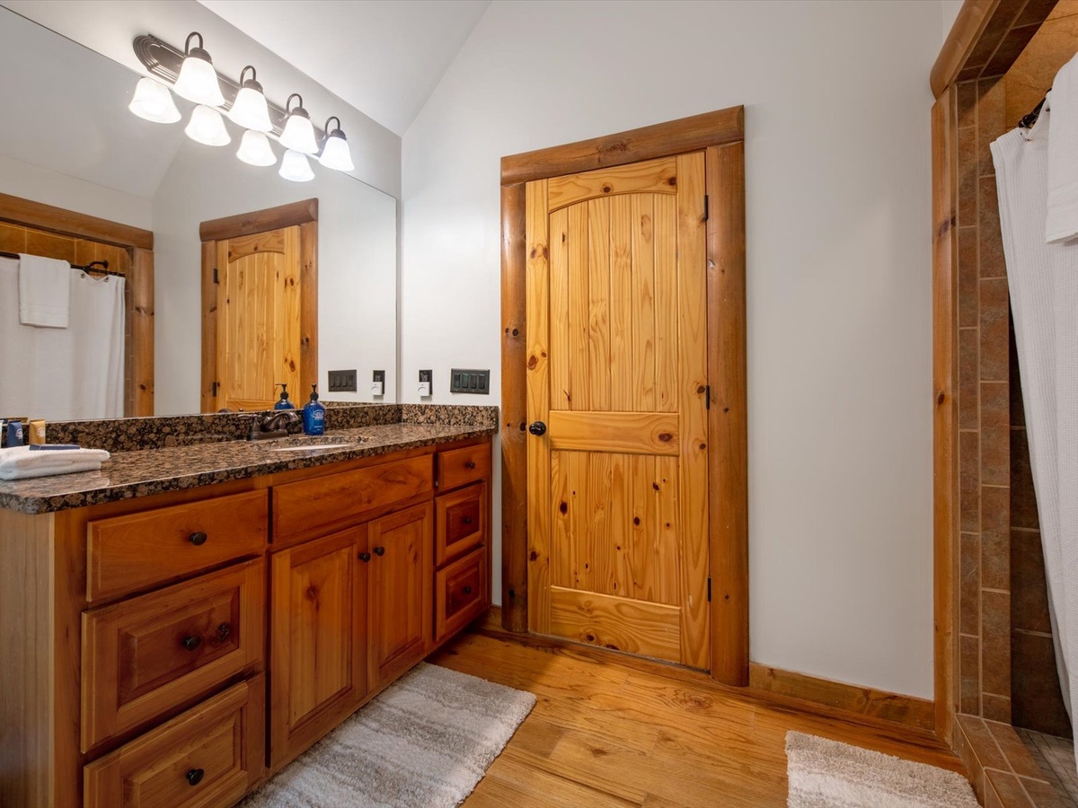 The main level offers a fully equipped, spacious kitchen with granite countertops and stainless-steel appliances where you can prepare a home-cooked meal to enjoy in the dining area with family and friends. The great room is also something to "write home about" with its plush leather reclining sectional that provide an ideal sitting area where you can gather with friends and family to discuss your travels in front of the wood burning fireplace. The main level also offers a master king bedroom with a 42" flat panel TV, a private bathroom providing you with jetted tub and separate tile shower.