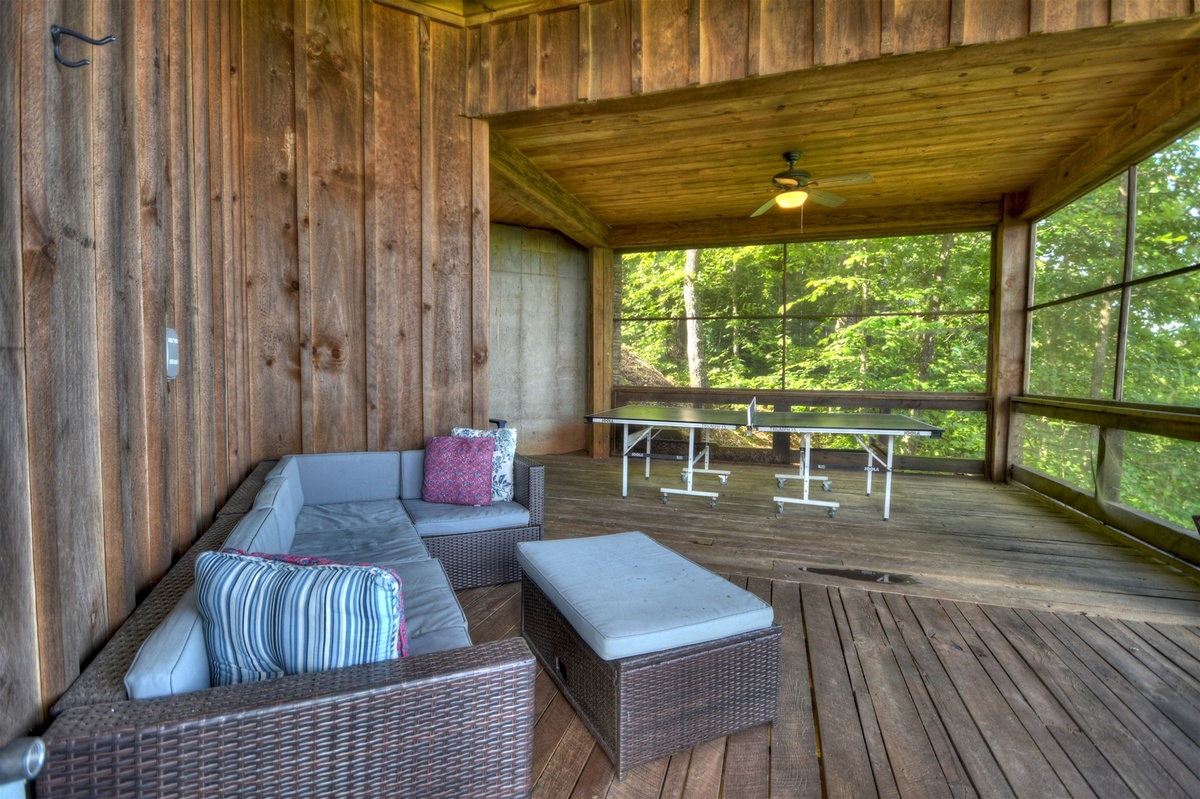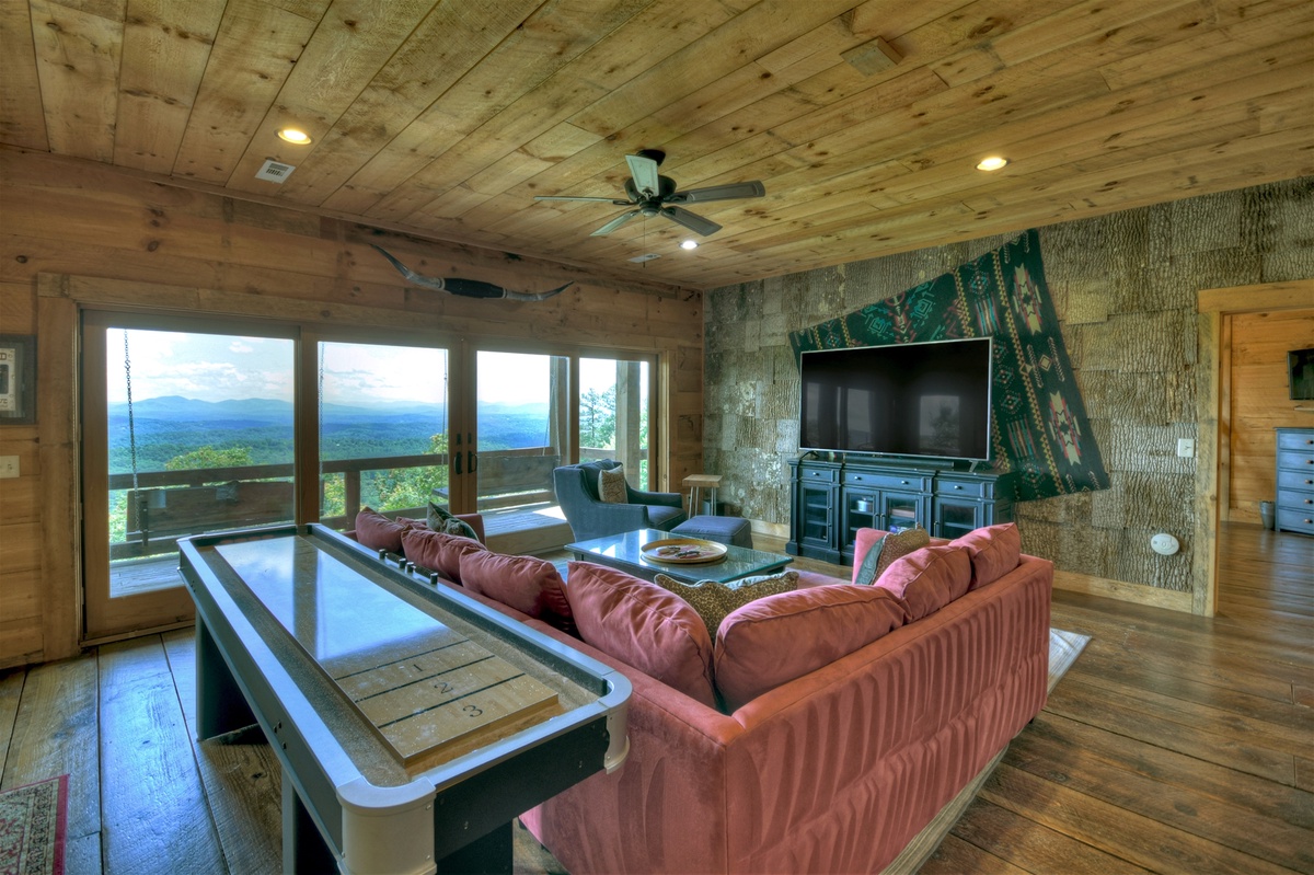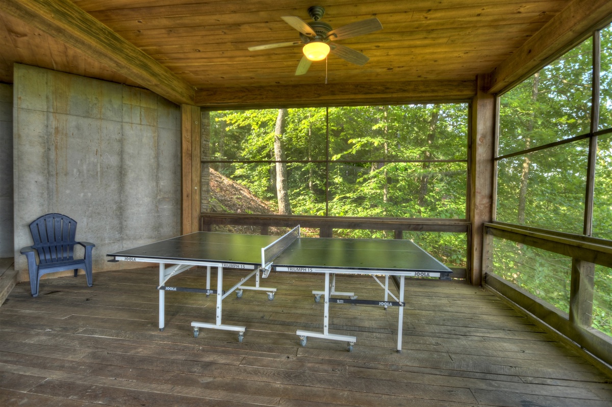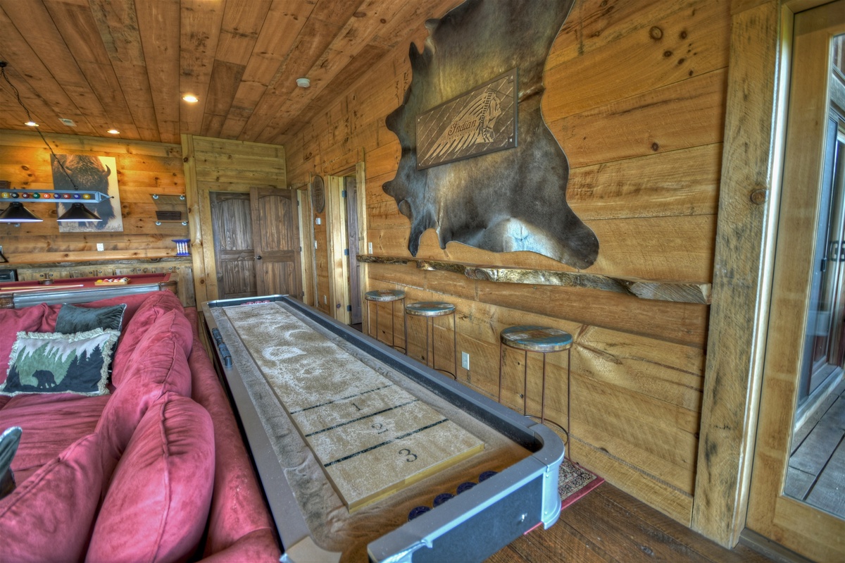 When it comes to entertainment, disappointment is not an option. The lower level game room/recreation room boasts a pool table, shuffleboard table, multi-game arcade, 75" Flat Panel TV, and wet bar. What else could you ask for? Ping Pong? That's just outside the door by the hot tub! Who wouldn't want to enjoy a game of Ping Pong outside with the mountain air kissing your face! Of course, after a long da of living it up like the Kings and Queens that you are, a nice soak in the outdoor hot tub is a must. Or perhaps you'd like to roast a few marshmallows in the outdoor fireplace located on the entry-level deck. Either way, there's a mountain range there for you to feast your eyes upon.