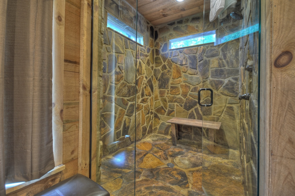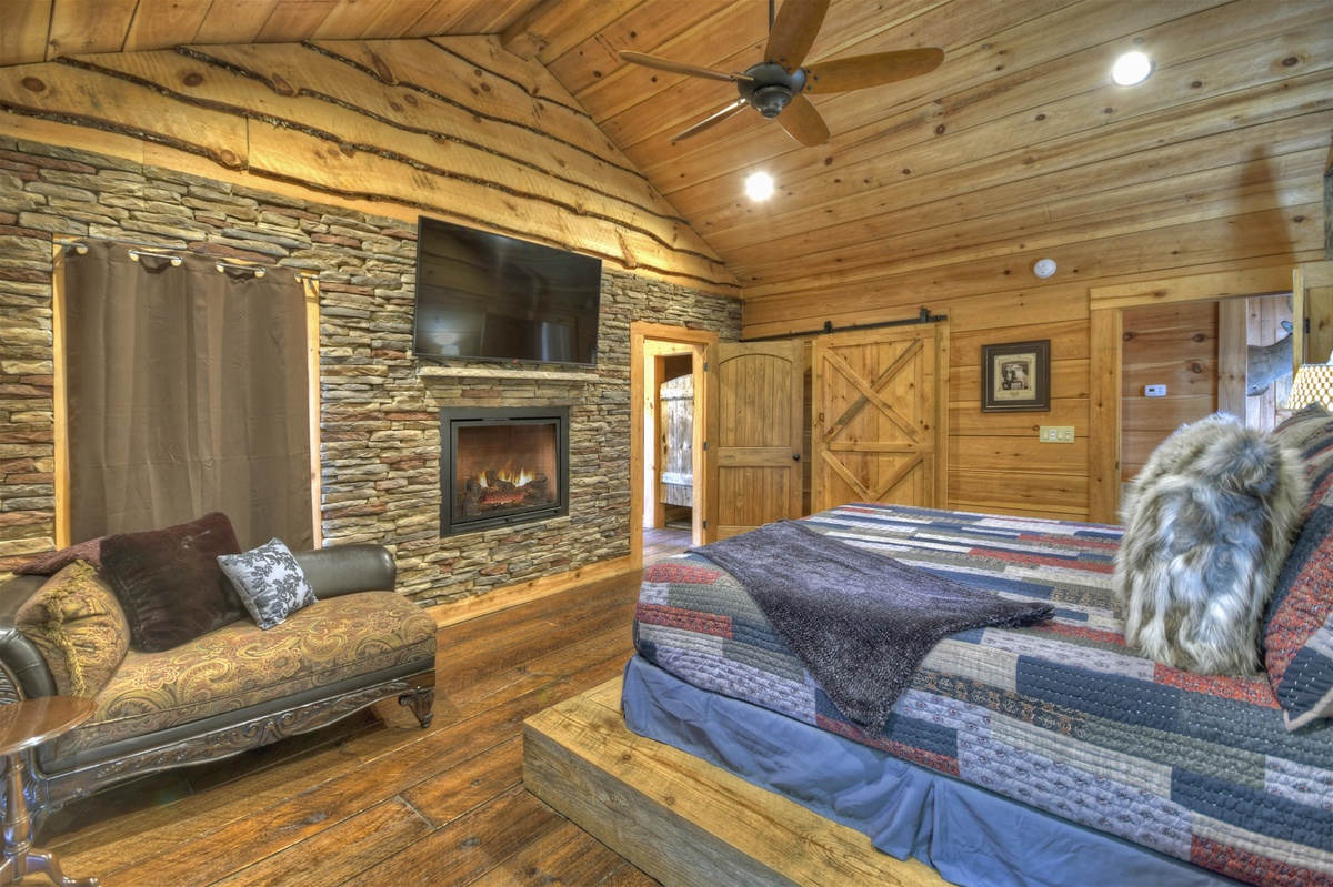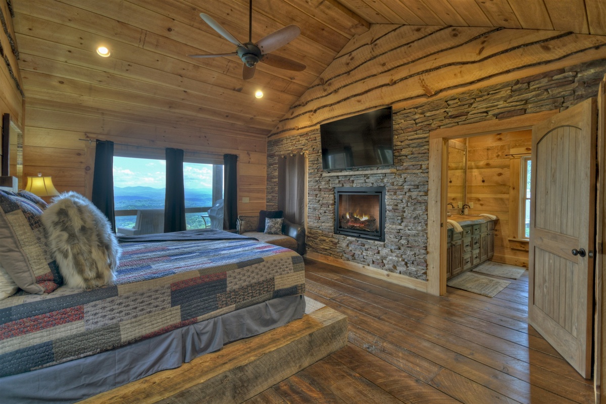 - Master king bedroom with 65” flat panel TV, gas fireplace, and attached bathroom with hand-crafted Stone Shower (dual shower with rain and standard shower heads), double vanity, large closet, and deck access