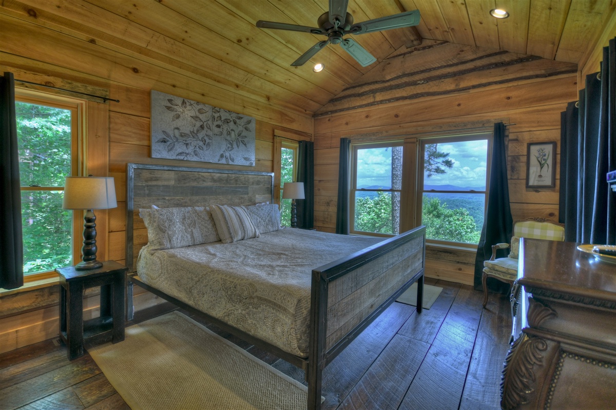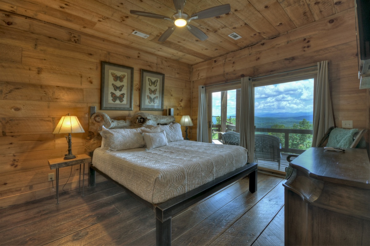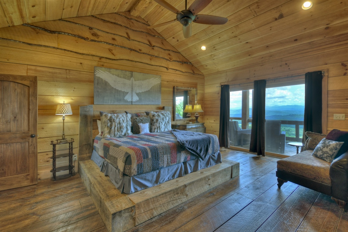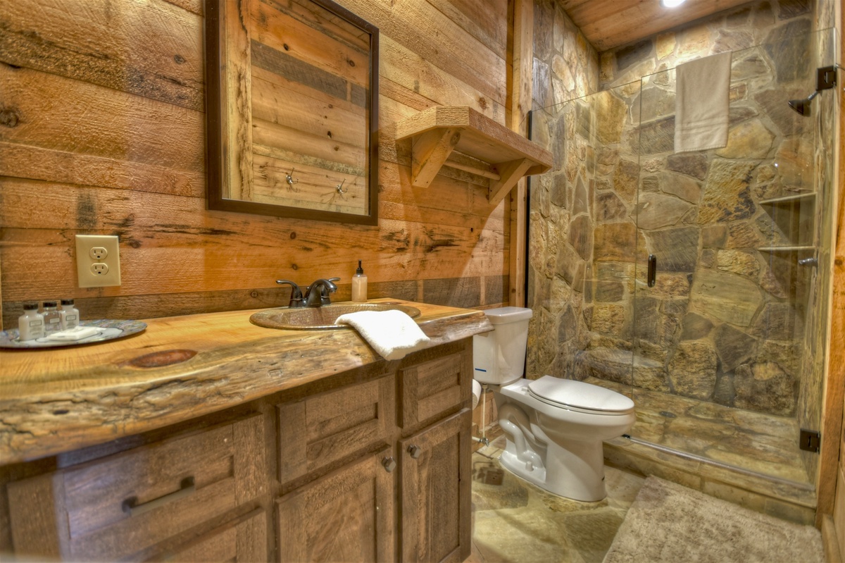 - Master king bedroom with 65” flat panel TV, gas fireplace, and attached bathroom with hand-crafted Stone Shower (dual shower with rain and standard shower heads), double vanity, large closet, and deck access