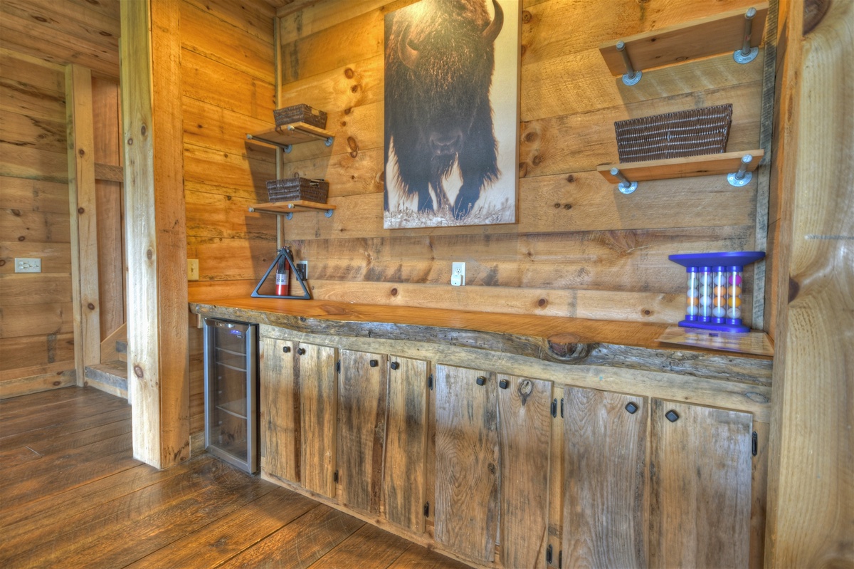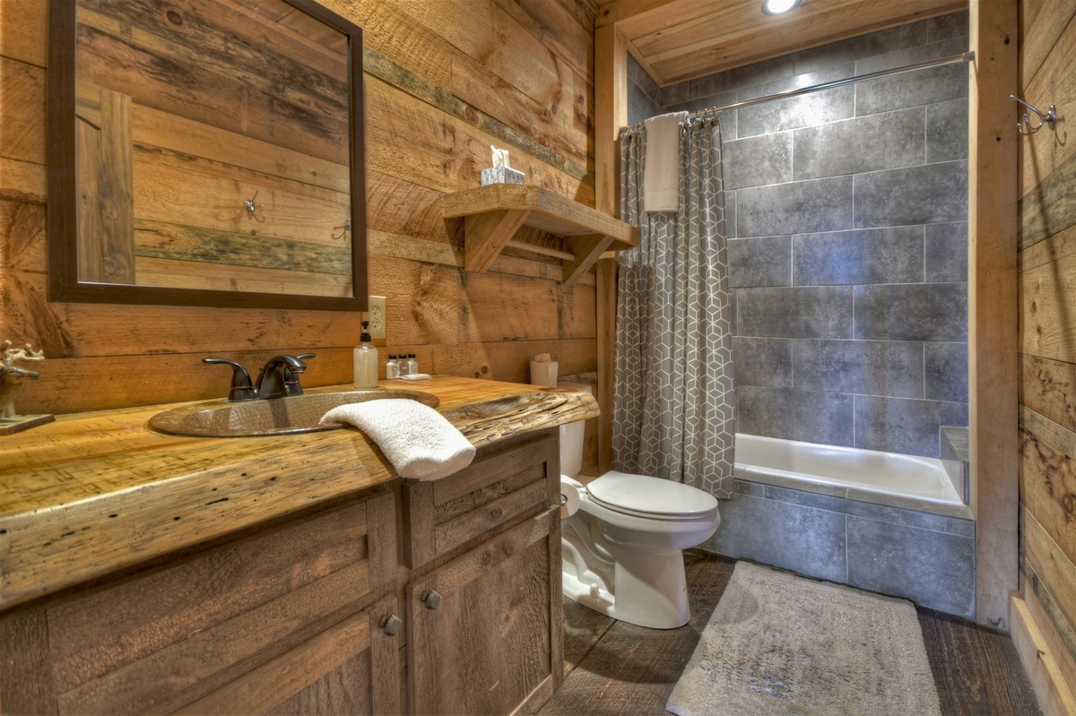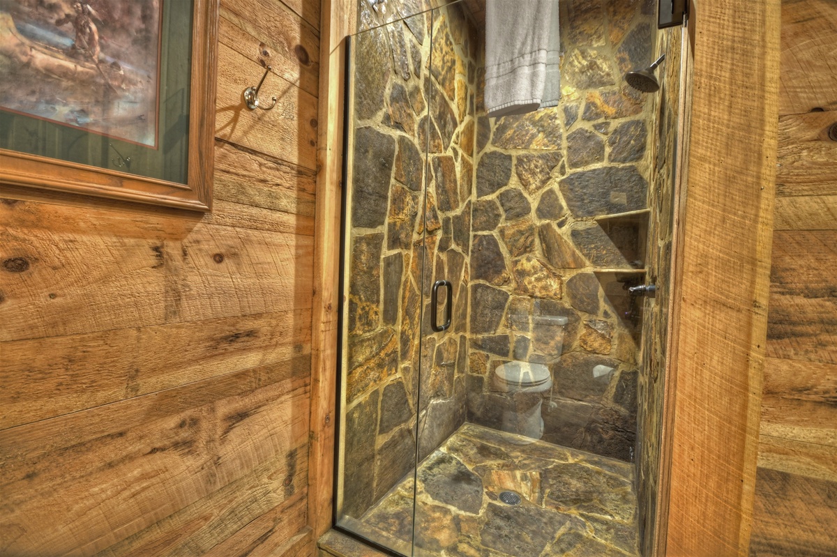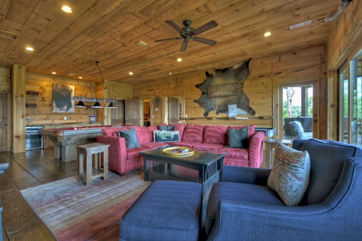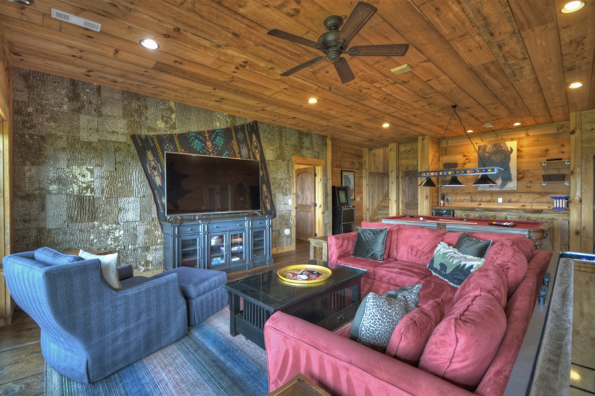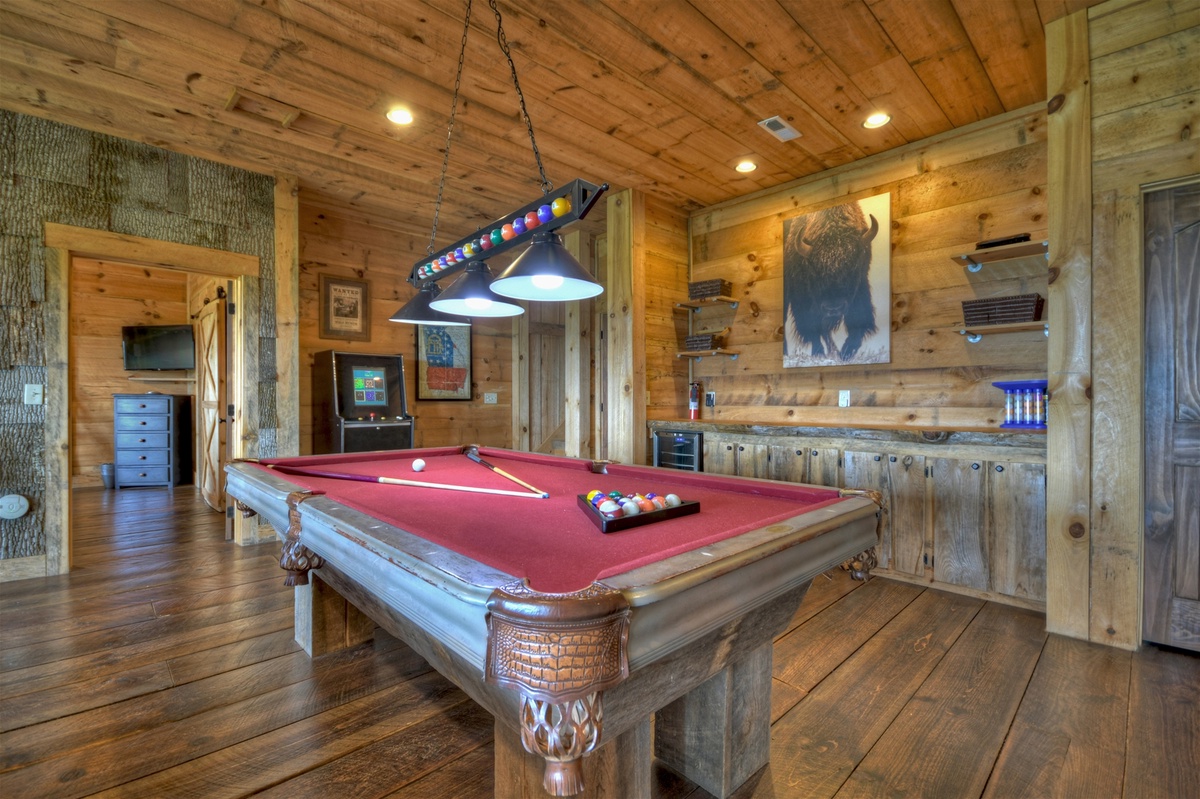 The lower level of this extraordinary abode is just as incredible and truly awesome as the entry level. Boasting two more bedrooms, it's safe to say that everyone will feel like royalty in their own space. Lower level bedroom #1 offers a King Bed and a set of built into the wall twin bunks; perfect for a small family with children. This bedroom wouldn't be complete without a 43" Flat Panel TV and it's own en suite bathroom with a walk-in stone shower. Stroll across the recreation area (we'll come back to that) and into Lower Level Bedroom #2 equipped with a King bed and a 43" Flat Panel TV. Let's not forget the attached bathroom with another beautifully crafted walk-in stone shower.