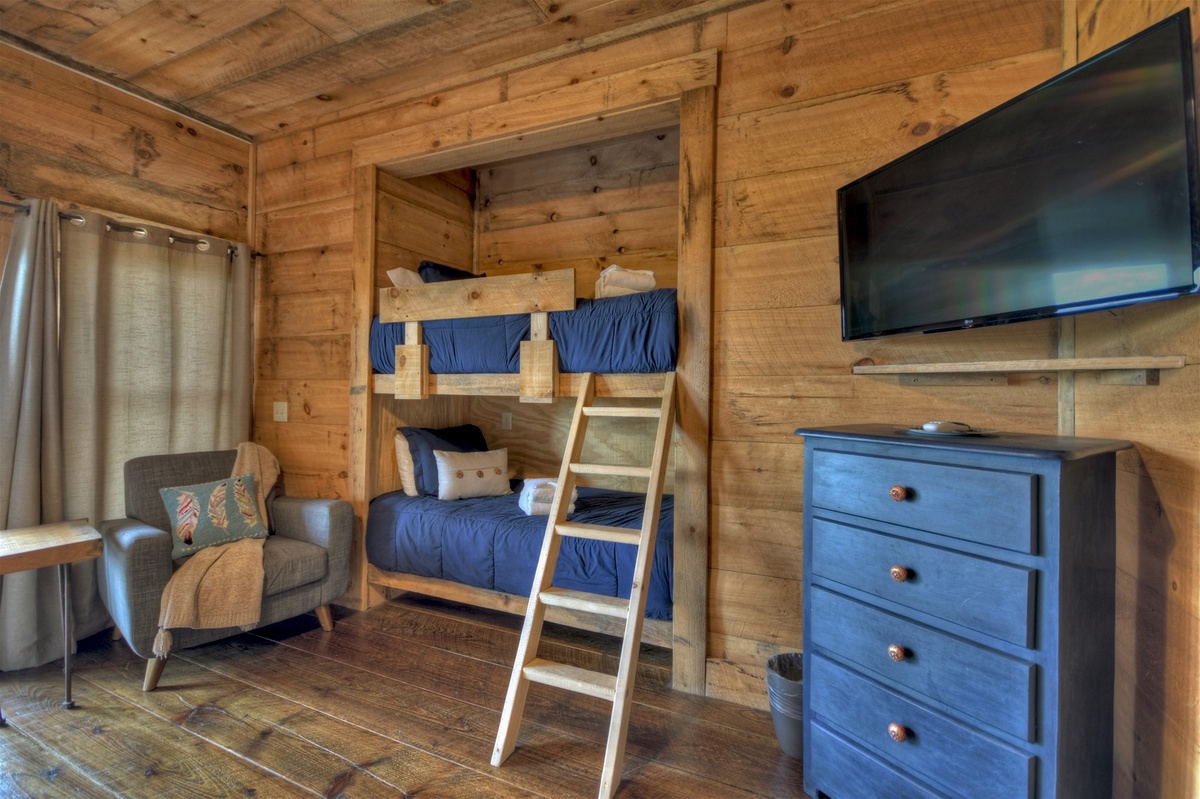 - Bedroom 1: King bed plus two built-in twin bunks, 43" flat panel TV and a private bathroom with walk-in stone shower and a large walk-in closet