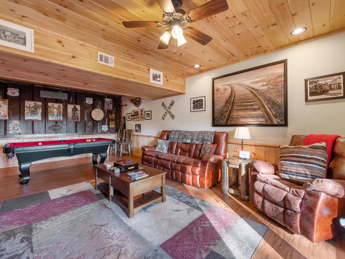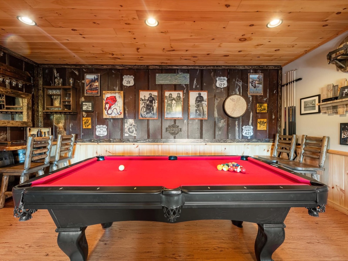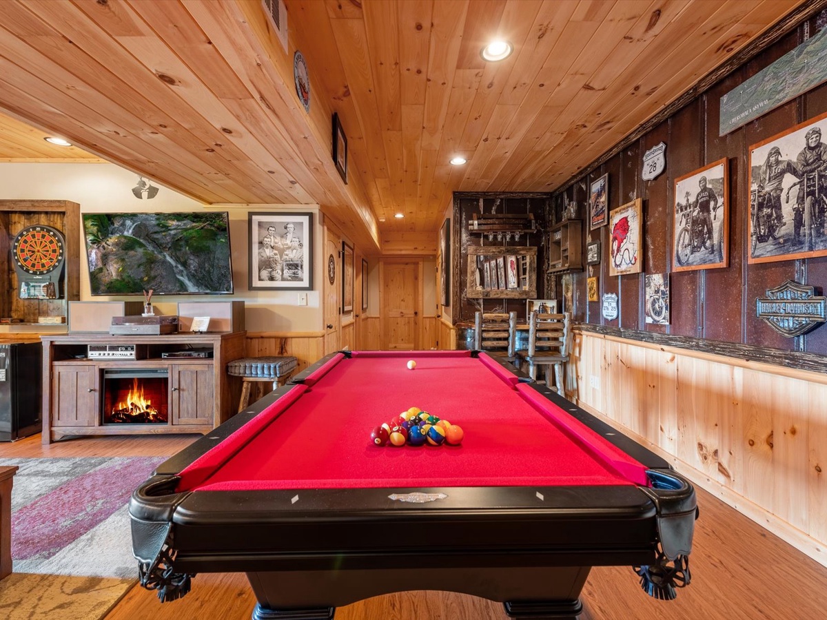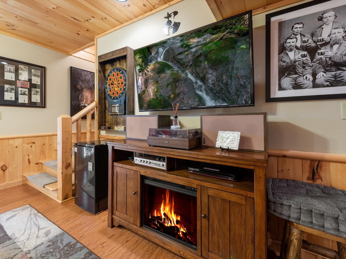 The lower level features a living room with comfortable leather furniture, a 55” TV, pool table, electric dart board, impressive vinyl collection and record player, mini bar, electric fireplace, bedroom with 2 queen size beds with a 40” TV and a shared full bathroom.