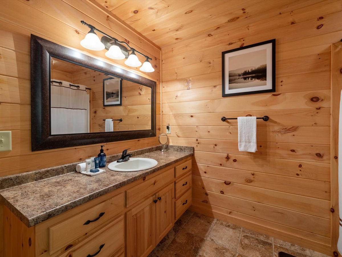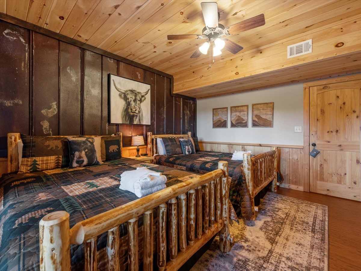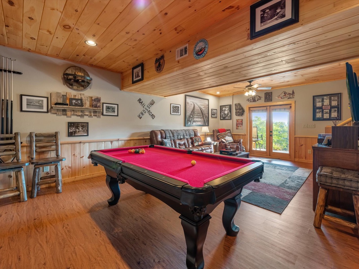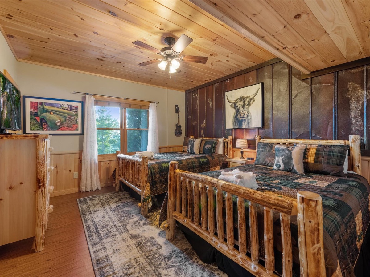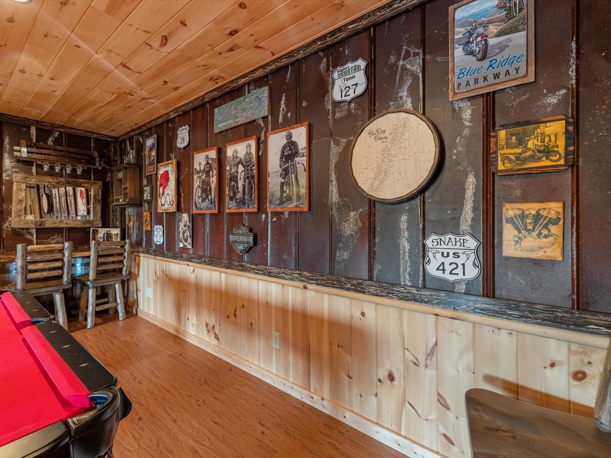 The lower level features a living room with comfortable leather furniture, a 55” TV, pool table, electric dart board, impressive vinyl collection and record player, mini bar, electric fireplace, bedroom with 2 queen size beds with a 40” TV and a shared full bathroom.